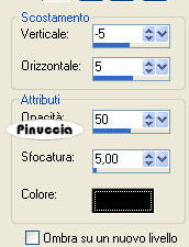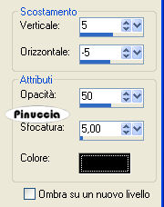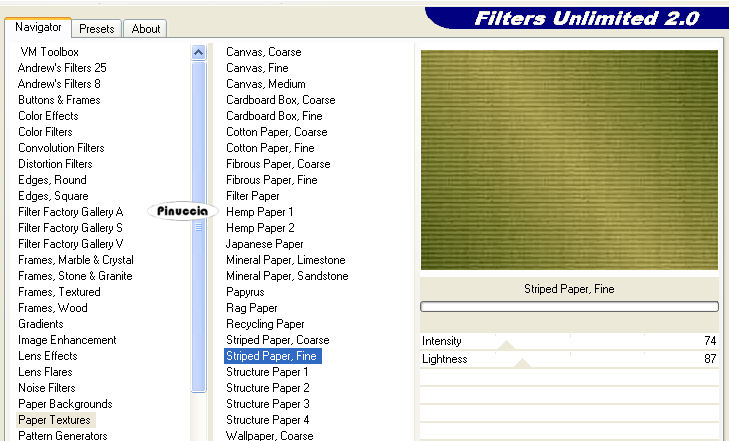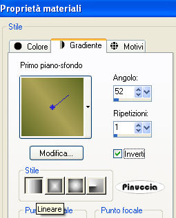 qui puoi trovare qualche risposta ai tuoi dubbi. Se l'argomento che ti interessa non è presente, ti prego di segnalarmelo. Occorrente: Materiale qui Filtri: Graphics Plus qui Andrews Filters 8 qui Filters Unlimited 2.0 qui Xero qui 1. Apri una nuova immagine trasparente 700 x 450 pixels. Imposta il colore di primo piano con #aca255, e il colore di sfondo con #5d6823. Passa il colore di primo piano a Gradiente di primo piano/sfondo, con i seguenti settaggi: ![]() 2. Apri il tube Jennifer e vai a Modifica>copia. Torna al tuo lavoro e vai a Modifica>Incolla>Incolla come nuovo livello. Immagine>Ridimensiona, al 70%, ricampionamento bicubica, tutti i livelli non selezionato. ![]() Sposta il tube sul lato destro dell'immagine.![]() Cambia la modalità di miscelatura di questo livello in Moltiplica. 3. Attiva nella paletta dei livelli il livello inferiore. Selezione>Seleziona tutto. Livelli>Nuovo livello raster. Apri il tube dei Tulipani e vai a Modifica>Copia. Torna al tuo lavoro e vai a Modifica>Incolla>Incolla nella selezione. Cambia la modalità di miscelatura di questo livello in Moltiplica. Selezione>Nessuna selezione. ![]() 4. Attiva lo strumento Gomma ,e cancella i segni del tube dei tulipani dal viso e dal corpo di Jennifer. ![]() 5. Attiva lo strumento Selezione , rettangolo,e traccia un rettangolo sul lato sinistro dell'immagine. ![]() Livelli>Nuovo livello raster. Riempi con il gradiente.Mantieni selezionato. Effetti>Plugins>Filters Unlimited - Paper Textures - Striped Paper Fine, con i settaggi standard. ![]() 6. Copia nuovamente il tube dei Tulipani e vai a Modifica>Incolla nella selezione. Mantieni selezionato. 7. Livelli>Nuovo livello raster. Apri il motivo oro che hai trovato con il materiale e minimizzalo nella tua area di lavoro. Imposta il colore di primo piano su Motivi e cercalo nella lista dei motivi disponibili. ![]() Riempi il livello con il motivo oro.Selezione>modifica>Contrai, di 4 pixels. Premi sulla tastiera il tasto canc ![]() Selezione>Inverti. Selezione>mobile. Selezione>Immobilizza. Effetti>Plugins>Graphics Plus - Cross Shadow, con i settaggi standard. ![]() Ripeti l'Effetto Cross Shadow. 8. Effetti>Effetti 3D>sfalsa ombra: ![]() Ripeti l'Effetto Sfalsa ombra, ma invertendo i valori verticale e orizzontale. Selezione>Nessuna selezione. Assicurati di essere posizionato sul livello superiore. Livelli>Unisci>Unisci giù. 9. Livelli>Duplica. Immagine>Ridimensiona, all'80%, bicubica, tutti i livelli non selezionato. ![]() Sposta il livello duplicato un po' più a destra.![]() 10. Livelli>Unisci>Unisci visibile. ![]() 11. Attiva nuovamente lo strumento Selezione ,e traccia un altro rettangolo sotto l'immagine dei tulipani. Livelli>Nuovo livello raster. Riempi con il gradiente.Effetti>Plugins>Filters Unlimited - Lens Effekt - Fisheye Tiler: ![]() 12. Selezione>Modifica>Contrai, di 4 pixels. inverti. Selezione>Mobile. Selezione>immobilizza. Livelli>Nuovo livello raster. Riempi la selezione con il motivo oro.Effetti>Plugins>Graphics Plus - Cross Shadow, con i settaggi standard, 2 volte. 13. Selezione>Nessuna selezione. Abbassa l'opacità di questo livello (filtro Fisheye Tiler) al 74%. Rimani sul livello con il bordo e ripeti l'Effetto Sfalsa ombra con i settaggi usati per l'immagine dei tulipani. 15. Attiva lo strumento Testo .Imposta il colore di sfondo con il motivo oro e chiudi il colore di primo piano. Seleziona il font - io ho scelto Schrift CommercialScript BT - crea come vettore, dimensione 55, e scrivi il testo nella striscia con l'Effetto Fisheye Tiler. Effetti>Plugins>Graphics Plus>Cross Shadow, con i settaggi standard. Effetti>Effetti 3D>Sfalsa ombra: ![]() Ripeti l'Effetto Sfalsa ombra. 16. Livelli>Unisci>Unisci tutto. 17. Immagine>Aggiungi bordatura, 3 pixels, simmetriche, con il colore bianco. Seleziona il bordo con la bacchetta magica ,e riempilo con il motivo oro.Effetti>Plugins>Graphics Plus - Cross Shadow, con i settaggi standard, 2 volte. Effetti>Effetti 3D>sfalsa ombra, con i settaggi del passo 5. 18. Immagine>Aggiungi bordatura, simmetriche non selezionato, con il colore bianco. ![]() Seleziona il bordo con la bacchetta magica ![]() e riempilo con il gradiente.Effetti>Plugins>Andrew's 8 - Tow the line, con i settaggi standard. ![]() 19. Mantieni selezionato. Livelli>Nuovo livello raster. Riempi con il motivo oro.Selezione>Modifica>Contrai, di 4 pixels. Premi sulla tastiera il tasto canc ![]() Selezione>Inverti. Effetti>Plugins>Graphics Plus - Cross Shadow, con i settaggi standard, 2 volte. Effetti>Effetti 3D>Sfalsa ombra, con i settaggi usati al punto 8. 20. Attiva lo strumento Testo , io ho usato il font Night Sky, regola la dimensione a seconda della lunghezza del testo.Imposta il colore di sfondo sul motivo oro e chiudi il colore di primo piano. Scrivi il tuo nome. Immagine>Ruota>Ruota per gradi, 90 gradi a sinistra. ![]() Sposta il testo sulla striscia a sinistra. Livelli>Converti in livello raster. Effetti>Plugins>Graphics Plus - Cross Shadow, 2 volte, con i settaggi standard. Effetti>Effetti 3D>Sfalsa ombra, con i settaggi usati al punto 15. Ripeti l'Effetto Sfalsa ombra. Livelli>Unisci>Unisci tutto. 21. Effetti>Plugins>Xero - Porcelain: ![]() 22. Non dimenticare il tuo watermark. 23. Immagine>Ridimensiona, a 600 pixels, di larghezza. Salva in formato jpg. ![]() Se hai problemi o dubbi, o trovi un link non funzionante, o anche soltanto per un saluto, scrivimi. 25 Aprile 2007 |
