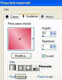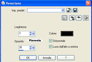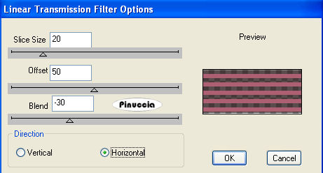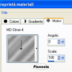 qui puoi trovare qualche risposta ai tuoi dubbi. Se l'argomento che ti interessa non è presente, ti prego di segnalarmelo. Occorrente: Materiale qui Filtri: Graphics Plus qui Andrews Filters 8 qui I filtri Andrew's, per essere utilizzati, devono prima essere convertiti. come fare vedi qui. Possono essere usati da soli o importati nel filtro Unlimited 2.0. Come fare vedi qui Dsb Flux qui Fotomatic Skygrad qui 1. Apri una nuova immagine NERA 700 x 450 pixels. Apri il tube Pink_1. Immagine>Ridimensiona, a 500 pixels di altezza. Modifica>Copia. Torna alla tua immagine nera e vai a Modifica>Incolla>Incolla come nuovo livello. Sposta il tube sul lato destro della tua immagine.Regola>Messa a fuoco>Metti a fuoco. Effetti>Effetti 3D>Sfalsa ombra: ![]() ![]() 2. Nascondi il livello di Pink. Attiva il livello inferiore. Attiva lo strumento Selezione , rettangolo.Traccia un rettangolo di circa 2/3 dell'immagine partendo dall'alto. ![]() Livelli>Nuovo livello raster. Riempi con il colore #601426.Effetti>Plugins>Dsb Flux - Linear Transmission: ![]() Abbassa l'opacità di questo livello al 70%. 3. Effetti>Effetti di trama>Veneziana: ![]() Selezione>Nessuna selezione. Cambia la modalità di miscelatura di questo livello in Luminanza (esistente). ![]() non pensare di aver sbagliato perchè vedi le strisce scure. Alla fine, saranno come nell'esempio finale. 4. Apri il tube Pink Note_1 e vai a Modifica>Copia. Torna al tuo lavoro e vai a Modifica>Incolla>Incolla come nuovo livello. Immagine>Ridimensiona, all'80%, tutti i livelli non selezionato, ricampionamento bicubica. ![]() Effetti>Effetti 3D>Sfalsa ombra: ![]() Ripeti tutto il procedimento per il tube della Nota 2. 5. Duplica entrambi i livelli delle note e ridimensiona all'80%, bicubica, tutti i livelli non selezionato. Distribuisci le note sulle strisce con l'effetto Dsb. 6. Nascondi tutti i livelli tranne quelli delle note. Livelli>Unisci>Unisci visibile. Ridimensiona questo livello Uniti ancora una volta all'80%, tutti i livelli non selezionato. Livelli>Duplica. Immagine>Capovolgi. Sposta il livello duplicato in modo che sembri riflesso rispetto all'originale.Abbassa l'opacità di questo livello al 30%. ![]() 7. Imposta il colore di primo piano con #f5b6c2, e il colore di sfondo con #d63553. Passa il colore di sfondo a Gradiente di primo piano/sfondo, con i seguenti settaggi: ![]() Nascondi il colore di primo piano. Attiva lo strumento Testo , seleziona un font.Io ho scelto il font YoungStar, dimensione 40. Scrivi il testo sopra le note. Effetti>Effetti 3D>Sfalsa ombra, con gli stessi settaggi usati per le note. ![]() 8. Attiva lo strumento Selezione , rettangolo,e traccia una striscia sul lato sinistro. Livelli>Nuovo livello raster. Riempi con il gradiente.ricorda che il gradiente è impostato come colore di sfondo, quindi devi cliccare con il tasto destro del mouse Cambia i settaggi del gradiente, togliendo la spunta a Inverti. Livelli>Nuovo livello raster. Riempi il nuovo livello con il gradiente.Effetti>Plugins>Andrews Filter 8 - Tow the line, con i settaggi standard. ![]() Abbassa l'opacità di questo livello al 65%. 9. Mantieni selezionato. Selezione>modifica>Contrai, di 3 pixels. Selezione>inverti. Selezione>mobile. Selezione>immobilizza. Livelli>Nuovo livello raster. Apri il motivo argento che hai trovato nello zip e minimizzalo nella tua area di lavoro. Passa il colore di primo piano a Motivi e cercalo nella lista dei motivi disponibili. ![]() Riempi il nuovo livello con il motivo argento.Effetti>Plugins>Graphics Plus - Cross Shadow, con i settaggi standard. ![]() Ripeti l'Effetto Cross Shadow. 10. Attiva il livello con l'Effetto Tow the line. Livelli>Unisci>Unisci giù. Attiva il livello con il bordo. Livelli>Unisci>Unisci giù. Effetti>effetti 3D>Sfalsa ombra, con gli stessi settaggi usati per il tube Pink_1. ![]() 11. Livelli>Duplica. Immagine>Rifletti. Nella paletta dei livelli sposta questo livello sotto il livello Pink_1. Se necessario, puoi ancora spostare gli elementi della tua tag per sistemarli meglio. Quando sei soddisfatto: Livelli>Unisci>Unisci visibile. ![]() 12. Imposta il colore di sfondo con il Motivo argento. Chiudi il colore di primo piano. Attiva lo strumento Testo , e scegli un font che si abbini alla tag.Io ho usato November. Regola la dimensione del font a seconda della lunghezza del testo. Scrivi il tuo nome. Livelli>Converti in livello raster. Immagine>Ruota>Ruota per gradi, 90 gradi a sinistra: ![]() Sposta il nome nella striscia a sinistra. 13. Effetti>Plugins>Andrews Filter 8 - Tow the line, con i settaggi standard. Effetti>Effetti 3D>Sfalsa ombra, con i settaggi usati per le note. Ripeti l'Effetto Sfalsa ombra. Regola>Messa a fuoco>Metti a fuoco. 14. Livelli>Unisci>Unisci tutto. Immagine>Aggiungi bordatura, 2 pixels, simmetriche, con il colore nero. Immagine>Aggiungi bordatura, 5 pixels, simmetriche, con il colore bianco. Seleziona il bordo bianco con la bacchetta magica ,e riempilo con il motivo argento.Effetti>Plugins>Graphics Plus - Cross Shadow, con i settaggi standard, due volte. Selezione>Nessuna selezione. Immagine>Aggiungi bordatura, 2 pixels, simmetriche, con il colore nero. Immagine>Aggiungi bordatura, 5 pixels, simmetriche, con il colore bianco. Seleziona il bordo bianco con la bacchetta magica ,e riempilo con il motivo argento.Effetti>Plugins>Graphics Plus - Cross Shadow, con i settaggi standard, due volte. Selezione>Nessuna selezione. Immagine>Aggiungi bordatura, 2 pixels, simmetriche, con il colore nero. 15. Effetti>Plugins>Fotomatic - Skygrad: ![]() 16. Immagine>Ridimensiona, a 600 pixels di larghezza. Non dimenticare il tuo watermark e salva in formato jpg. ![]() Se hai problemi o dubbi, o trovi un link non funzionante, o anche soltanto per un saluto, scrivimi. 25 Aprile 2007 |