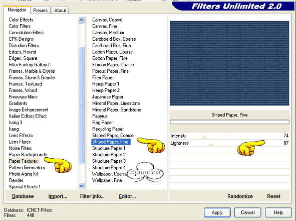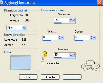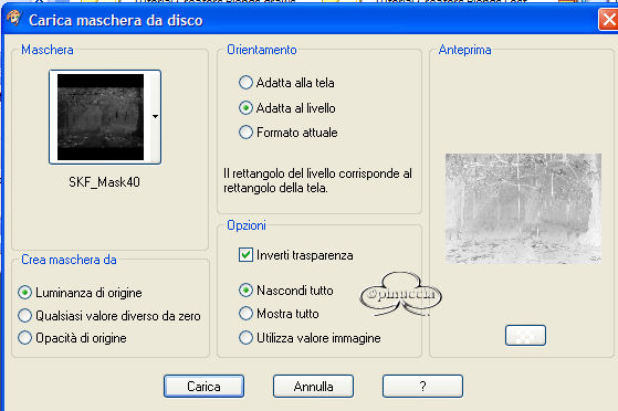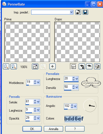qui puoi trovare qualche risposta ai tuoi dubbi. Se l'argomento che ti interessa non è presente, ti prego di segnalarmelo. Materiale qui Tubes: SS637 Misted di Suzy Sgai cdw-Spirit-of-the-Forest Isharimal_Last Fairies fairy-text-tube. Maschera SKF Mask40 Animazione: Wirly_Hearts 1-3. Filtri: Unlimited2 qui FM Tile Tools Blend Emboss Isharimal permette l'utilizzo dei suoi tubes soltanto per uso personale. Non potete usarli per i vostri tutorial. Non cambiate il nome dei tubes e non rimuovete il copyright. 1. Apri una nuova immagine trasparente 700 x 500 pixels. Riempila con il colore #bdd6ef.Livelli>nuovo livello raster. Riempi il livello con il colore #395273.2. Livelli>Carica/Salva maschera>Carica maschera da disco. Cerca e carica la maschera SKF_Mask40 ![]() Nella paletta dei livelli clicca con il tasto destro sul livello maschera e scegli Unisci>Unisci gruppo. 3. Livelli>Unisci>Unisci visibile. 4. Effetti>Plugins>FM Tile Tools / Blend Emboss, con i settaggi standard. ![]() 5. Apri il Tube SS_637_Misted e vai a Modifica>Copia. Torna al tuo lavoro e vai a Modifica>Incolla>Incolla come nuovo livello. Spostalo sulla destra, in modo che gli alberi dello sfondo si trovino uno sull'altro![]() Nella paletta dei livelli cambia la modalità di miscelatura in Luminanza (Esistente) e abbassa l'opacità al 70%. 6. Effetti>Plugins>FM Tile Tools / Blend Emboss, settaggi standard. 7. Apri il tube cdw-Spirit-Of-The-Forest e vai a Modifica>Copia. Torna al tuo lavoro e vai a Modifica>Incolla>Incolla come nuovo livello. Immagine>Ridimensiona, 85%, tutti i livelli non selezionato. ![]() Immagine>Rifletti. Spostalo sul lato sinistro dell'immagine.Nella paletta dei livelli cambia la modalità di miscelatura in Luminanza (Esistente) e abbassa l'opacità al 60%. Effetti>Plugins>FM Tile Tools, Blend Emboss, con i settaggi standard. ![]() 8. Apri il tube Isharimal_Last_Faries e vai a Modifica>Copia. Torna al tuo lavoro e vai a Modifica>Incolla>Incolla come nuovo livello. Spostalo un po' a destra.![]() Nella paletta dei livelli cambia la modalità di miscelatura in Luminanza (esistente) e abbassa l'opacità al 70%. Effetti>Plugins>FM Tile Tools, Blend Emboss, con i settaggi standard. 9. Livelli>Unisci>Unisci visibile. 10. Apri il tube di testo Fairy-text-tube e vai a Modifica>Copia. Torna al tuo lavoro e vai a Modifica>Incolla>Incolla come nuovo livello. Spostalo a sinistra.Cambia la modalità di miscelatura in Moltiplica. Livelli>Unisci>Unisci visibile. 11. Livelli>Nuovo livello raster. Riempi il livello con il colore di sfondo (#395273).Nella paletta dei livelli cambia la modalità di miscelatura in Luce Diffusa. Effetti>Plugins>Filters Unlimited, Paper Textures, Striped Paper Fine. ![]() Abbassa l'opacità di questo livello al 70%. Livelli>Unisci>Unisci tutto. 12. Fai una copia di questa immagine con Shift+D e minimizzala. 13. Ritorna al tuo lavoro. Immagine>Aggiungi bordatura, 3 pixels, simmetriche, con il colore di sfondo (#395273). 14. Immagine>Aggiungi bordatura, non simmetriche, con i seguenti settaggi, e con il colore di primo piano (#bdd6ef). ![]() Seleziona il bordo con la bacchetta magica ![]() (Sfumatura e tolleranza 0). 15. Riprendi la copia che hai minimizzato prima e vai a Modifica>Copia. Torna al tuo lavoro e vai a Modifica>Incolla>Incolla nella selezione. 16. Mantieni selezionato. Regola>Sfocatura>Sfocatura gaussiana, raggio 11. 17. Effetti>Effetti artistici di disegno>Pennellate, colore di primo piano: ![]() Effetti>Effetti 3D>Sfalsa ombra, con i seguenti settaggi, colore nero: ![]() Ripeti l'Effetto Sfalsa ombra, invertendo verticale e orizzontale. ![]() 18. Selezione>Nessuna selezione. 19. Immagine>Aggiungi bordatura, 4 pixels, simmetriche, con il colore scuro. 20. Non dimenticare di firmare con un bel font. 21. Immagine>Ridimensiona, a 700 pixels di larghezza. ![]() Se non vuoi animare la tag, hai finito. Puoi salvare il tuo blend in formato jpg. ![]() Se vuoi creare l'animazione copia l'immagine: Modifica>Copia. Apri Animation Shop e vai a Modifica>Incolla come nuova animazione. Apri Wirly_Hearts1.mng. Vedrai che è composta da 22 fotogrammi. Per creare l'animazione anche la tua tag dovrà essere composta da 22 fotogrammi. Attiva la tag e vai a Modifica>Duplica, e ripeti finchè non avrai ottenuti i fotogrammi necessari. Attiva nuovamente lo Wirly_Hearts1. Clicca sul primo fotogramma per selezionarlo e vai a Modifica>Seleziona tutto. Quindi Modifica>Copia. Riattiva la tag. Clicca sul primo fotogramma per selezionarlo e vai a Modifica>Seleziona tutto. Quindi Modifica>Incolla>Incolla nel fotogramma selezionato. Se non sei soddisfatto della posizione torna indietro con Modifica>Annulla incolla e ripeti. Per controllare il risultato clicca su Visualizza ![]() Apri Wirly_Hearts2 e ripeti. Apri Wirly_Hearts3 e ripeti. Salva in formato gif. ![]() Se hai problemi o dubbi, o trovi un link non funzionante, o anche soltanto per un saluto, scrivimi. Settembre 2006 |