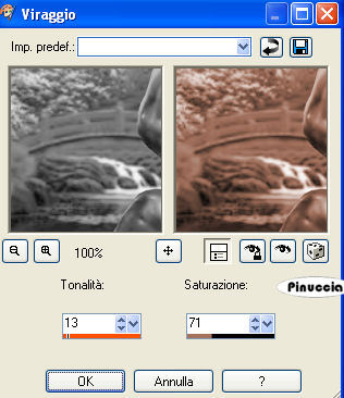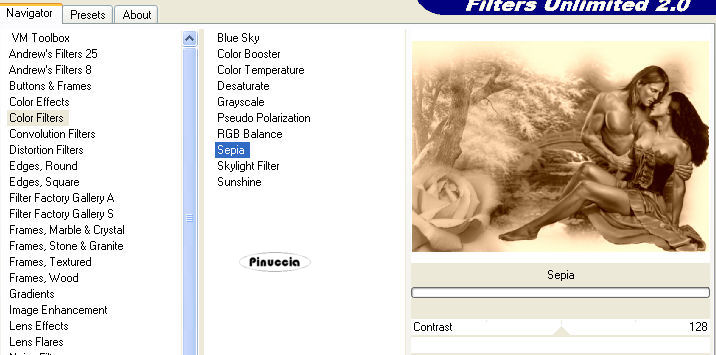 qui puoi trovare qualche risposta ai tuoi dubbi. Se l'argomento che ti interessa non è presente, ti prego di segnalarmelo. Occorrente: Materiale qui Nello zip trovi: tubes: una coppia, DaisyWeb_BridgeofTranquility, PatryMist_06_Rose_02, boomvallei, il font Edwardian Script ITC (che dovrebbe essere standard di Windows) un motivo oro: gold fill1. un romantico font a scelta. Filtri: Filters Unlimited 2.0 qui Graphics Plus qui Xero qui Patry e Daisy hanno concesso il download dei loro tubes soltanto per uso personale. Non potete usarli per i vostri tutorial. Non cambiate il nome dei files e non cancellate il livello del copyright. 1. Apri una nuova immagine, BIANCA, 700 x 500 pixels. 2. Selezione>Seleziona tutto. Livelli>Nuovo livello raster. Apri il tube e vai a Modifica>Copia. Torna al tuo lavoro e vai a Modifica>Incolla>Incolla nella selezione. Cambia la modalità di miscelatura di questo livello in Luminanza (esistente). Selezione>Nessuna selezione. ![]() Apri il tube della coppia. Immagine>Ridimensiona, all'80%, tipo di ricampionamento bicubica. Modifica>Copia. Torna al tuo lavoro e vai a Modifica>Incolla>Incolla come nuovo livello. Spostalo contro il bordo destro.![]() Cambia la modalità di miscelatura di questo livello in Luminanza (esistente). 3. Apri il tube "Boomvallei" e vai a Modifica>copia. Torna al tuo lavoro e vai a Modifica>Incolla>Incolla come nuovo livello. Spostalo contro il bordo sinistro.Cambia la modalità di miscelatura di questo livello in Luminanza (esistente), e abbassa l'opacità al 60%. 4. Apri il tube PatryMist_06_Rose_02. Immagine>Ridimensiona, all'80%, bicubica. Modifica>Copia. Torna al tuo lavoro e vai a Modifica>Incolla>Incolla come nuovo livello. Spostalo in basso a sinistra.Cambia la modalità di miscelatura di questo livello in Luminanza (Esistente). ![]() 5. Livelli>Unisci>Unisci visibile. 6. Regola>Saturazione e Tonalità>Viraggio: ![]() Effetti>Plugins>Filters Unlimited - Color Filters - Sepia, con i seguenti settaggi: ![]() ![]() 7. Effetti>Plugins>FM Tile Tools - Blend Emboss, con i settaggi standard: ![]() 8. Effetti>Plugins>Xero - Porcelain ![]() Ripeti l'Effetto Porcelain. 9. Attiva lo strumento Testo ![]() seleziona il font Edwardian Script ITC (lo trovi nel materiale, ma dovrebbe essere un font standard di Windows), dimensione 60 (settaggi che potresti dover regolare, a seconda della versione di PSP che stai usando, crea come vettore. Chiudi il colore di primo piano. Apri il motivo (nello zip) Goldfil1 e minimizzalo nella tua area di lavoro. Imposta il colore di sfondo su Motivi. Clicca sulla freccia a fianco del box per aprire il menu e troverai Goldfil1 nella lista dei motivi disponibili. ![]() Scrivi il tuo testo. ![]() Non posizionare il testo troppo a sinistra, perchè tra un po' sarà aggiunto un bordo. Livelli>Converti in livello raster. Effetti>Plugins>Graphics Plus - Cross Shadow, con i settaggi standard. ![]() Effetti>Effetti 3D>Sfalsa ombra: ![]() Ripeti l'Effetto Sfalsa ombra. 10. Scegli un font romantico (io ho scelto LainieDaySH) e scrivi il tuo nome sul blend. Ripeti l'Effetto Cross Shadow e l'Effetto Sfalsa ombra, usati per il testo precedente. Livelli>Unisci>Unisci visibile. 11. Effetti>Plugins>Filters Unlimeted, Buttons and Frames, Glass Frame 2: ![]() 12. Aggiungi, se vuoi, anche il tuo watermark in un nuovo livello. Salva in formato jpg. ![]() Se hai problemi o dubbi, o trovi un link non funzionante, o anche soltanto per un saluto, scrivimi. Gennaio 2007 |