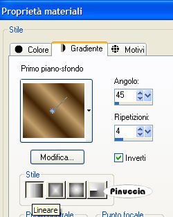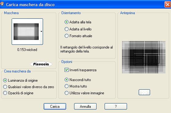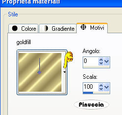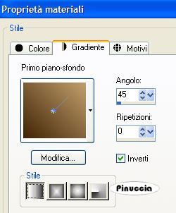 qui puoi trovare qualche risposta ai tuoi dubbi. Se l'argomento che ti interessa non è presente, ti prego di segnalarmelo. Occorrente: Materiale qui Nello zip trovate: 2 immagini, un tube di testo, le maschere 20-20 e 0.153 wicked (da mettere nella cartella maschere) Filtri: Greg's Factory Output II qui Graphics Plus qui FM Tile Tools qui 1. Apri una nuova immagine trasparente 800 x 600 pixels. Imposta il colore di primo piano con #c29f6c, e il colore di sfondo con #412404. 2. Passa il colore di primo piano a Gradiente di primo piano/sfondo, lineare, con i seguenti settaggi: ![]() Riempi l'immagine con questo gradiente.3. Livelli>Nuovo livello raster. Riempi con il colore di sfondo.(ricorda: per riempire con il colore di sfondo clicca con il tasto destro del mouse). 4. Livelli>Carica/Salva maschera>Carica maschera da disco: Cerca e carica la maschera 0.153wicked: ![]() Livelli>Unisci>Unisci gruppo. Nella paletta dei livelli abbassa l'opacità di questo livello al 78%. 5. Apri l'immagine Catherine1. Immagine>Ridimensiona, a 600 pixels di altezza. Livelli>Carica/Salva maschera>Carica maschera da disco, cerca e carica la maschera 20-20: ![]() Livelli>Unisci>Unisci gruppo. Modifica>Copia. Torna al tuo lavoro e vai a Modifica>Incolla>Incolla come nuovo livello. Immagine>Rifletti. Cambia la modalità di miscelatura di questo livello in Luminanza (esistente) Sposta l'immagine a sinistra.![]() 6. Apri l'immagine Catherine2. Immagine>Ridimensiona, a 600 pixels di altezza. Livelli>Carica/Salva maschera>Carica maschera da disco. Cerca e carica la maschera 20-20, con i settaggi precedenti. Livelli>Unisci>Unisci gruppo. Modifica>Copia. Torna al tuo lavoro e vai a Modifica>Incolla>Incolla come nuovo livello. Cambia la modalità di miscelatura di questo livello in Luminanza (esistente), e abbassa l'opacità al 60%. ![]() Spostala a destra.Livelli>Unisci>Unisci visibile. 7. Cambia i settaggi del gradiente: ![]() Livelli>Nuovo livello raster. Selezione>Seleziona tutto. Riempi con il gradiente.Selezione>Modifica>Contrai, di 7 pixels. Premi sulla tastiera il tasto CANC. Selezione>Inverti. Effetti>Plugins>Gregs Factory Output Vol. II, Pool Shadow, con i settaggi standard: ![]() Effetti>Plugins>Graphics Plus, Cross Shadow, con i settaggi standard: ![]() Effetti>Effetti 3D>Sfalsa ombra, con i seguenti settaggi: ![]() Selezione>Nessuna selezione. 8. Livelli>Unisci>Unisci visibile. 9. Effetti>Plugins>FM Tile Tools, Blend Emboss, con i settaggi standard. ![]() 10. Imposta il colore di sfondo su Motivi e seleziona un motivo oro. nel caso tu non ce l'abbia, lo allego al tutorial. Aprilo e minimizzalo. Così lo troverai nella lista dei motivi disponibili. ![]() Chiudi il colore di primo piano e scegli un font adatto. Io ho usato Planet Dust (metto anche il font con il motivo oro: clicca qui), vettore, dimensione 80, bold, corsivo: ![]() il settaggio della dimensione può variare a seconda della versione di PSP che stai usando. gli 80 pixels di PSP X dovrebbero diventare, in PSP 9, poco meno di 72 pixels: regola il settaggio a tuo piacimento. Scrivi il tuo testo. Livelli>Converti in livello raster. Effetti>Effetti 3D>Sfalsa ombra: ![]() Ripeti l'Effetto Sfalsa ombra ma cambiando verticale e orizzontale a -1. 11. Apri il tube "Texttube" e vai a Modifica>Copia. Torna al tuo blend e vai a Modifica>Incolla>Incolla come nuovo livello. 12. Regola>Messa a fuoco>Metti a fuoco. 13. Aggiungi la tua firma o il tuo watermark in un nuovo livello. e salva in formato jpg. 14. Livelli>Unisci>Unisci tutto e salva in formato jpg. ![]() Se hai problemi o dubbi, o trovi un link non funzionante, o anche soltanto per un saluto, scrivimi. Gennaio 2007 |