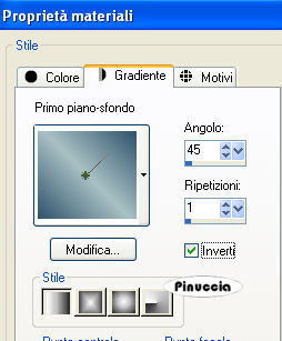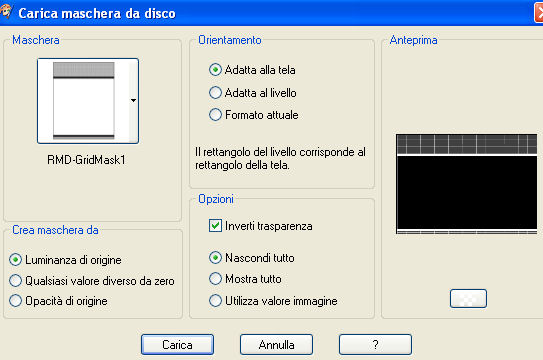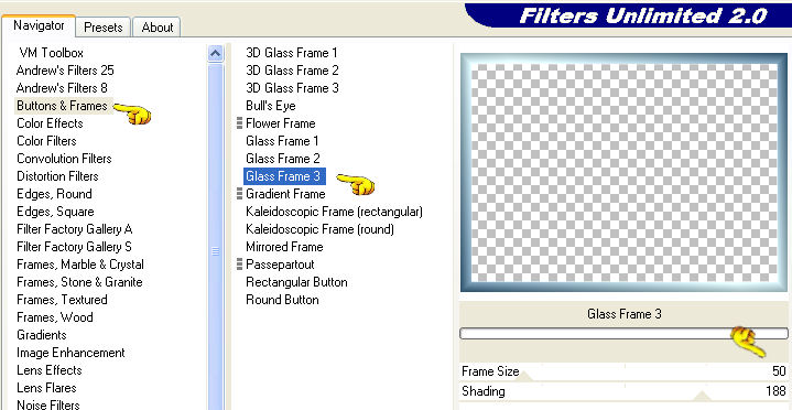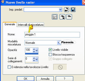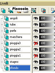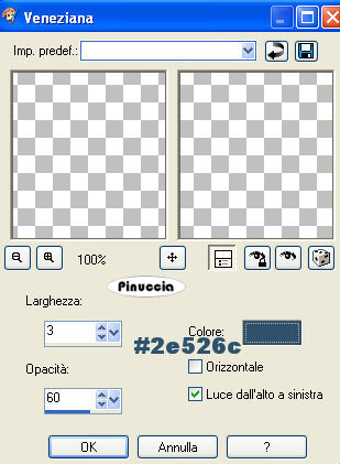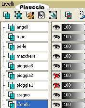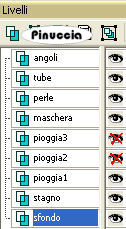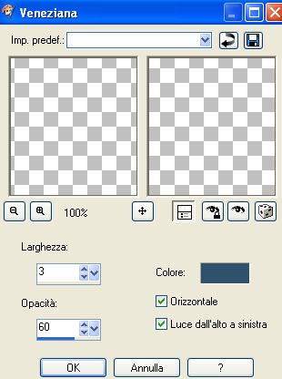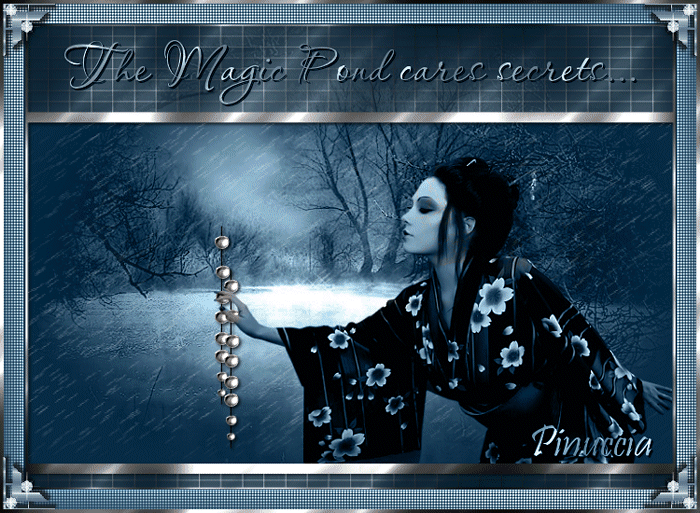 qui puoi trovare qualche risposta ai tuoi dubbi. Se l'argomento che ti interessa non è presente, ti prego di segnalarmelo. Occorrente: Materiale qui Nello zip trovate: i tubes: Pond, Oriental Woman di Filly, Corner e Yoka_JdL_Serenity-Pearlstring. i templates della pioggia 1-3; la maschera RMD-GridMask1; un motivo argento: kvmsilver, il font PassionConflictROB. Metti la maschera nella cartella Maschere. Apri il motivo kvmsilver e minimizzalo. Lo troverai disponibile nella lista dei motivi, quando ti servirà. ![]() Apri il font e minimizzalo. Lo troverai disponibile nella lista dei font, quando vorrai usare lo strumento Testo ![]() Filtri: Graphics Plus qui Filter Unlimited2 qui Filly e Yoka hanno concesso il download dei loro tubes soltanto per uso personale. Non puoi usarli per i tuoi tutorial. Non cambiare il nome del file e non cancellare il livello del copyright. 1. Apri una nuova immagine trasparente 700 x 500 pixels, e riempila con il colore #072b45.2. Livelli>Nuovo livello raster. Riempi il livello con il motivo argento.Livelli>Carica/Salva maschera>Carica maschera da disco, cerca e carica la maschera RMD-GridMask1: ![]() Livelli>Unisci>Unisci gruppo. Effetti>Plugins>Graphics Plus, Cross Shadow, con i settaggi standard: ![]() Ripeti l'Effetto Cross Shadow. Effetti>Effetti 3D>Sfalsa ombra: ![]() ![]() 3. Attiva il livello inferiore. Livelli>Nuovo livello raster. Selezione>Seleziona tutto. Apri il tube "Pond" e vai a Modifica>Copia. Torna al tuo lavoro e vai a Modifica>Incolla>Incolla nella selezione. Selezione>Nessuna selezione. Cambia la modalità di miscelatura di questo livello in Luminanza (esistente). ![]() 4. Apri il tube di Filly Oriental Woman e vai a Modifica>Copia. Torna al tuo lavoro e vai a Modifica>Incolla>Incolla come nuovo livello. Spostalo a destra, con il bordo del tube appoggiato alla maschera.Cambia la modalità di miscelatura di questo livello in Luminanza (Esistente). ![]() ![]() 5. Nella paletta dei livelli attiva il livello inferiore (lo sfondo). Immagine>Dimensione tela: ![]() 6. Clicca con la bacchetta magica nel bordo trasparente.Scegli dalla tua immagine un colore chiaro come colore di primo piano, e un colore scuro come colore di sfondo, e crea un gradiente lineare con i seguenti settaggi: ![]() (io ho usato #a9c1c4 e #2e526c) Livelli>Nuovo livello raster. Riempi il bordo con il gradiente.7. Effetti>Plugins>Buttons & Frames - Glass Frame 3: ![]() 8. Effetti>Effetti di trama>Veneziana, con i seguenti settaggi e con il colore scuro di sfondo. ![]() Ripeti l'Effetto Veneziana, con i seguenti settaggi: ![]() Regola>Messa a fuoco>Accentua messa a fuoco. Selezione>Nessuna selezione. Livelli>Unisci>Unisci giù. Rimani sul livello inferiore. Selezione>Seleziona tutto. Livelli>Nuovo livello raster. Riempi con il motivo argento.Selezione>Modifica>Contrai, di 4 pixels. Premi sulla tastiera il tasto CANC. Selezione>Inverti. Effetti>Plugins>Graphics Plus, Cross Shadow, 2 volte, con i settaggi standard: ![]() Selezione>Nessuna selezione. Livelli>Unisci>Unisci giù. ![]() 9. Attiva il livello superiore (quello del tube). Attiva lo strumento Testo ,seleziona il font PAssionsConflictROB, come vettore, dimensione 36. Colore di primo piano chiuso, colore di sfondo impostato sul Motivo argento. Scrivi il tuo testo sopra la griglia della maschera. Livelli>Converti in livello raster. Effetti>Effetti 3D>Sfalsa ombra: ![]() Ripeti l'Effetto Sfalsa ombra. Livelli>Unisci>Unisci giù. 10. Scegli un altro font e scrivi il tuo nome - sempre con il motivo argento impostato come colore di sfondo. Livelli>Converti in livello raster. Spostalo sotto il tube.Effetti>Effetti 3D>Sfalsa ombra, con i settaggi usati per l'altro testo. Non dimenticare il tuo watermark. Unisci tutti i livelli di testo al livello del tube: Livelli>Unisci>Unisci giù. ![]() Apri il tube di Yoka_JdL_Serenity-Pearlstring e vai a Modifica>Copia. Torna al tuo lavoro e vai a Modifica>Incolla>Incolla come nuovo livello. Nella paletta dei livelli spostalo sotto il livello del tube. Posizionalo , in modo che le perle sembrino toccare la mano della donna.Effetti>Effetti 3D>Sfalsa ombra: ![]() 11. Attiva il livello dello Stagno. Attiva lo strumento Selezione , rettangolo,e seleziona l'interno della maschera. ![]() Livelli>Nuovo livello raster. Quando apparirà la solita finestra, approfitta per rinominare il livello "Pioggia 1" ![]() Apri il template Raining1 e vai a Modifica>Copia. Torna al tuo lavoro e vai a Modifica>Incolla>Incolla nella selezione. Livelli>Nuovo livello raster, e nominalo subito "pioggia2". Apri il template Raining2 e vai a Modifica>Copia. Torna al tuo lavoro e vai a Modifica>Incolla>Incolla nella selezione. Livelli>Nuovolivello raster, e nominalo subito "pioggia3". Apri il template Raining3 Template e vai a Modifica>Copia. Torna al tuo lavoro e vai a Modifica>Incolla>Incolla nella selezione. Selezione>Nessuna selezione. 12. Attiva il livello superiore. Apri il tube Corner e vai a Modifica>Copia. Torna al tuo lavoro e vai a Modifica>Incolla>Incolla come nuovo livello. Posizionalo nell'angolo in alto a sinistra.Effetti>Effetti 3D>Sfalsa ombra, con i settaggi precedenti. Livelli>Duplica. Immagine>Rifletti. Livelli>Duplica. Immagine>Capovolgi. Livelli>Duplica. Immagine>Rifletti. Adesso hai il tube in ogni angolo. ![]() Chiudi tutti i livelli tranne i quattro livelli dell'angolo. Livelli>Unisci>Unisci visibile. Livelli>Visualizza>Tutto. 13. Chiudi i livelli Pioggia 2 e 3. ![]() Modifica>Copia Unione. ![]() Apri Animation Shop. Clicca con il tasto destro del mouse sullo spazio vuoto e Incolla come nuova animazione. Ritorna in PSP. Chiudi il livello pioggia 1 e attiva il livello pioggia 2. ![]() Modifica>Copia unione. In Animation Shop Modifica>Incolla>Incolla dopo il fotogramma corrente. Ritorna ancora una volta in PSP. Chiudi il livello pioggia 2 e attiva il livello pioggia 3. ![]() Modifica>Copia unione. Ritorna per l'ultima volta in Animation Shop. Modifica>Incolla>Incolla dopo il fotogramma corrente. Ed