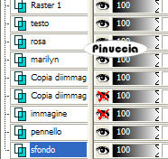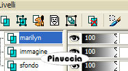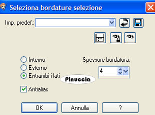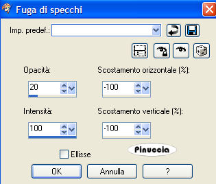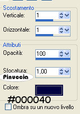 seleziona il font Monika, dimensione 60, corsivo, crea come vettore,Scrivi il testo. Usa i nodi del vettore per ruotarlo leggermente e posizionalo in alto a sinistra. Livelli>Converti in livello raster. Effetti>Effetti 3D>Sfalsa ombra, con i settaggi precedenti. Rinomina questo livello testo. ![]() ![]() 12. Attiva il livello inferiore. Livelli>Nuovo livello raster. Imposta il colore di primo piano con il bianco. Attiva lo strumento Pennello ![]() cerca e seleziona il pennello Marilyn, dimensione 250, Applica il pennello varie volte, casualmente sui bordi dell'immagine, sempre sullo stesso livello (vedi il mio esempio). Se vuoi, cambia la modalità di miscelatura di questo livello in Sovrapponi. Rinomina questo livello Pennello. 13. Attiva il livello superiore. Selezione>Seleziona tutto. Livelli>Nuovo livello raster. Riempi con il secondo gradiente.Selezione>Modifica>Contrai, di 6 pixels. Premi sulla tastiera il tasto canc ![]() Selezione>Inverti. Effetti>Plugins>Graphics Plus - Cross Shadow, con i settaggi standard, 2 volte. Effetti>Plugins>Penta.com - Dot and cross, con i settaggi standard. Regola>Messa a fuoco>Accentua messa a fuoco. Effetti>Effetti 3D>Sfalsa ombra, con i seguenti settaggi, con il colore scuro di sfondo: ![]() 14. Se vuoi, sul livello del testo aggiungi il tuo watermark. 15. Attiva il livello dell'immagine. Livelli>Duplica, 2 volte. Chiudi i livelli superiori delle due copie. ![]() 16. Attiva lo strumento Ornamento ![]() cerca e seleziona l'ornamento Sterni e applicalo sull'immagine, con diversi settaggi: 20, 30 e 50. Se per qualche ragione non trovi l'ornamento nella lista dello strumento, apri il file in PSP e vai a Esporta>come ornamento, assegnagli un nome, e lo troverai. Chiudi questo livello e attiva il livello della prima copia. Applica l'ornamento nelle tre dimensioni. Chiudi questo livello e attiva il livello della seconda copia e applica nuovamente l'ornamento nelle tre dimensioni. Passiamo all'animazione. Chiudi i livelli delle due copie dell'immagine. ![]() Modifica>Copia unione. Apri Animation Shop. Clicca con il tasto destro del mouse sullo spazio vuoto e Incolla come nuova animazione. ![]() Ritorna in PSP. Chiudi il livello originale dell'immagine e apri il livello della prima copia. ![]() Modifica>Copia unione. In Animation Shop: Modifica>Incolla>Incolla dopo il fotogramma selezionato. In PSP: chiudi la prima copia e apri il livello della seconda copia. ![]() Modifica>Copia unione. Ancora in Animation Shop: Modifica>Incolla>Incolla dopo il fotogramma selezionato. Clicca sul primo fotogramma per selezionarlo e vai a Modifica>Seleziona tutto. Animazione>Proprietà fotogramma, e imposta la velocità a 22. ![]() Se vuoi ridimensionare l'immagine: Animazione>Ridimensiona animazione, all'85%, ricampionamento bicubico. ![]() Salva in formato gif. ![]() Se hai problemi o dubbi, o trovi un link non funzionante, o anche soltanto per un saluto, scrivimi. 10 Giugno 2007 |
