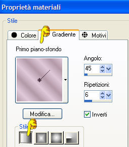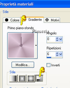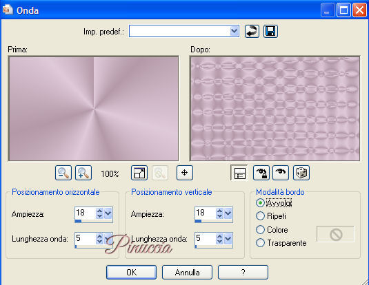 qui puoi trovare qualche risposta ai tuoi dubbi. Se l'argomento che ti interessa non č presente, ti prego di segnalarmelo. Materiale qui Metti la selezione nella cartella Selezioni. Patry permette soltanto l'uso personale dei suoi tubes. Non usateli per i vostri tutorial. Non cambiate il nome dei tubes e non rimuovete il copyright. Filtri: Graphics Plus qui Xero qui in caso di problemi, qui trovi alcuni appunti. Se non hai trovato la risposta che cercavi, per favore, fammelo sapere. 1. Apri una nuova immagine trasparente 600 x 450 pixels. Imposta il colore di primo piano con #dfcad9, e il colore di sfondo con #b499a8. Passa il colore di primo piano a Gradiente di primo piano/sfondo, con i seguenti settaggi: ![]() Riempi l'immagine con questo gradiente.2. Effetti>Effetti di distorsione>Onda: ![]() ![]() 3. Apri il tube Jennifer2 e vai a Modifica>Copia. Torna al tuo lavoro e vai a Modifica>Incolla>Incolla come nuovo livello. Spostalo sul lato destro.Livelli>Duplica. Livelli>Unisci>Unisci gių. 4. Livelli>Nuovo livello raster. Selezione>Carica/Salva selezione>Carica selezione da disco: Cerca e carica la selezione Melindas1. ![]() Cambia i settaggi del gradiente: ![]() Riempi la selezione con questo gradiente.5. Effetti>Plugins>Graphics Plus - Cross Shadow, con i settaggi standard. ![]() 6. Effetti>Effetti 3D>Sfalsa ombra, con i seguenti settaggi: ![]() Selezione>Nessuna selezione. 7. Livelli>Duplica. Immagine>Ruota>ruota per gradi: ![]() Sposta la striscia duplicata a sinistra vicino al bordo.![]() 8. Apri il tube PatryTubes_06_Flowers_95 e vai a Modifica>Copia. Torna al tuo lavoro e vai a Modifica>Incolla>Incolla come nuovo livello. Immagine>Rifletti. Sposta il fiore sulla striscia.Attiva lo strumento Gomma e cancella il gambo del fiore, in modo che sembri incrociato con la striscia.![]() Effetti>Effetti 3D>Sfalsa ombra, con gli stessi settaggi settaggi del passo 6. 9. Apri nuovamente il tube del fiore. Attiva lo strumento Selezione a mano libera , punto a punto,sfumatura e tolleranza 0, e traccia una selezione intorno al fiore. 10. Modifica>Copia. Torna al tuo lavoro e vai a Modifica>Incolla>Incolla come nuovo livello. Immagine>Ridimensiona, del 70%, tutti i livelli non selezionato: ![]() Spostalo sotto il fiore pių grande.Effetti>Effetti 3D>Sfalsa ombra, con gli stessi settaggi del passo 6. Livelli>Unisci>Unisci visibile. ![]() 11. Imposta il colore di sfondo con #4e6417. Attiva lo strumento Testo e scegli un bel font, stile vettore.Scrivi il tuo testo. Livelli>Converti in livello raster. Effetti>effetti 3D>sfalsa ombra, con i seguenti settaggi: ![]() 12. Cerca un altro bel font, con gli stessi colori scrivi il tuo nome e posizionalo sopra la striscia in basso. Effetti>Effetti 3D>Sfalsa ombra, con gli stessi settaggi del passo 11. 13. Livelli>Unisci>Unisci tutto. ![]() 14. Immagine>Aggiungi bordatura, 2 pixels, simmetriche, con il colore #722f6c. Immagine>Aggiungi bordatura, 6 pixels, simmetriche, con il colore #dfcad9. Immagine>Aggiungi bordatura, 2 pixels, simmetriche, con il colore #722f6c. Selezione>Seleziona tutto. Selezione>Modifica>Contrai, di 10 pixels. Selezione>Inverti. Effetti>Plugins>Graphics Plus - Cross Shadow, con i settaggi standard. ![]() Selezione>Nessuna selezione. 15. Effetti>Plugins>Xero - Porcelain, con i seguenti settaggi: ![]() 16. Non dimenticare il tuo watermark e salva in formato jpg. ![]() Se hai problemi o dubbi, o trovi un link non funzionante, o anche soltanto per un saluto, scrivimi Novembre 2006 |