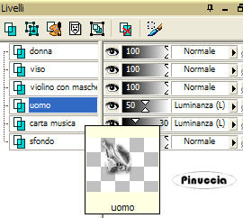 qui puoi trovare qualche risposta ai tuoi dubbi. Se l'argomento che ti interessa non è presente, ti prego di segnalarmelo. Occorrente: Materiale qui Nello zip trovate: 5 tubes di Patry. la maschera 20-20 (mettila nella cartella maschere) il font Copper Alt Caps Expert (aprilo in PSP e minimizzalo; lo troverai così disponibile nella lista dei font, quando attiverai lo strumento Testo). Filtri: Graphics Plus qui Xero qui FM Tile Tools qui Patry ha concesso il download dei suoi tubes per uso personale. Non puoi usarli per i tuoi tutorial. Non cambiare il nome dei files e non cancellare il livello del watermark. 1. Apri una nuova immagine trasparente 800 x 600 pixels, e riempila con il colore #ece0d8.Selezione>Seleziona tutto. Livelli>Nuovo livello raster. 2. Apri il tube PatryMists_Flowers121 e vai a Modifica>Copia. Torna al tuo lavoro e vai a Modifica>Incolla>Incolla nella selezione. Cambia la modalità di questo livello in Luminanza (esistente) e abbassa l'opacità al 30%. Selezione>Nessuna selezione. 3. Effetti>Plugins>FM Tile Tools, Blend Emboss, con i settaggi standard. ![]() ![]() 4. Apri il tube PatryMists_06_onlyface_56. Immagine>Ridimensiona, a 600 pixels di altezza. Modifica>Copia. Torna al tuo blend e vai a Modifica>Incolla>Incolla come nuovo livello. Spostalo a destra.5. Apri il tube PatryMists_06_music_05. Immagine>Rifletti. Modifica>Copia. Torna al tuo blend e vai a Modifica>Incolla>Incolla come nuovo livello. Spostalo in basso a sinistra.6. Apri il tube PatryMists_06_music_02 e vai a Modifica>Copia. Torna al tuo lavoro e vai a Modifica>Incolla>Incolla come nuovo livello. Spostalo in basso.Nella paletta dei livelli sposta questo livello sotto il livello del primo tube di donna, 7. Livelli>Carica/salva maschera>Carica maschera da disco, cerca e carica la maschera 20-20: ![]() Livelli>Unisci>Unisci gruppo. 8. Nella paletta dei livelli attiva il livello Raster 2 (quello della musica). Attiva lo strumento Gomma ![]() e cancella dal viso della donna i segni del tube. ![]() 9. Apri il tube con l'uomo PatryMists_06_Male_06 e vai a Modifica>Copia. Torna al tuo lavoro e vai a Modifica>Incolla>Incolla come nuovo livello. Immagine>Rifletti. Nella paletta dei livelli sposta questo livello sotto il livello del violino. Cambia la modalità di miscelatura in Luminanza (esistente) e abbassa l'opacità al 50%. ![]() 10. Se necessario, sposta i tubes per sistemarli meglio. Livelli>Unisci>Unisci visibile. ![]() 11. Effetti>Plugins>FM Tile Tools - Blend Emboss, con i settaggi standard. ![]() Effetti>Plugins>Xero, Porcelain: ![]() Ripeti l'Effetto Porcelain. 12. Imposta come colore di sfondo #b3585c, e chiudi il livello di primo piano. Attiva lo strumento Testo ,seleziona il font Copper Alt Caps Expert, vettore, e scrivi il tuo testo: Effetti>Effetti 3D>Sfalsa ombra, con i seguenti settaggi, colore #53211b. ![]() Ripeti l'Effetto Sfalsa ombra 2-3 volte. ![]() 13. Aggiungi il tuo nome sul blend. Effetti>Effetti 3D>Sfalsa ombra, con i settaggi precedenti. 14. Livelli>Unisci>Unisci visibile. 15. Crea un bel gradiente, scegliendo dal tuo blend un colore chiaro come colore di primo piano e un colore scuro come colore di sfondo. Seleziona>Seleziona tutto. Livelli>Nuovo livello raster. Riempi con questo gradiente.Selezione>Modifica>Contrai, di 6 pixels. Premi sulla tastiera il tasto CANC. Selezione>Inverti. Effetti>Plugins>Graphics Plus, Cross Shadow, con i settaggi standard: ![]() Ripeti l'Effetto Cross Shadow. Effetti>Effetti 3D>Sfalsa ombra, con i settaggi precedenti, ma una volta sola. ![]() Selezione>Nessuna selezione. 16. Aggiungi, se vuoi, il tuo watermark in un nuovo livello. Livelli>Unisci>Unisci tutto. Salva in formato jpg. ![]() Se hai problemi o dubbi, o trovi un link non funzionante, o anche soltanto per un saluto, scrivimi. Gennaio 2007 |