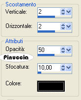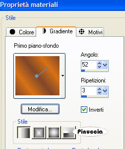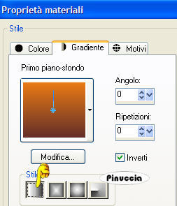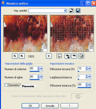 qui puoi trovare qualche risposta ai tuoi dubbi. Se l'argomento che ti interessa non è presente, ti prego di segnalarmelo. Occorrente: Materiale qui Nello zip trovate: 1 immagine, 5 tubes, un bel font. Filtri: Greg's Factory Output II qui FM Tile Tools qui Xero qui Graphics Plus qui Fotomatic qui 1. Apri una nuova immagine trasparente 800 x 600 pixels. Imposta il colore di primo piano con #ea7a14, e il colore di sfondo con #642f29. 2. Passa il colore di primo piano a Gradiente di primo piano/sfondo, lineare, con i seguenti settaggi: ![]() Riempi l'immagine con questo gradiente.3. Apri il tube Monique e vai a Modifica>Copia. Torna al tuo lavoro e vai a Modifica>Incolla>Incolla come nuovo livello. Spostalo completamente a sinistra.Livelli>Duplica. Immagine>Rifletti. Livelli>Unisci>Unisci giù. Cambia la modalità di miscelatura di questo livello in Luminanza (esistente) e abbassa l'oopacità all'80%. ![]() 4. Apri il tube Frau1 e vai a Modifica>Copia. Torna al to lavoro e vai a Modifica>Incolla>Incolla come nuovo livello. Spostalo in alto a sinistra.Abbassa l'opacità di questo livello al 70%. 5. Apri il tube Frau2 e vai a Modifica>Copia. Torna al tuo lavoro e vai a Modifica>Incolla>Incolla come nuovo livello. Spostalo a destra un po' in basso.Abbassa l'opacità di questo livello al 70%. ![]() 6. Apri il tube Feather e vai a Modifica>Copia. Torna al tuo lavoro e vai a Modifica>Incolla>Incolla come nuovo livello. Sposta la piuma in alto,a sinistra della testa del tube Frau1. Livelli>Duplica. Immagine>Rifletti. Sposta la seconda piuma a destra della testa del tube Frau2.Abbassa l'opacità di questo livello al 70%. ![]() 7. Abbassa l'opacità di entrambi i livelli della piuma al 70%. 8. Livelli>Unisci>Unisci tutto. 9. Apri la forma della foglia "Leaf" e vai a Modifica>Copia. Torna al tuo lavoro e vai a Modifica>Incolla>Incolla come nuovo livello. Clicca sulla foglia con la bacchetta magica , (tolleranza e sfumatura 0).Apri l'immagine "Bisons" e vai a Modifica>Copia. Torna al tuo lavoro e vai a Modifica>Incolla>Incolla nella selezione. Effetti>Effetti 3d>Sfalsa ombra: ![]() 10. Livelli>Duplica. Attiva il livello inferiore (l'originale). Chiudi il livello superiore (la copia). Effetti>Effetti di trama>Mosaico antico. ![]() Cambia la modalità di miscelatura di questo livello in Luminanza (esistente) e abbassa l'opacità al 38%. Effetti>Effetti 3D>Sfalsa ombra, con i settaggi usati al passo 9. 11. Riapri il livello superiore della foglia e attivalo. Cambia la modalità di miscelatura di questo livello in Luminanza (esistente) e abbassa l'opacità al 78%. 12. Effetti>Effetti 3D>Sfalsa ombra, con i settaggi usati al passo 9. 13. Livelli>Duplica. Immagine>Ridimensiona al 75%, tutti i livelli non selezionato: ![]() 14. Livelli>Duplica. Immagine>Ridimensiona, al 75%, tutti i livelli non selezionato. 15. Attiva il livello della foglia centrale. Immagine>Rifletti. Sistema le foglie.Livelli>Unisci>Unisci visibile. ![]() 16. Effetti>Plugins>FM Tile Tools - Blend Emboss, con i settaggi standard. ![]() 17. Effetti>Plugins>Xero - Porcelain: ![]() Ripeti l'Effetto Porcelain. 18. Imposta il colore di primo piano con #d77217, e il colore di sfondo con #804729. Passa il colore di primo piano a gradiente lineare, con i seguenti settaggi: ![]() 19. Livelli>Nuovo livello raster. Selezione>Seleziona tutto. Riempi con il gradiente.Selezione>Modifica>Contrai, di 7 pixels. Premi sulla tastiera il tasto CANC. Selezione>Inverti. 20. Effetti>Plugins>Graphics Plus, Cross Shadow, con i settaggi standard: ![]() 21. Effetti>Plugins>Gregs Factory Output Vol. II, Pool Shadow, con i settaggi standard: ![]() 22. Effetti>Effetti 3d>Sfalsa ombra: ![]() Selezione>Nessuna selezione. Livelli>Unisci>Unisci visibile. 23. Imposta il colore di sfondo sul gradiente e chiudi il colore di primo piano. Attiva lo strumento Testo ![]() Io ho usato Ringbearer, vettore, dimensione 48, corsivo. Scrivi il tuo testo. Livelli>Converti in livello raster. Effetti>Plugins>Graphics Plus, Cross Shadow, con i settaggi standard. ![]() Ripeti l'Effetto Cross Shadow. Effetti>Effetti 3D>Sfalsa ombra: ![]() Livelli>Unisci>Unisci tutto. 24. Effetti>Plugins>Fotomatic, Skygrad ![]() Non dimenticare di firmare il tuo blend. Salva in formato jpg. ![]() Se hai problemi o dubbi, o trovi un link non funzionante, o anche soltanto per un saluto, scrivimi. Gennaio 2007 |