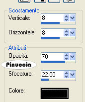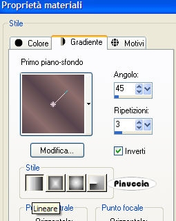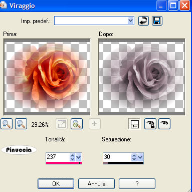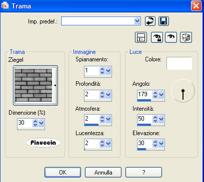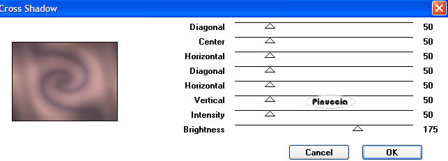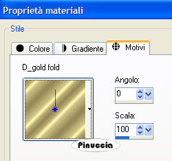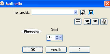 qui puoi trovare qualche risposta ai tuoi dubbi. Se l'argomento che ti interessa non è presente, ti prego di segnalarmelo. Occorrente: Materiale qui Nello zip trovi: i tubes: mh_cgbutler di Margit, PatryTubes06_Celeb_107, il tube di testo No_Matter e ann_060706_flowerorange_TD. la trama oro D_Gold_Fold, e la trama Ziegel (mettile nella cartella Trame di PSP). l'animazione RosenRanke.mng. Filtro Graphics Plus qui Ann, Margit e Patry hanno concesso l'uso soltanto personale dei loro tubes. Non potete usarli per i vostri tutorials. Non cambiate il nome dei tube e non cancellate il livello del copyright. 1. Apri una nuova immagine trasparente 600 x 450 pixels. Imposta il colore di primo piano con #8d6e6c, e il colore di sfondo con #56444c. Passa il colore di primo piano a Gradiente di primo piano/sfondo, con i seguenti settaggi: ![]() 2. Riempi l'immagine con questo gradiente.Effetti>Effetti di distorsione>Mulinello, gradi -360. ![]() 3. Regola>Sfocatura>Sfocatura gaussiana, raggio 5. ![]() 4. Effetti>Plugins>Graphics Plus - Cross Shadow: ![]() 5. Apri il tube mh_cgbutler, fai una copia con Shift+D e chiudi l'originale. Posizionati sul livello del watermark, clicca con il tasto destro del mouse e scegli Elimina. Immagine>Rifletti. Immagine>Ridimensiona, al 65%, bicubica, tutti i livelli selezionato: ![]() 6. Modifica>Copia. Torna al tuo lavoro e vai a Modifica>Incolla>Incolla come nuovo livello. Sposta il tube a destra, contro il bordo.La parte del braccio piegata deve rimanere fuori dalla tag. Cambia la modalità di miscelatura di questo livello in Luminanza (esistente) e abbassa l'opacità al 40%. ![]() Livelli>Unisci>Unisci tutto. 7. Immagine>Aggiungi bordatura, 2 pixels, simmetriche, con il colore bianco. Seleziona il bordo con la bacchetta magica , sfumatura e tolleranza 0.Apri la trama D-GoldFoil e minimizzala nella tua area di lavoro. Imposta il colore di primo piano su Motivi. Apri il menu cliccando sulla freccia a fianco del box e seleziona il Motivo. ![]() Riempi la selezione con il Motivo oro.Selezione>Nessuna selezione. 8. Immagine>Aggiungi bordatura, simmetriche non selezionato, con #56444c. ![]() 9. Effetti>Effetti di trama>Trama: apri il menu cliccando sulla freccia a fianco del box e seleziona la trama Ziegel: ![]() Mantieni selezionato. Effetti>Plugins>Graphics Plus - Cross Shadow, con gli stessi settaggi del passo 4. Regola>Messa a fuoco>Metti a fuoco. Selezione>Nessuna selezione. ![]() 10. Apri il tube PatryTubes06_Celeb_107 e vai a Modifica>Copia. Torna al tuo lavoro e vai a Modifica>Incolla>Incolla come nuovo livello. Spostalo a sinistra.Attiva lo strumento Deformazione ![]() Puntatore se stai usando PSP Xe allunga il tube in modo che la testa tocchi il bordo. ![]() Regola>Messa a fuoco>Metti a fuoco. Effetti>Effetti 3D>Sfalsa ombra: ![]() 11. Livelli>Unisci>Unisci visibile. 12. Apri il tube ann_060706_flowerorange_TD. Fai una copia con Shift+D e chiudi l'originale. Clicca con il tasto destro del mouse sul livello del watermark e scegli Elimina. Immagine>Rifletti. 13. Livelli>Carica/salva maschera>Carica maschera da disco: cerca e seleziona la maschera 20-20: ![]() Livelli>Unisci>Unisci gruppo. 14. Regola>Saturazione e tonalità>Viraggio: ![]() Immagine>Ridimensiona, al 60%, bicubica, tutti i livelli selezionato. ![]() Modifica>Copia. Torna al tuo lavoro e vai a Modifica>Incolla>Incolla come nuovo livello. Sposta il tube nell'angolo in basso a destra.![]() 15. Apri il tube di testo No_Matter e vai a Modifica>Copia. Torna al tuo lavoro e vai a Modifica>Incolla>Incolla come nuovo livello. Posizionalo correttamente.Regola>Messa a fuoco>Metti a fuoco. 15. Effetti>Effetti 3D>Sfalsa ombra: ![]() 17. Livelli>Unisci>Unisci tutto. 18. Immagine>Aggiungi bordatura, 2 pixels, simmetriche, con il colore bianco. Seleziona il bordo con la bacchetta magica , sfumatura e tolleranza 0,e riempilo con il motivo oro.Selezione>Nessuna selezione. 19. Imposta il colore di sfondo con il Motivo oro, e chiudi il colore di primo piano. Attiva lo strumento Testo , scegli un bel font, crea come vettore,e scrivi il tuo nome. Livelli>Converti in livello raster. Effetti>effetti 3D>Sfalsa ombra, con i settaggi usati prima per il tube di testo. 20. Livelli>Unisci>Unisci tutto. Immagine>Ridimensiona, a 500 pixels di larghezza, bicubica, tutti i livelli selezionato. ![]() Regola>Messa a fuoco>Metti a fuoco. Aggiungi, se vuoi, il tuo watermark. 21. Se non vuoi animare la tag, hai finito. Salva in formato jpg. ![]() Animazione Modifica>Copia. Apri Animation Shop. Clicca con il tasto destro del mouse sullo spazio vuoto e Incolla come nuova animazione. ![]() Clicca con il tasto destro del mouse sull'immagine e scegli Duplica. Ripeti finchè non avrai ottenuto 7 fotogrammi. Clicca sul primo fotogramma per selezionarlo e vai a Modifica>Seleziona tutto. Apri adesso l'animazione che hai trovato nello zip: RosenRanke.mng. Clicca sul primo fotogramma per selezionarlo e vai a Modifica>Seleziona tutto e poi Modifica>Copia. Ritorna al tuo lavoro e vai a Modifica>Incolla>Incolla nel fotogramma selezionato. Posiziona l'animazione nell'angolo in alto a sinistra della cornice e, quando sei certo di aver trovato la posizione corretta, rilascia il tasto del mouse. ![]() Animazione>Proprietà fotogramma e imposta la velocità a 50. ![]() Clicca sull'ultimo fotogramma. Attenzione, soltanto questo fotogramma deve avere la cornice blu. Animazione>Proprietà fotogramma e imposta la velocità a 150. ![]() ![]() Se hai problemi o dubbi, o trovi un link non funzionante, o anche soltanto per un saluto, scrivimi. 16 Febbraio 2007 |