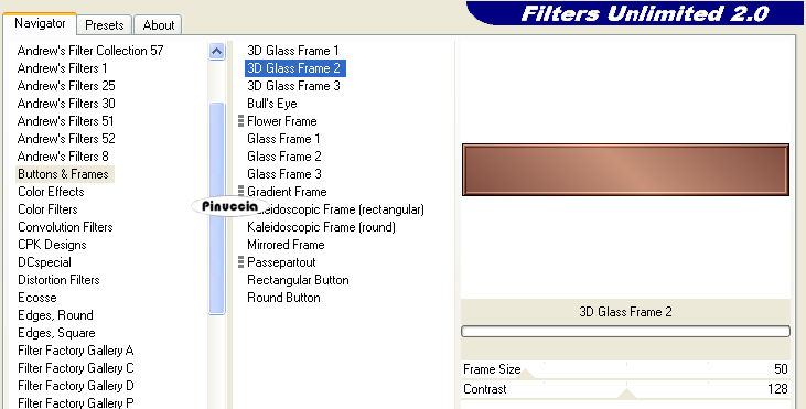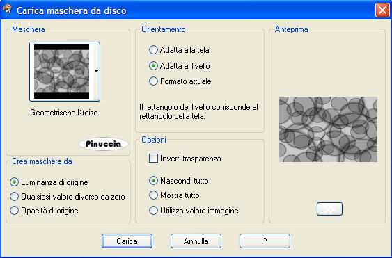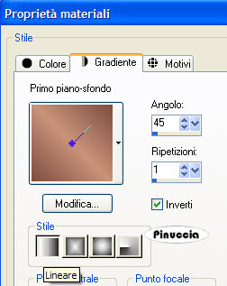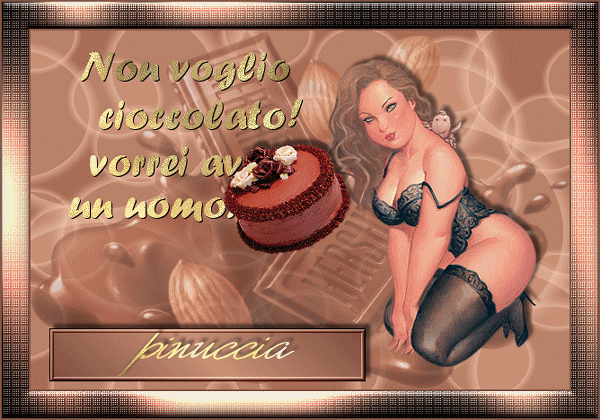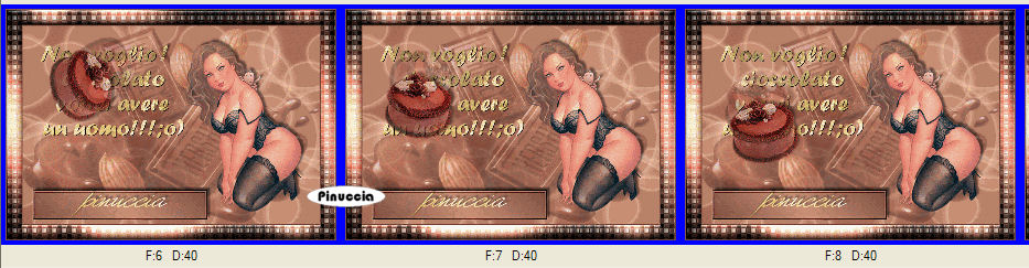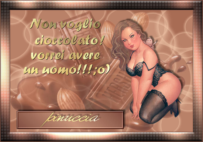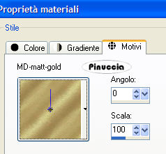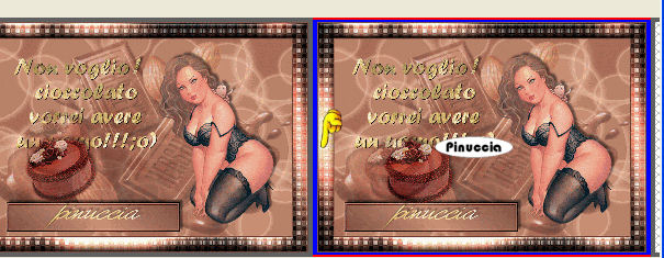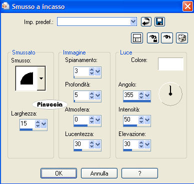 qui puoi trovare qualche risposta ai tuoi dubbi. Se l'argomento che ti interessa non è presente, ti prego di segnalarmelo. Occorrente: Materiale qui Metti la maschera nella cartella Maschere di PSP. Apri il motivo oro MD-Matt-gold e minimizzalo nella tua area di lavoro. Lo troverai nella lista dei motivi disponibili, quando ti servirà. Filtri: FM Tile Tools qui Penta.com qui Graphics Plus qui Filters Unlimited qui Patry, Patries e Caro hanno concesso soltanto l'uso personale dei loro tubes. Non puoi usarli per i tuoi tutorials. Non cambiare il nome del file e non cancellare il livello del copyright. 1. Apri una nuova immagine trasparente 600 x 400 pixels. Selezione>Seleziona tutto. Apri il tube Caro 2093, attiva il livello inferiore (lo sfondo) e vai a Modifica>Copia. Torna alla tua immagine trasparente e vai a Modifica>Incolla>Incolla nella selezione. Selezione>Nessuna selezione. 2. Livelli>Nuovo livello raster. Riempi il livello con il colore #93523c.Livelli>Carica/Salva maschera>Carica maschera da disco. Cerca e carica la maschera Geometrische Kreise: ![]() Livelli>Unisci>Unisci gruppo. Livelli>Unisci>Unisci visibile. ![]() 3. Selezione>Seleziona tutto. Livelli>Nuovo livello raster. Attiva nuovamente il tube caro 2093. Posizionati sul livello del tube e vai a Modifica>Copia. Torna al tuo lavoro e vai a Modifica>Incolla>Incolla nella selezione. Abbassa l'opacità di questo livello al 60%. Selezione>Nessuna selezione. 4. Apri il tube jcgireat13 cherub e vai a Modifica>Copia. Torna al tuo lavoro e vai a Modifica>Incolla>Incolla come nuovo livello. Sposta il tube vicino al bordo destro.Effetti>effetti 3D>Sfalsa ombra: ![]() 5. Livelli>Unisci>Unisci tutto. Immagine>Aggiungi bordatura, 2 pixels, simmetriche, con il colore #825747. 6. Imposta il colore di primo piano con #c89379, e imposta il colore di sfondo con #7f4c40. Passa il colore di primo piano a Gradiente di primo piano/sfondo: ![]() Immagine>Aggiungi bordatura, 30 pixels, simmetriche, con il colore bianco. Seleziona il bordo con la bacchetta magica ![]() (Sfumatura e tolleranza 0). Riempi la selezione con il gradiente.7. Effetti>Plugins>Graphics Plus - Cross Shadow, con i settaggi standard. ![]() Ripeti l'Effetto Cross Shadow. Effetti>Plugins>Penta.com - Dot and Cross, con i settaggi standard. ![]() Effetti>Plugins>FM Tile Tools - Blend Emboss, con i settaggi standard. ![]() Mantieni selezionato. Effetti>Effetti 3D>Smusso a incasso: ![]() 8. Selezione>Nessuna selezione. Immagine>Aggiungi bordatura, 2 pixels, simmetriche, con il colore #825747. 9. Attiva lo strumento Selezione , rettangolo,e disegna un rettangolo a fianco del tube. Livelli>Nuovo livello raster. Riempi la selezione con il gradiente.Mantieni ancora selezionato. Effetti>Plugins>Filters Unlimited - Buttons and Frames - 3D Glass Frame 2: ![]() Selezione>Nessuna selezione. Effetti>Effetti 3D>Sfalsa ombra, con i settaggi usato al passo 4. 10. Imposta il colore di sfondo con il motivo oro MD-Matt-gold: ![]() Chiudi il colore di primo piano. Attiva lo strumento Testo , scegli un font, crea come vettore,e scrivi il tuo nome nella striscia. Livelli>Converti in livello raster. Effetti>Plugins>Graphics Plus - Cross Shadow, con i settaggi standard. Effetti>Effetti 3D>Sfalsa ombra, con i settaggi precedenti. Aggiungi, se vuoi, il tuo watermark alla tag. 11. Livelli>Unisci>Unisci visibile. ![]() Attiva nuovamente lo strumento Testo ,sempre con il colore di sfondo impostato con il motivo oro. Scrivi il tuo testo, una riga alla volta. Per ogni riga: Livelli>Converti in livello raster. Effetti>Plugins>Graphics Plus - Cross Shadow, con i settaggi standard. Effetti>Effetti 3D>sfalsa ombra, con i seguenti settaggi: ![]() Posiziona correttamente le righe del testo.Livelli>Unisci>Unisci visibile. ![]() 12. Apri il tube di Patry Tube06_DrinkandEat e vai a Modifica>Copia. Torna al tuo lavoro e vai a Modifica>Incolla>Incolla come nuovo livello. Immagine>Ridimensiona, al 40%, bicubica, tutti i livelli non selezionato. ![]() Effetti>Effetti 3D>Sfalsa ombra, con i settaggi usati al passo 4. 13. Attiva lo strumento Deformazione .Puntatore se stai usando PSP X.Ruota leggermente la torta sull'immagine e spostala un po' a sinistra. Più o meno così: ![]() Regola>Messa a fuoco>Metti a fuoco. Modifica>Copia unione. Apri Animation Shop. Clicca con il tasto destro del mouse sullo spazio vuoto e Incolla come nuova animazione. ![]() Ritorna in PSP. Sempre con lo strumento Deformazione ![]() ruota ancora la torta e senza spostarla troppo. Più o meno così: ![]() Regola>Messa a fuoco>Metti a fuoco. Modifica>Copia unione. In Animation Shop: Modifica>Incolla>Incolla dopo il seguente fotogramma. Ritorna in PSP, e ripeti le operazioni (rotazione, spostamento, messa a fuoco, copia unione, As incolla dopo il fotogramma corrente), finchè non avrai ottenuto 10 fotogrammi. Per una guida approssimativa, eccoti la mia sequenza dal terzo al decimo fotogramma: ![]() ![]() ![]() Quando hai finito, puoi controllare il movimento della torta cliccando su Visualizza ![]() Sarà però un po' troppo veloce. Dovrai regolare le impostazioni. Clicca sul primo fotogramma per selezionarlo e vai a Modifica>Seleziona tutto. Animazione>Proprietà fotogramma, e imposta la velocità a 40. ![]() Clicca sull'ultimo fotogramma per selezionarlo. Soltanto questo fotogramma deve essere selezionato e soltanto questo deve avere la cornice blu. ![]() Animazione>Proprietà fotogramma, e imposta la velocità a 100. ![]() Salva in formato gif. ![]() Se hai problemi o dubbi, o trovi un link non funzionante, o anche soltanto per un saluto, scrivimi. 12 Giugno 2007 |