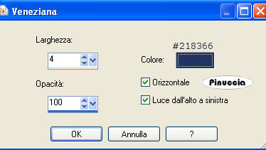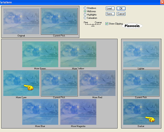 qui puoi trovare qualche risposta ai tuoi dubbi. Se l'argomento che ti interessa non è presente, ti prego di segnalarmelo. Materiale qui Tubes: DaisyWeb_Rudi Reichhard_Boston Lighthouse. MarieL_2006_aout_misted_face074 Daemmerung. Pennello: text3_bp003. Filtri: FM Tile Tools /Blend Emboss qui Bordermania qui Xero qui Adjust qui Animazione: Swirl_Hearts.mng Daisy e MarieL permettono l'utilizzo dei loro tubes soltanto per uso personale. Non potete usarli per i vostri tutorial. Non cambiate il nome dei tubes e non rimuovete il copyright. 1. Apri una nuova immagine trasparente 700 x 500 pixels. Riempila con il colore #c0ccdc.Selezione>Seleziona tutto. Livelli>Nuovo livello raster. 2. Apri il tube "Daemmerung" e vai a Modifica>Copia. Torna al tuo lavoro e vai a Modifica>Incolla nella selezione. Nella paletta dei livelli cambia la modalità di miscelatura in Sovrapponi. 3. Selezione>Deseleziona (se stai usando Psp 9: Selezione>Nessuna selezione). Effetti>Plugins>FM Tile Tools / Blend Emboss, con i settaggi standard: ![]() Ripetilo 2 volte. 4. Apri il tube DaisyWeb_Rudi Reichhard_Boston Lighthouse e vai a Modifica>Copia. Torna al tuo lavoro e vai a Modifica>Incolla come nuovo livello. Immagine>Rifletti. Sposta il tube sulla destra,in modo che la luna sia visibile e che il faro stia sulle rocce. ![]() Nella paletta dei livelli cambia la modalità di miscelatura in Luminanza (Esistente) e abbassa l'opacità al 40%. Effetti>Plugins>FM Tile Tools / Blend Emboss, due volte, con i settaggi standard. 5. Apri il tube MarieL_2006_aout_misted_face074 e vai a Modifica>Copia. Torna al tuo lavoro e vai a Modifica>Incolla come nuovo livello. Nella paletta dei livelli cambia la modalità di miscelatura in Sovrapponi e abbassa l'opacità al 60%. Sposta l'immagine sul lato sinistro,in modo che il braccio si unisca alle rocce. ![]() Effetti>Plugins>FM Tile Tools, Blend emboss, con i settaggi standard. 6. Livelli>Unisci>Unisci visibile. 7. Livelli>Nuovo livello raster. Riempi il nuovo livello con #5e7599.8. Effetti>Effetti di trama>Veneziana, con i seguenti settaggi, colore #213663. ![]() Nella paletta dei livelli cambia la modalità di miscelatura in Luminanza (esistente) e abbassa l'opacità al 30%. Effetti>Plugins>FM Tile Tools, Blend Emboss, con i settaggi standard. Livelli>Unisci>Unisci visibile. Regola>Messa a fuoco>Metti a fuoco. 9. Livelli>Nuovo livello raster. Imposta il colore di primo piano con #213663. Attiva lo strumento Pennello ![]() e seleziona il pennello Text3_bp003 e applicalo in basso a destra. Nella paletta dei livelli abbassa l'opacità al 70%. Se PSP non ti rende disponibile il pennello usa l'espediente descritto qui Effetti>Effetti 3D>Sfalsa ombra, con i seguenti settaggi: ![]() Ripeti l'Effetto Sfalsa ombra, ma cambiando verticale e orizzontale a -1. 10. Livelli>Unisci>Unisci visibile. Effetti>Plugins>Adjust / Variation ![]() Clicca una volta su More Ciano e una volta su Darker. E quindi ok. Avrai questo: 11. Immagine>Dimensione tela ![]() Clicca con la bacchetta magica sul bordo trasparente.Riempilo con #285a8d.Effetti>Plugins>Bordermania / Frame #2: ![]() Selezione>Nessuna selezione. Ripeti Effetti>Plugins>Bordermania / Frame #2, con questi settaggi: ![]() Non dimenticare il tuo watermark. 12. Effetti>Plugins>Xero / Porcelain, con i seguenti settaggi: ![]() Immagine>Ridimensiona, 700 pixels di larghezza. Se non vuoi animare la tag, hai finito. Puoi salvare il tuo blend in formato jpg. ![]() ![]() Se vuoi creare l'animazione copia l'immagine: Modifica>Copia. Apri Animation Shop e vai a Modifica>Incolla come nuova animazione. Apri l'animazione che hai trovato nello zip: Swirl_Hearts.mng. Vedrai che è composta da 21 fotogrammi. Per creare l'animazione anche la tua tag dovrà essere composta da 21 fotogrammi. Attiva la tag e vai a Modifica>Duplica, e ripeti finchè non avrai ottenuti i fotogrammi necessari. Attiva nuovamente lo Swirl_Hearts. Clicca sul primo fotogramma per selezionarlo e vai a Modifica>Seleziona tutto. Quindi Modifica>Copia. Riattiva la tag. Clicca sul primo fotogramma per selezionarlo e vai a Modifica>Seleziona tutto. Quindi Modifica>Incolla>Incolla nel fotogramma selezionato. Se non sei soddisfatto della posizione torna indietro con Modifica>Annulla incolla e ripeti. Per controllare il risultato clicca su Visualizza ![]() Imposta la velocità dell'animazione a 16 e salva in formato gif. ![]() ![]() Se hai problemi o dubbi, o trovi un link non funzionante, o anche soltanto per un saluto, scrivimi. |