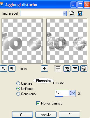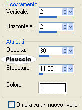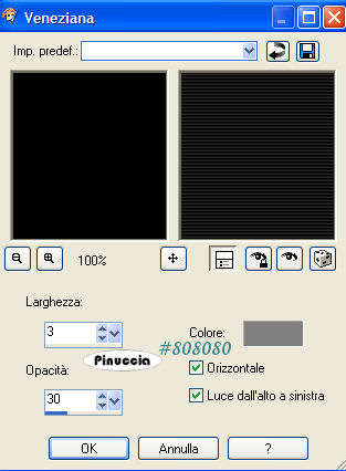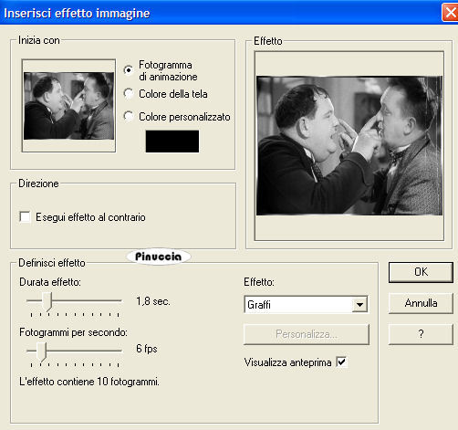qui puoi trovare qualche risposta ai tuoi dubbi. Se l'argomento che ti interessa non è presente, ti prego di segnalarmelo. Occorrente: Materiale qui Filtri: Graphics Plus - Cross Shadow qui 1. Apri una nuova immagine, NERA, 800 x 600 pixels. Per il momento mettila da parte. 2. Apri una nuova immagine trasparente 400 x 300 pixels. Seleziona>Seleziona tutto. Apri l'immagine "Nose" e vai a Modifica>Copia. Torna alla piccola immagine e vai a Modifica>Incolla>Incolla nella selezione. Selezione>Nessuna selezione. Metti da parte per il momento anche questa immagine. Apri una nuova immagine trasparente 400 x 300 pixels. Selezione>Seleziona tutto. Apri l'immagine "Psst" e vai a Modifica>Copia. Torna alla seconda piccola immagine e vai a Modifica>Incolla>Incolla nella selezione. Selezione>Nessuna selezione. Metti da parte anche questa. Puoi chiudere gli originali. 3. Apri una nuova immagine, NERA, 750 x 380 pixels. Effetti>Effetti di trama>Veneziana: ![]() Immagine>Aggiungi bordatura, 5 pixels, simmetriche, con il colore bianco. Seleziona il bordo con la bacchetta magica ![]() e riempilo con il motivo argento.Effetti>Plugins>Graphics Plus - Cross Shadow, con i settaggi standard. ![]() Selezione>Nessuna selezione. ![]() 4. Modifica>Copia. Riprendi la prima immagine nera 800x600 e vai a Modifica>Incolla>Incolla come nuovo livello. Spostala in alto,ma lasciando un po' di spazio sopra e a sinistra. Livelli>Unisci>Unisci visibile. ![]() Attiva lo strumento Testo , font Soopafresh, dimensione 55,e scrivi il testo nella parte inferiore dello sfondo nero. Livelli>Converti in livello raster. 5. Regola>Aggiungi/Rimuovi disturbo>Aggiungi disturbo: ![]() Effetti>Effetti 3D>Sfalsa ombra: ![]() Livelli>Duplica. Immagine>Capovolgi. Sposta il testo sotto l'originale,in modo che sembri riflesso. Abbassa la trasparenza di questo livello al 30%. ![]() 6. Apri il tube "Melone" e vai a Modifica>Copia. Torna al tuo lavoro e vai a Modifica>Incolla>Incolla come nuovo livello. Effetti>Effetti 3d>Sfalsa ombra: ![]() Livelli>Duplica. Immagine>Ridimensiona, all'80%, tutti i livelli non selezionato. Sposta il secondo cappello in primo piano, mentre il più grande resterà sullo sfondo. ![]() 7. Livelli>Nuovo livello raster. Selezione>Seleziona tutto. Riempi con il motivo argento.Selezione>Modifica>Contrai, di 4 pixels. Premi sulla tastiera il tasto CANC. Selezione>Inverti. Effetti>Plugins>Graphics Plus - Cross Shadow, con i settaggi standard. Ripeti l'Effetto Cross Shadow. Livelli>Unisci>Unisci tutto. Aggiungi la tua firma o il tuo watermark. 8. Attiva adesso una delle piccole immagini: Psst. Immagine>Aggiungi bordatura, 3 pixels, simmetriche, con il colore bianco. Seleziona il bordo con la bacchetta magica ![]() e riempilo con il motivo argento.Effetti>Plugins>Graphics Plus - Cross Shadow, con i settaggi standard, due volte. Effetti>Effetti 3D>Sfalsa ombra: ![]() Selezione>Nessuna selezione. Modifica>Copia. 9. Apri Animation Shop. Clicca con il tasto destro del mouse sullo spazio vuoto e Incolla come nuova animazione. Ritorna in PSP. 10. Ripeti il passo 8 con la seconda immagine piccola: "Nose". Quindi Modifica>Copia e di nuovo in Animation Shop Incolla come nuova animazione. 11. Una alla volta attiva le immagini e vai a Animazione>Inserisci effetto immagine - Graffi: ![]() Avrai così due animazioni composte da 11 fotogrammi. 12. Ancora una volta in PSP. Attiva l'immagine più grande e vai a Modifica>Copia. In Animation Shop clicca con il tasto destro del mouse sullo spazio vuoto e Incolla come nuova animazione. 13. Modifica>Duplica e ripeti, finchè anche questa immagine più grande sarà composta da 11 fotogrammi. Clicca sul primo fotogramma e vai a Modifica>Seleziona tutto. 14. Attiva l'animazione con l'immagine "Psst". Clicca sul primo fotogramma e vai a Modifica>Seleziona tutto e poi Modifica>Copia. Torna al tuo lavoro e vai a Modifica>Incolla>Incolla nel fotogramma selezionato. Posiziona l'immagine nel riquadro a sinistra e, quando sei certo di aver trovato la posizione corretta, rilascia il tasto del mouse. 15. Ripeti il passo 14 con l'altra immagine "Nose" e posizionala nel riquadro a destra. 16. Adesso dovrai regolare la velocità della tua animazione, che dovrebbe essere già selezionata. Comunque ripetere non fa mai male: Modifica>Seleziona tutto. Animazione>Proprietà fotogramma e imposta la velocità a 17. ![]() Salva come gif. ![]() Ecco la prova della mia amica Elisa. Grazie Elisa per aver testato la mia traduzione. ![]() Se hai problemi o dubbi, o trovi un link non funzionante, o anche soltanto per un saluto, scrivimi. Gennaio 2007 |