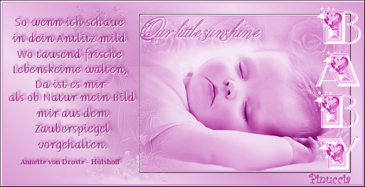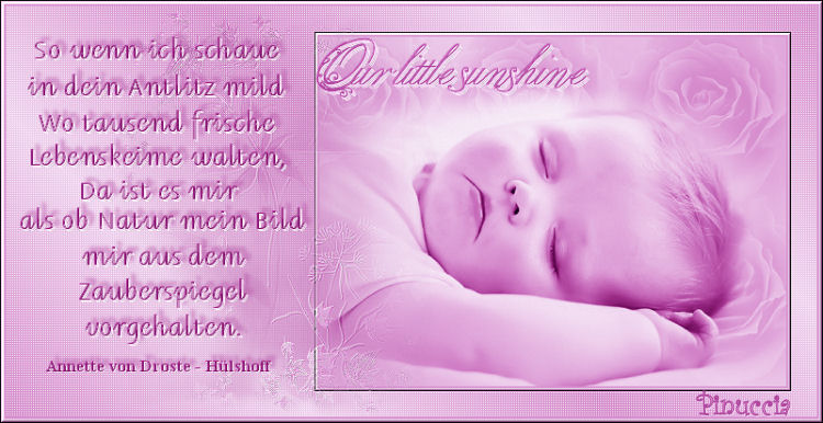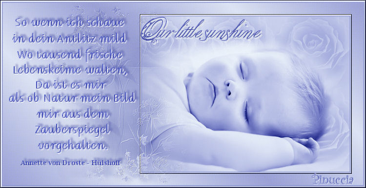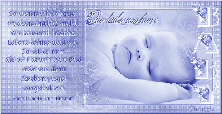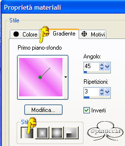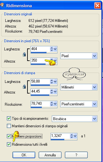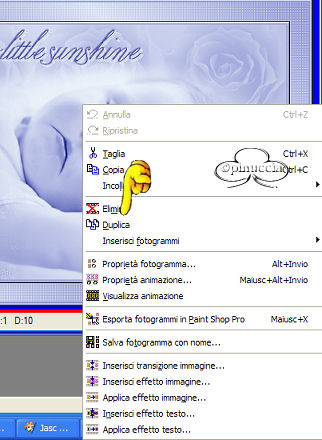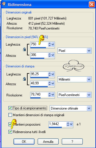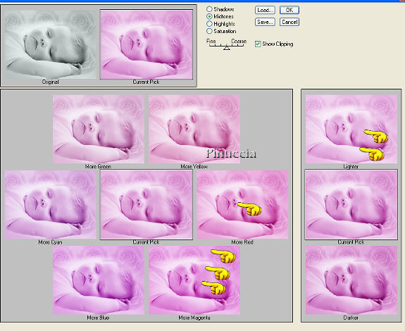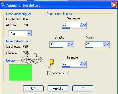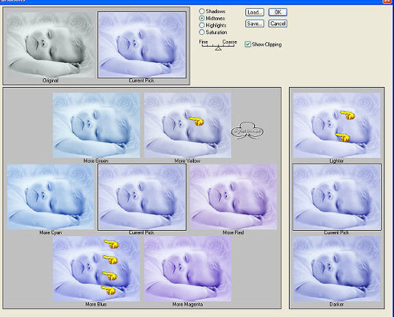 Riempi 2. Apri il tube PatryMists_06_Rose_15 e vai a Modifica>Copia. 3. Sposta 4. Apri il tube SS_Baby_058 di Suzi e vai a Modifica>Copia. 5. Livelli>Unisci>Unisci visibile. 6. Effetti>Plugins>Adjust /Variations: ![]() Per la versione bambina ho cliccato una volta su More Red, 3 volte su More Magenta e 2 volte su Lighter: ![]() Per la versione bambino, ho cliccato una volta su More Yellow, 4 volte su More Blue e 2 volte su Lighter. 7. Scegli dall'immagine un colore chiaro come colore di primo piano e uno scuro come colore di sfondo. 8. Immagine>Aggiungi bordatura, 2 pixels, simmetriche, con il colore scuro. 9. Selezione>Seleziona tutto. 10. Immagine>Ridimensione, a 350 pixels di altezza: 11. Immagine>Aggiungi bordatura, simmetriche non selezionato, con un colore qualsiasi, purchè sia diverso dai colori dell'immagine : Seleziona il bordo con la bacchetta magica Passa il colore di primo piano a gradiente di primo piano/sfondo, stile lineare: ![]() Riempi Mantieni selezionato. 12. Effetti>Plugins>Penta.com / Color dot, settaggi standard: ![]() Regola>Messa a fuoco>Metti a fuoco. Selezione>Nessuna selezione. 13. Ripeti i passi 8 e 9. 14. Livelli>Nuovo livello raster. ![]() 15. Imposta il colore di sfondo con il colore scuro che hai scelto per applicare il pennello. 16. Regola>Messa a fuoco>Metti a fuoco. 17. Apri il tube del testo ("Texttube Girl" o "Texttube Boy") e vai a Modifica>Copia. 18. Immagine>Ridimensiona, a 750 pixels di larghezza. ![]() Se non vuoi animare, hai finito. Salva in formato jpg. ![]() ![]() Per creare l'Animazione Modifica>Copia. Apri Animation Shop. Clicca con il tasto destro del mouse sullo spazio vuoto e Incolla come nuova animazione. ![]() (puoi anche fare Modifica>Incolla>Incolla come nuova animazione) Clicca con il tasto destro del mouse sulla tag e scegli Duplica. ![]() (puoi anche fare Modifica>Duplica.) Ripeti Duplica, finchè non avrai una tag con 3 fotogrammi. Apri i file A1, B1, Y1 se stai usando la versione bambino, oppure A2, B2, Y2, se stai usando la versione bambina. ![]() Modifica>Seleziona tutto e poi Modifica>Copia. ![]() Per controllare il risultato clicca su Visualizza ![]() Salva in formato gif. ![]() ![]() Se hai problemi o dubbi, o trovi un link non funzionante, o anche soltanto per un saluto, scrivimi. Settembre 2006 |