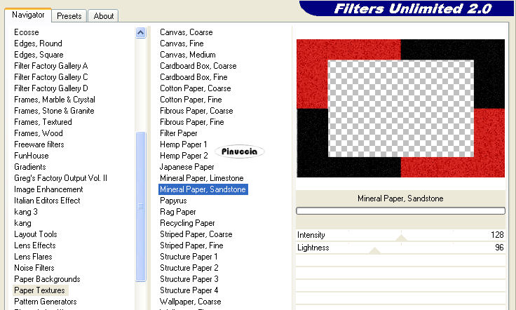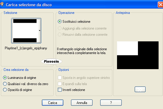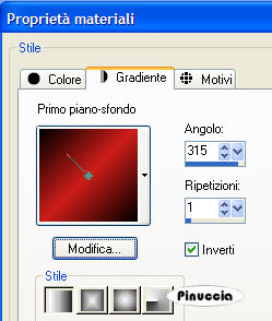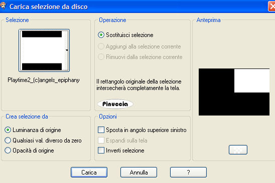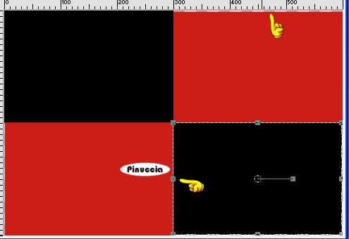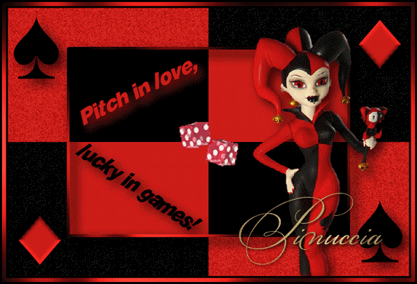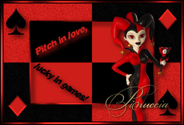 qui puoi trovare qualche risposta ai tuoi dubbi. Se l'argomento che ti interessa non è presente, ti prego di segnalarmelo. Occorrente: Materiale qui Metti le Selezioni nella cartella Selezioni di PSP. Apri il Motivo oro MD-matt-gold e minimizzalo nella tua area di lavoro. Lo troverai nella lista dei motivi disponibili, quando ne avrai bisogno. Apri il font e minimizzalo nella tua area di lavoro. Lo troverai nella lista dei font disponibili quando userai lo strumento Testo. Filtri: Filters Unlimited qui Graphics Plus qui Patry ha concesso soltanto l'uso personale dei suoi tubes. Non puoi usarli per i tuoi tutorial. Non cambiare il nome del file e non cancellare il livello del copyright. 1. Apri una nuova immagine trasparente 600 x 400 pixels. Livelli>Nuovo livello raster. 2. Selezione>Carica/Salva selezione>Carica selezione da disco: Cerca e carica la selezione Playtime1_(c)angels epiphany: ![]() Riempi la selezione con il nero.Selezione>Nessuna selezione. 3. Livelli>Nuovo livello raster. Selezione>Carica/Salva selezione>Carica selezione da disco: cerca e carica la selezione Playtime2_(c)angels epiphany: ![]() Riempi la selezione con il colore #cd1e19.Selezione>Nessuna selezione. 4. Livelli>Nuovo livello raster. Selezione>Carica/Salva selezione>Carica selezione da disco. Cerca e carica la selezione Playtime3_(c)angels epiphany. Riempi ancora una volta con il colore rosso #cd1e19.Selezione>Nessuna selezione. Livelli>Nuovo livello raster. Selezione>Carica/Salva selezione>Carica selezione da disco. Cerca e carica la selezione Playtime4_(c)angels epiphany. Riempi la selezione con il nero.Selezione>Nessuna selezione. Se i singoli quadrati non sono correttamente posizionati e vedi degli spazi tra di loro, attiva lo strumento Deformazione ![]() Puntatore se stai usando PSP X.e "tira" i nodi per sistemarli. ![]() 5. Chiudi il livello di sfondo, posizionati su uno degli altri livelli e vai a Livelli>Unisci>Unisci visibile. 6. Adesso puoi rendere nuovamente visibile il livello inferiore. Attiva il livello superiore (Uniti). Immagine>Ridimensiona, al 70%, ricampionamento ridimensionamento pixel, tutti i livelli non selezionato. Modifica>Copia. 7. Clicca con la bacchetta magica sul bordo trasparente.Livelli>Nuovo livello raster. Modifica>Incolla>Incolla nella selezione. Selezione>Nessuna selezione. Immagine>Rifletti. 8. Effetti>Plugins>Paper Textures - Mineral Paper - Sandstone: ![]() 9. Livelli>Disponi>Sposta giù. ![]() Ritorna sul livello superiore (i quadrati). Selezione>Seleziona tutto. Selezione>Mobile. Selezione>Immobilizza. Selezione>Modifica>Seleziona bordature selezione: ![]() Livelli>Nuovo livello raster. 10. Con il colore rosso impostato come primo piano, e il colore nero come colore di sfondo, crea un gradiente di primo piano/sfondo: ![]() Riempi la selezione con questo gradiente.11. Mantieni selezionato. Effetti>Plugins>Graphics Plus - Cross Shadow, con i settaggi standard: ![]() Ripeti l'Effetto Cross Shadow. Effetti>Effetti 3D>Sfalsa ombra: ![]() Livelli>Unisci>Unisci giù. Effetti>Effetti 3D>Sfalsa ombra, con i settaggi precedenti. Livelli>Unisci>Unisci giù. ![]() 12. Apri il tube Karo_Form by angels epiphany e vai a Modifica>Copia. Torna al tuo lavoro e vai a Modifica>Incolla>Incolla come nuovo livello. Spostalo nell'angolo in alto a destra.Effetti>Effetti 3D>Sfalsa ombra, con i settaggi precedenti. Livelli>Duplica. Immagine>Capovolgi. Immagine>Rifletti. 13. Apri il tube Pik_Form by angels epiphany e vai a Modifica>Copia. Torna al tuo lavoro e vai a Modifica>Incolla>Incolla come nuovo livello. Spostalo nell'angolo in alto a sinistra.Effetti>Effetti 3D>sfalsa ombra, con i settaggi precedenti. Livelli>Duplica. Sposta il secondo tube nell'angolo in basso a destra.14. Livelli>Unisci>Unisci visibile. ![]() Apri ora il tube PatryTubes_06_Goth_32 e vai a Modifica>Copia. Torna al tuo lavoro e vai a Modifica>Incolla>Incolla come nuovo livello. Immagine>Ridimensiona, all'80%, ricampionamento ridimensionamento pixel, tutti i livelli non selezionato. Effetti>Effetti 3D>Sfalsa ombra, con i settaggi precedenti. sposta il tube sul lato destro.![]() 15. Imposta il colore di primo piano con il nero, e il colore di sfondo con il rosso. Attiva lo strumento Testo ![]() Seleziona il font Soopafresh, dimensione 24, corsivo, pennellata 1, crea come vettore. Scrivi nel quadrato nero la prima frase. Usando i nodi vettori, ruotala un po' verso destra. Livelli>Converti in livello raster. Effetti>Effetti 3D>Sfalsa ombra, con i settaggi precedenti, ma con il colore dell'ombra #cd1e19. 16. Inverti i colori nella paletta dei materiali, cliccando sulla freccia tra le due palette. ![]() Scrivi la seconda frase nel quadrato rosso in basso. Di nuovo, ruota la frase usando i nodi vettori. Livelli>Converti in livello raster. Effetti>Effetti 3D>Sfalsa ombra, con i settaggi precedenti, colore dell'ombra nero. 17. Scegli un altro font. Imposta il colore di sfondo con il motivo Oro, e chiudi il colore di primo piano. Scrivi il tuo nome in basso a destra (o dove preferisci). Livelli>Converti in livello raster. Effetti>Effetti 3D>Sfalsa ombra: ![]() Aggiungi, se vuoi, il tuo watermark su un nuovo livello. 18. Livelli>Unisci>Unisci tutto. Immagine>Aggiungi bordatura, 3 pixels, simmetriche, con il colore nero. Immagine>Aggiungi bordatura, 6 pixels, simmetriche, con il colore rosso. Immagine>Aggiungi bordatura, 3 pixels, simmetriche, con il colore nero. 19. Selezione>Seleziona tutto. Selezione>Modifica>Contrai, di 12 pixels. Selezione>Inverti. Effetti>Plugins>Graphics Plus - Cross Shadow, con i settaggi standard. ![]() Ripeti l'Effetto Cross Shadow. Selezione>Nessuna selezione. ![]() Modifica>Copia. Apri Animation Shop. Clicca con il tasto destro del mouse sullo spazio vuoto e Incolla come nuova animazione. ![]() Modifica>Duplica e ripeti finchè la tua immagine non sarà composta da 7 fotogrammi. Clicca sul primo fotogramma per selezionarlo e vai a Modifica>Seleziona tutto. Apri l'animazione che hai trovato nello zip: wuerfe