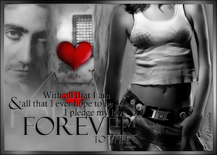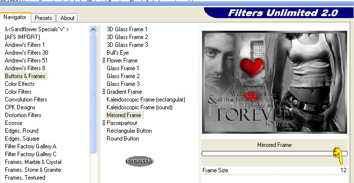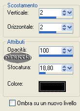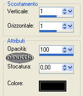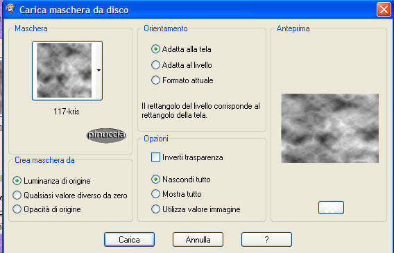 qui puoi trovare qualche risposta ai tuoi dubbi. Se l'argomento che ti interessa non è presente, ti prego di segnalarmelo. Occorrente: Materiale: qui Metti le maschere nella cartella Maschere. Filtri: Graphics Plus qui Filters Unlimited qui Xero - Porcelain qui in caso di problemi, qui trovi alcuni appunti. Se non hai trovato la risposta che cercavi, per favore, fammelo sapere. 1. Apri una nuova immagine trasparente 700 x 500 pixels. Imposta il colore di primo piano su #b2b2b2, e il colore di sfondo su #717171. Riempi con il colore di primo piano.Livelli>Nuovo livello raster. Riempi con il colore di sfondo.2. Livelli>Carica/Salva maschera>Carica maschera da disco. Cerca e carica la maschera 117-kris: ![]() Livelli>Unisci>Unisci gruppo. 3. Apri il tube "Stairs" e vai a Modifica>Copia. Torna al tuo lavoro e vai a Modifica>Incolla>incolla come nuovo livello. Spostalo in alto a sinistra.Nella paletta dei livelli cambia la modalità di miscelatura in Luminanza (esistente). Apri il tube fredo-design-243 e vai a Modifica>Copia. Torna al tuo lavoro e vai a Modifica>Incolla>Incolla come nuovo livello. Spostalo sulla destra.Cambia la modalità di miscelatura di questo livello in Luminanza (esistente). ![]() 4. Apri il tube bsc~celeb~jakegyllenhaal006 e vai a Modifica>Copia. Torna al tuo lavoro e vai a Modifica>Incolla>Incolla come nuovo livello. Immagine>Rifletti. Immagine>Ridimensiona, dell'80%, tutti i livelli non selezionato: ![]() 5. Livelli>Carica/Salva maschera>Carica maschera da disco. Cerca e carica la maschera 20-20, con i seguenti settaggi: ![]() Sposta il tube nell'angolo in alto a sinistra.Livelli>Unisci>Unisci gruppo. Cambia la modalità di miscelatura di questo livello in Luminanza (Esistente), e abbassa l'opacità al 70%. 6. Apri il tube kt_heart-bleeds e vai a Modifica>Copia. Torna al tuo lavoro e vai a Modifica>Incolla>Incolla come nuovo livello. Immagine>Ridimensiona, dell'80%, tutti i livelli non selezionato. ![]() Spostalo sui gradini.Effetti>Effetti 3D>Sfalsa ombra, con i seguenti settaggi: ![]() 7. Apri il tube Textube Forever_To_Thee e vai a Modifica>Copia. Torna al tuo lavoro e vai a Modifica>Incolla>Incolla come nuovo livello. Spostalo sotto il cuore.Effetti>Effetti 3D>Sfalsa ombra, con i seguenti settaggi: ![]() 8. Controlla che tutto sia al suo posto. Se necessario, puoi ancora spostare gli elementi della tag per sistemarli meglio. Livelli>Unisci>Unisci tutto. 9. Selezione>Seleziona tutto. Selezione>Modifica>Contrai di 12 pixels. Effetti>Effetti 3D>Sfalsa ombra, con i seguenti settaggi: ![]() Ripeti l'Effetto Sfalsa ombra, ma cambiando verticale e orizzontale a -1. Selezione>Nessuna selezione. Selezione>Inverti. 10. Regola>Sfocatura>Sfocatura gaussiana, raggio 40. Mantieni selezionato. 11. Effetti>Plugins>Graphics Plus - Cross Shadow, con i settaggi standard. ![]() Mantieni ancora selezionato. Effetti>Plugins>Filters Unlimited / Buttons and Frames, Mirrored Frame, Frame Size 12: ![]() Effetti>Effetti di bordo>Aumenta. 12. Selezione>Nessuna selezione. Immagine>Aggiungi bordatura, 1 pixel, simmetriche, con il colore nero (#000000). Effetti>Plugins>Xero - Porcelain, con i seguenti settaggi: ![]() 13. Non dimenticare di firmare. Salva in formato jpg. ![]() Se hai problemi o dubbi, o trovi un link non funzionante, o anche soltanto per un saluto, scrivimi. Novembre 2006 |