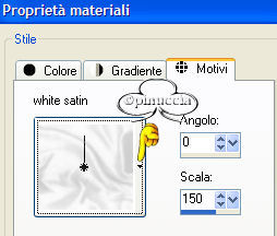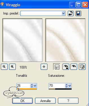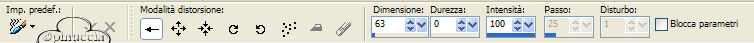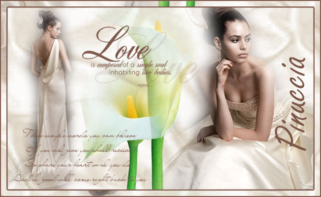 qui puoi trovare qualche risposta ai tuoi dubbi. Se l'argomento che ti interessa non è presente, ti prego di segnalarmelo. Occorrente: Materiale qui Tubes: Satin_1 e Satin_2, Calla1 e Calla2, i Pennelli Love_is e Neutraltekst. il motivo White Satin. Filtro Unlimited 2 qui Importa i pennelli in PSP (sull'uso dei pennelli vedi qualche appunto qui Metti il Motivo nella cartella dei Motivi. Tutti i tubes di questo tutorial sono stati salvati sul livello del watermark. Ricordati di posizionarti sul livello del tube prima di copiarli. 1. Apri una nuova immagine trasparente 650 x 400 pixels. Apri il file White Satin e minimizzalo. In tal modo lo troverai nella lista dei motivi disponibili nella paletta dei Materiali. Imposta il colore di primo piano a Motivi. Apri il menu cliccando sulla freccetta a fianco del box e seleziona White Satin, con i seguenti settaggi: ![]() Riempi l'immagine con questo Motivo.Regola>Saturazione e Tonalità>Viraggio: ![]() 2. Attiva lo strumento Pennello distorsione , con i seguenti settaggi:![]() ![]() "Spingi" un po' il Satin con piccoli colpi, in modo da dargli un piacevole effetto ondulato. Assicurati che non ci siano vuoti, perchè dopo non potrai più ritoccarli. ![]() 3. Apri il tube Satin_2 e vai a Modifica>Copia. Torna al tuo lavoro e vai a Modifica>Incolla>Incolla come nuovo livello. A questo punto ti potrebbe apparire un messaggio di Azione automatica ![]() Clicca ok e il programma eseguirà l'azione necessaria per continuare il lavoro. Immagine>Ridimensiona, all'80%, tutti i livelli non selezionato: ![]() Spostalo a destra.![]() 4. Apri il tube Satin_1 e vai a Modifica>Copia. Torna al tuo lavoro e vai a Modifica>Incolla>Incolla come nuovo livello. Immagine>Ridimensiona, al 70%, bicubica, tutti i livelli non selezionato. Spostalo a sinistra.5. Apri il tube Calla2 e vai a Modifica>Copia. Torna al tuo lavoro e vai a Modifica>Incolla>Incolla come nuovo livello. Spostalo vicino al tube della donna a destra.Apri il tube Calla1 e vai a Modifica>Copia. Torna al tuo lavoro e vai a Modifica>Incolla>Incolla come nuovo livello. Spostalo prima dell'altro fiore.Se necessario, puoi spostare un po' i vari tubes per sistemarli meglio. Livelli>Unisci>Unisci visibile. ![]() 6. Livelli>Nuovo livello raster. Imposta il colore di primo piano con #7d5848. Attiva lo strumento Pennello ![]() cerca e seleziona il pennello Neutraletekst, dimensione 300, e applicalo sulla sinistra. Livelli>Nuovo livello raster. Cerca e seleziona il pennello Love_IS, e applicalo, dimensione 250, sopra i fiori. 7. Livelli>Unisci>Unisci visibile. Imposta il colore di sfondo su #7d5848 e chiudi il colore di primo piano. Attiva lo strumento Testo , cerca un bel font,