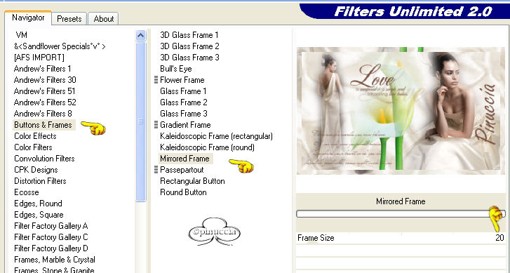 come vettore, e scrivi il tuo nome.Immagine>Ruota>Ruota per gradi, 90 gradi a sinistra, tutti i livelli non selezionato. ![]() Sposta il nome sul lato destro. Livelli>Converti in Livello raster. Aggiungi, se vuoi, il tuo watermark. Livelli>Unisci>Unisci visibile. 8. Effetti>Plugins>Filters Unlimited - Buttons and Frames - Mirrored Frame: ![]() Selezione>Seleziona tutto. Selezione>Modifica>Contrai, di 15 pixels. Selezione>Modifica>Seleziona bordature selezione: ![]() Riempi con #7d5848.Tip: Una nuova selezione,deseleziona automaticamente la precedente. Selezione>Seleziona tutto. Selezione>Modifica>Contrai, di 2 pixels. Selezione>Inverti. Riempi con #7d5848.Salva in formato jpg. ![]() Se hai problemi o dubbi, o trovi un link non funzionante, o anche soltanto per un saluto, scrivimi. Gennaio 2007 |