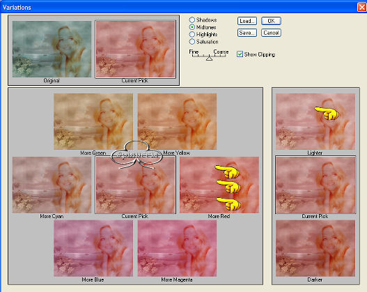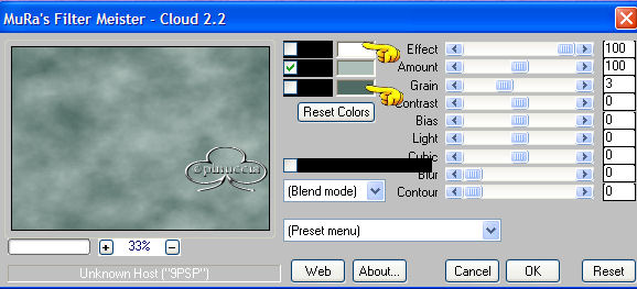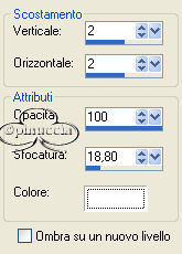 qui puoi trovare qualche risposta ai tuoi dubbi. Se l'argomento che ti interessa non è presente, ti prego di segnalarmelo. Occorrente: Materiale qui Metti le maschere nella cartella Maschere. Filtri: Adjust Variations qui Mura's Meister qui Bordermania qui 1. Apri una nuova immagine trasparente 700x500 pixels. Imposta il colore di primo piano con #aebeb9, e il colore di sfondo con #4f6b64. 2. Riempi l'immagine con il colore di sfondo.Effetti>Plugins>Mura's Meister - Cloud: ![]() Selezione>Seleziona tutto. Livelli>Nuovo livello raster. Apri il tube Marif_2006_septembre_misted_paysage14 e vai a Modifica>Copia. Torna al tuo lavoro e vai a Modifica>Incolla>Incolla nella selezione. Selezione>Nessuna selezione. Abbassa l'opacità di questo livello al 60%. Sposta questo livello sulla sinistra.![]() 3. Apri il tube KaraT3295 e vai a Modifica>Copia. Torna al tuo lavoro e vai a Modifica>Incolla>incolla come nuovo livello. Immagine>Ridimensiona, del 70%, tutti i livelli non selezionato: ![]() Livelli>Carica/Salva maschera>Carica maschera da disco, cerca e carica la Maschera 20-20: ![]() Livelli>Unisci>Unisci gruppo. Nella paletta dei livelli cambia la modalità di miscelatura in Luce diffusa. Sposta il tube nell'angolo in basso a sinistra.4. Apri il tube HeatherGraham-misted-10-618741 e vai a Modifica>Copia. Torna al tuo lavoro e vai a Modifica>Incolla>Incolla come nuovo livello. Spostalo sul lato destro.Cambia la modalità di miscelatura in Moltiplica. Livelli>Unisci>Unisci visibile. ![]() 5. Livelli>Nuovo livello raster. Riempilo con il colore di primo piano (#aebeb9).Livelli>Carica/Salva maschera>Carica maschera da disco, cerca e carica la maschera 0.153-wicked: ![]() Livelli>Unisci>Unisci gruppo. Cambia la modalità di miscelatura di questo livello in Luce diffusa. 6. Livelli>Unisci>Unisci visibile. Effetti>Plugins>FM Tile Tools - Blend Emboss, con i settaggi standard: ![]() 7. Effetti>Plugins>Variations. Qui puoi un po' giocare con i settaggi a tuo piacimento. Io ho cliccato 3 volte su More Red e 1 volta su Lighter. ![]() 8. Scegli dalla tua immagine un colore scuro come colore di sfondo, e un colore chiaro come colore di primo piano. Selezione>Seleziona tutto. Selezione>Modifica>Contrai, di 8 pixels. Selezione>Inverti. Riempi la selezione con il colore scuro.Selezione>Seleziona tutto. Selezione>Modifica>Contrai di 6 pixels. Selezione>Inverti. Riempi con il colore chiaro.Selezione>Seleziona tutto. Selezione>Modifica>Contrai di 2 pixels. Selezione>Inverti. Riempi con il colore scuro.Selezione>Nessuna selezione. 9. Effetti>Plugins>Bordermania - Frame #2: ![]() Aggiungi il tuo watermark al blend. 10. Imposta il colore di primo piano con il colore scuro, e il colore di sfondo con il bianco. Attiva lo strumento Testo , scegli un bel font,e scrivi un testo, stile vettore, sul lato sinistro. Livelli>Converti in livello raster. Effetti>Effetti 3D>Sfalsa ombra, con i seguenti settaggi, colore bianco: ![]() 11. Livelli>Duplica e duplica questo livello tre volte. Avrai in totale quattro livelli testo. Chiudi i tre livelli superiori e posizionati sul primo livello. Abbassa l'opacità al 20%. Di seguito: posizionati sul secondo e abbassa l'opacità al 50%, posizionati sul terzo e abbassa l'opacità al 70%, lascia il quarto con l'opacità al 100%. 12. Posizionati sul livello di sfondo e duplicalo 3 volte (Livelli>Duplica). Chiudi tutti i livelli tranne il primo livello sfondo e il primo livello testo. Livelli>Unisci>Unisci visibile. Chiudi questo livello uniti. Apri il secondo livello di sfondo e il secondo livello di testo. Posizionati su uno dei due e vai a Livelli>Unisci>Unisci visibile. Chiudi questo livello uniti. Apri il terzo livello di sfondo e il terzo livello di testo. Posizionati su uno dei due e vai a Livelli>Unisci>Unisci visibile. Chiudi questo terzo livello uniti. Apri il quarto livello di sfondo e il terzo livello di testo. Posizionati su uno dei due e vai a Livelli>Unisci>Unisci visibile. 13. A questo punto avrai quattro livelli uniti. Apri tutti i livelli e salva in formato psp. 14. Apri Animation Shop. Apri l'immagine che hai appena salvato. Vedrai un'animazione composta da quattro fotogrammi. Posizionati sul primo fotogramma. Clicca su questo fotogramma per selezionarlo. Modifica>Seleziona tutto. Animazione>Proprietà animazione, e imposta la velocità a 50. Clicca sull'ultimo fotogramma per selezionarlo. Animazione>Proprietà animazione, e imposta la velocità a 150. 15. Clicca nuovamente sul primo fotogramma e vai a Modifica>Seleziona tutto. Modifica>Copia. Modifica>Incolla>Incolla come nuova animazione. Clicca sul primo fotogramma di questa nuova animazione e vai a Modifica>Seleziona tutto. Animazione>Inverti fotogrammi. Modifica>Copia. Ritorna al tuo lavoro originale. Clicca sull'ultimo fotogramma e vai a Modifica>Incolla>Incolla dopo il fotogramma corrente. 16. Adesso clicca sul fotogramma numero 5 ed eliminalo. ![]() per eliminare un fotogramma puoi scegliere tra: Modifica>Elimina. Premi sulla tastiera il tasto canc. Clicca con il tasto destro del mouse e scegli Elimina. 17. Salva in formato gif. ![]() ![]() Se hai problemi o dubbi, o trovi un link non funzionante, o anche soltanto per un saluto, scrivimi. Ottobre 2006 |