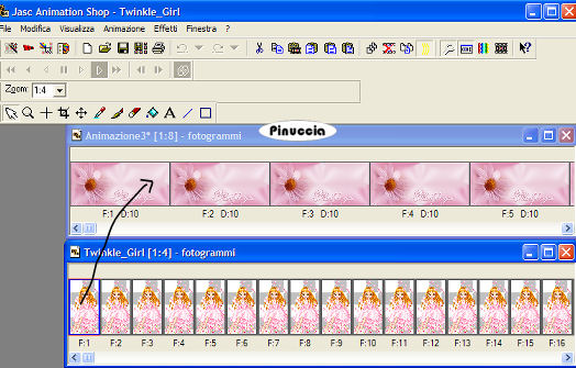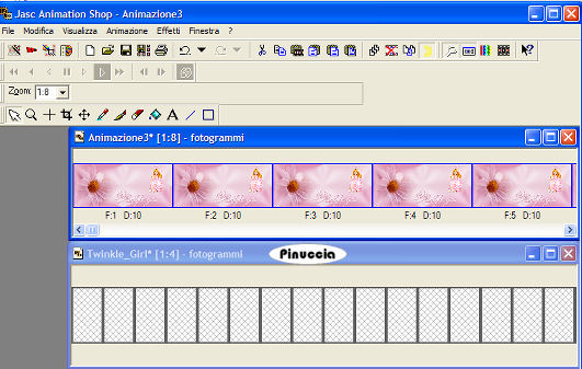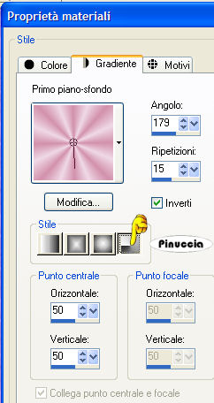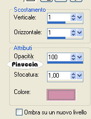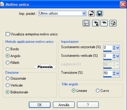 qui puoi trovare qualche risposta ai tuoi dubbi. Se l'argomento che ti interessa non è presente, ti prego di segnalarmelo. Occorrente: Materiale qui Nello zip: Il tube 11-3-06floral-sw, l'animazione Twinkle_Girl.mng, il font Venski Sad Two. Filtro Penta.com qui 1. Apri una nuova immagine trasparente 1024 x 450 pixels. Imposta il colore di primo piano con #efd9e7, e il colore di sfondo con #d291aa. 2. Passa il colore di primo piano a Gradiente di primo piano/sfondo: ![]() Riempi l'immagine trasparente con questo gradiente.3. Regola>Sfocatura>Sfocatura gaussiana, raggio 15. ![]() 4. Livelli>Nuovo livello raster. Riempi il nuovo livello con il colore di sfondo.Cambia la modalità di miscelatura con Überlagern. Effetti>Plugins>Penta.com - Color dot, con i settaggi standard. ![]() Regola>Messa a fuoco>Metti a fuoco. 5. Abbassa l'opacità di questo livello al 50%. Livelli>Unisci>Unisci visibile. 6. Effetti>Effetti di immagine>Motivo unico. ![]() 7. Apri il tube 11-3-06floral-sw e vai a Modifica>Copia. Torna al tuo lavoro e vai a Modifica>Incolla>Incolla come nuovo livello. Immagine>Rifletti. sposta il tube a sinistra.![]() 8. Imposta i colori di primo piano e sfondo con il bianco. Attiva lo strumento Testo e seleziona il font Venski Sad Two.Crea come vettore, B per bold, dimensione 75 pixels. Scrivi il tuo testo e posizionalo. Livelli>Converti in livello raster. Effetti>Effetti 3D>Sfalsa ombra, con i seguenti settaggi e con il colore di sfondo. ![]() Ripeti l'Effetto Sfalsa ombra 4 volte (Modifica>Ripeti Sfalsa ombra). 9. Aggiungi il tuo nome e/o il tuo watermark. ![]() Livelli>Unisci>Unisci tutto. 10. Modifica>Copia. Apri Animation Shop. Clicca con il tasto destro del mouse sullo spazio vuoto e Incolla come nuova animazione. ![]() Livelli>Duplica, e ripeti finchè non avrai 19 fotogrammi. Clicca sul primo fotogramma per selezionarlo e vai a Modifica>Seleziona tutto. 11. Apri Twinkle_Girl.mng. Modifica>Seleziona tutto. per una migliore visuale delle immagini aperte in Animation usa la rotellina del mouse. Portandola indietro l'immagine rimpicciolisce. 12. Tenendo premuto il tasto sinistro del mouse, trascina il primo fotogramma della gif sul primo fotogramma del tuo lavoro. ![]() Quando hai trovato la posizione corretta rilascia il tasto del mouse, attendi qualche secondo e vedrai l'animazione incollata su tutti i fotogrammi. ![]() Salva in formato gif. ![]() Se hai problemi o dubbi, o trovi un link non funzionante, o anche soltanto per un saluto, scrivimi. 3 Luglio 2007 |