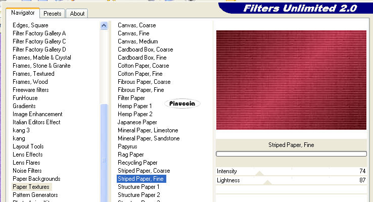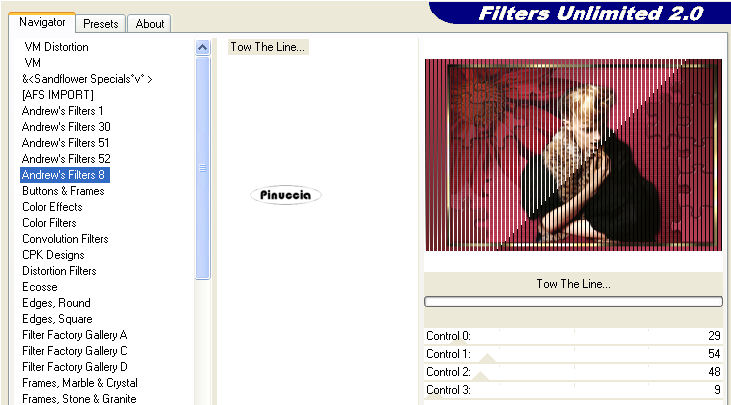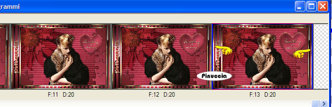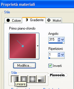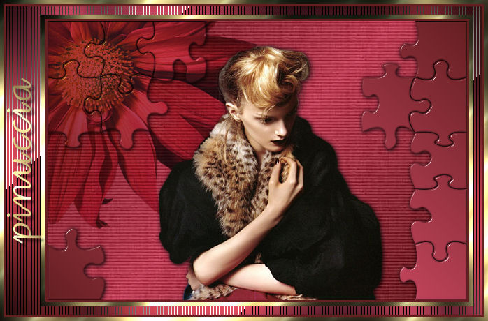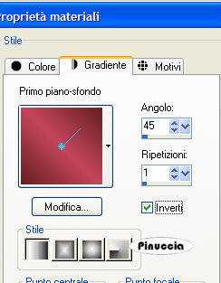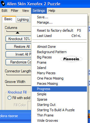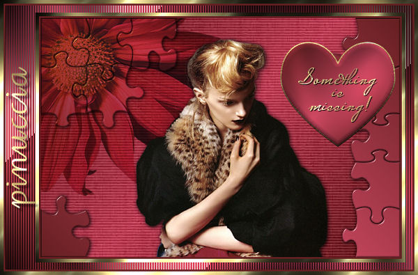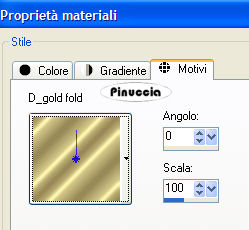 qui puoi trovare qualche risposta ai tuoi dubbi. Se l'argomento che ti interessa non è presente, ti prego di segnalarmelo. Occorrente: Materiale qui Nello zip trovi i tubes di Filly Flowers(32) e (100), il tube Missing heart, il motivo oro Goldfold, il font ABC_Schrift_drei_ef, l'animazione Missing_heart.mng. Filtri: Filters Unlimited qui Graphics Plus qui Alien Skin Xenofex2 qui Andrew's Filter 8 qui I filtri Andrew's 8, prima di essere usati devono essere convertiti. Come fare vedi qui Filly ha concesso l'uso soltanto personale dei suoi tubes. Non potete usarli per i vostri tutorials. Non cambiate il nome del file e non cancellate il livello del copyright. Per tradurre questo tutorial, l'ho eseguito con PSP X. 1. Apri una nuova immagine trasparente 600 x 400 pixels. Imposta il colore di primo piano con #c4455d, e il colore di sfondo con #651f21. Passa il colore di primo piano a Gradiente di primo piano/sfondo, stile lineare: ![]() Riempi l'immagine trasparente con questo gradiente.Effetti>Plugins>Filters Unlimeted, Paper Textures, Striped Paper Fine: ![]() 2. Livelli>Nuovo livello raster. Cambia i settaggi del gradiente a 45 gradi. ![]() Riempi il nuovo livello con questo gradiente.Effetti>Plugins>Alien Skin - Xenofex2 - Puzzle: apri il menu di Setting e imposta su Progress: ![]() ![]() Effetti>Effetti 3D>Sfalsa ombra, con i seguenti settaggi: ![]() ![]() 3. Apri il tube di Filly Flowers (32) e vai a Modifica>Copia. Torna al tuo lavoro e vai a Modifica>Incolla come nuovo livello. Immagine>Rifletti. Immagine>Ridimensiona, all'80%, tutti i livelli non selezionato, ricampionamento bicubica. ![]() Spostalo nell'angolo in alto a sinistra.Cambia la modalità di miscelatura di questo livello in Moltiplica, e abbassa l'opacità al 75%. ![]() 4. Apri il tube Filly (100) e vai a Modifica>Copia. Torna al tuo lavoro e vai a Modifica>Incolla come nuovo livello. Spostalo al centro sopra il puzzle.![]() Effetti>Effetti 3D>Sfalsa ombra: ![]() 5. Livelli>Unisci>Unisci tutto. 6. Immagine>Aggiungi bordatura, 3 pixels, simmetriche, con il colore scuro di sfondo. Immagine>Aggiungi bordatura, 6 pixels, simmetriche, con il colore bianco. Seleziona il bordo bianco con la bacchetta magica ![]() Apri il motivo oro che hai trovato nello zip e minimizzalo. Imposta il colore di primo piano su Motivi, apri il menù cliccando sulla freccia a fianco del box, cerca e seleziona il motivo GoldFold: ![]() Riempi la selezione con questo motivo.Effetti>Plugins>Graphics Plus, Cross Shadow, con i settaggi standard: ![]() Ripeti l'Effetto Cross Shadow. Selezione>Deseleziona. 7. Immagine>Aggiungi bordatura, con un colore qualsiasi, purchè non presente nell'immagine, simmetriche, non selezionato: ![]() Seleziona il bordo con la bacchetta magica .e riempilo con l'ultimo gradiente (angolo 45).![]() 8. Effetti>Plugins>Andrews Filter 8, Tow The Line, con i settaggi standard: questo filtro dovrebbe essere importato nel filtro Unlimited. come fare vedi qui ma può funzionare anche da solo. ![]() Mantieni selezionato. Effetti>Plugins>Graphics Plus - Cross Shadow, con i settaggi standard. 9. Immagine>Aggiungi bordatura, 3 pixels, simmetriche, con il colore scuro di sfondo. Immagine>Aggiungi bordatura, 6 pixels, simmetriche, con il colore bianco. Seleziona il bordo bianco con la bacchetta magica ![]() e riempilo con il motivo oro.Effetti>Plugins>Graphics Plus, Cross Shadow, 2 volte con i settaggi standard. Selezione>Deseleziona. 10. Attiva lo strumento Testo ![]() Imposta il colore di sfondo sul motivo oro e chiudi il colore di primo piano. Seleziona il font ABC Schrift Drei EF, crea come vettore, dimensione a seconda della lunghezza del tuo nome. Scrivi il testo. Livelli>Converti in livello raster. Immagine>Ruota per gradi, 90 gradi a sinistra: ![]() Effetti>Plugins>Graphics Plus - Cross Shadow (una sola volta). Effetti>Effetti 3D>Sfalsa ombra: ![]() 11. Non dimenticare il tuo watermark. Immagine>Ridimensiona, a 600 pixels di larghezza, tutti i livelli selezionato. Livelli>Unisci>Unisci tutto. ![]() Modifica>Copia. Apri Animation shop. Clicca con il tasto destro del mouse sullo spazio vuoto e Incolla come nuova animazione. ![]() Modifica>Duplica, e ripeti finchè non avrai ottenuto 13 fotogrammi. Clicca sul primo fotogramma per selezionarlo e vai a Modifica>Seleziona tutto. Apri l'animazione che hai trovato nello zip: Missing Heart.mng. Clicca sul primo fotogramma per selezionarlo e vai a Modifica>Seleziona tutto e poi Modifica>Copia. Attiva nuovamente il tuo lavoro e vai a Modifica>Incolla>Incolla nel fotogramma selezionato. Posiziona il piccolo cuore che ti apparirà sulla destra, più o meno nel punto mostrato nella schermata sotto: ![]() Quando sei sicuro di aver trovato la posizione corretta, clicca con il tasto sinistro del mouse per applicare l'animazione. Clicca sul primo fotogramma per selezionarlo e vai a Modifica>Seleziona tutto. Animazione>Proprietà fotogramma, e imposta la velocità a 20. ![]() Clicca sull'ultimo fotogramma (il tredicesimo) per selezionarlo. Soltanto questo fotogramma deve essere selezionato, quindi soltanto questo fotogramma avrà i bordi blu: ![]() Animazione>Proprietà fotogramma, e imposta la velocità a 200. ![]() Per controllare il risultato, clicca su Visualizza ![]() Salva in formato gif. Se vuoi creare una tag non animata, ritorna in PSP al lavoro che hai lasciato al punto 11. Apri il tube Missing heart e vai a Modifica>Copia. Torna alla tag e vai a Modifica>Incolla come nuovo livello. Sposta il tube sulla destra.Livelli>Unisci>Unisci tutto, e salva in formato jpg. ![]() ![]() Se hai problemi o dubbi, o trovi un link non funzionante, o anche soltanto per un saluto, scrivimi. 3 Marzo 2007 |