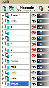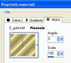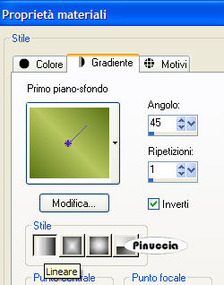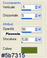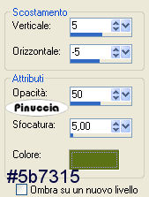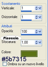 qui puoi trovare qualche risposta ai tuoi dubbi. Se l'argomento che ti interessa non è presente, ti prego di segnalarmelo. Occorrente: Materiale: qui Apri il motivo oro GoldFold e minimizzalo nella tua area di lavoro. Lo troverai nella lista dei motivi disponibili quando ti servirà. Apri il font e minimizzalo nella tua area di lavoro. Lo troverai nella lista dei font disponibili, quando ti servirà. Filtri: Graphics Plus qui 1. Apri una nuova immagine trasparente 600 x 400 pixels. Imposta il colore di primo piano con #b8c75f, e il colore di sfondo con #5b7315. Passa il colore di primo piano a Gradiente di primo piano/sfondo: ![]() Riempi l'immagine trasparente con questo gradiente.Selezione>Seleziona tutto. Livelli>Nuovo livello raster. Apri il tube Spring e vai a Modifica>Copia. Torna al tuo lavoro e vai a Modifica>Incolla>Incolla nella selezione. Selezione>Nessuna selezione. 2. Attiva lo strumento Selezione , rettangolo,e disegna un piccolo quadrato in alto a sinistra, di circa 100x80/90 pixels. Visualizza il righello per controllare le dimensioni. ![]() Considera che in altezza (e la tua tag è alta 400 pixels) dovranno starcene quattro. ![]() Livelli>Nuovo livello raster. Riempi la selezione con il gradiente.3. Mantieni selezionato. Modifica>Copia. Modifica>Incolla>Incolla come nuova IMMAGINE. Ora hai l'immagine di un piccolo quadrato. Minimizzala per il momento. Apri il tube con la lettera S: "S fiori.psp" e vai a Modifica>Copia. Ritorna al tuo lavoro, dove hai ancora il quadrato selezionato e vai a Modifica>Incolla>Incolla nella selezione. Rinomina questo livello "S". 4. Selezione>Modifica>Contrai, di 2 pixels. Selezione>Inverti. Selezione>Mobile. Selezione>Immobilizza. Livelli>Nuovo livello raster. Passa il colore di primo piano a Motivi e seleziona il motivo oro Gold.fold. ![]() Riempi il bordo con il motivo oro.Effetti>Plugins>Graphics Plus - Cross Shadow, con i settaggi standard. ![]() Ripeti l'effetto Cross Shadow. Mantieni selezionato. Effetti>Effetti 3D>sfalsa ombra, con i seguenti settaggi, e il colore scuro di sfondo: ![]() Ripeti l'Effetto Sfalsa ombra, ma invertendo i valori verticale e orizzontale. ![]() Selezione>Nessuna selezione. Livelli>Unisci>Unisci giù. Ripeti il primo Effetto Sfalsa ombra. ![]() Chiudi il livello "S". Livelli>Unisci>Unisci visibile, e rinomina questo livello sfondo. 5. Adesso puoi rendere nuovamente visibile il livello "S". 6. Attiva l'immagine del piccolo quadrato che hai minimizzato al punto 3 e vai a Modifica>Copia. Torna al tuo lavoro e vai a Modifica>Incolla>Incolla come nuovo livello. Sposta il piccolo quadrato sotto la lettera S.Selezione>Seleziona tutto. Selezione>Mobile. Selezione>Immobilizza. Apri il tube "P fiori" e vai a Modifica>Copia. Torna al tuo lavoro e vai a Modifica>Incolla>Incolla nella selezione. Rinomina questo livello "P". Selezione>Modifica>Contrai, di 2 pixels. Selezione>Inverti. Selezione>Mobile. Selezione>Immobilizza. Livelli>Nuovo livello raster. Riempi la selezione con il motivo oro.Effetti>Plugins>Graphics Plus - Cross Shadow, con i settaggi standard, 2 volte. Effetti>Effetti 3D>Sfalsa ombra, con gli stessi settaggi usati per la lettera P. Selezione>Nessuna selezione. Livelli>Unisci>Unisci giù. Effetti>Effetti 3D>Sfalsa ombra, con il primo settaggio. 7. Ripeti il passo 6 per tutte le altre lettere, finchè non avrai composto la parola Spring. ![]() 8. Quando hai finito, sposta i quadrati in sequenza, come mostrato nella schermata sotto:![]() 9. Attiva il livello inferiore (lo sfondo). Apri il tube NG Dancing Lady e vai a Modifica>Copia. Torna al tuo lavoro e vai a Modifica>Incolla>Incolla come nuovo livello. Sposta il tube a destra.Rinomina questo livello "Donna". Effetti>Effetti 3D>sfalsa ombra, con gli stessi settaggi usati per le piccole immagini. 10. Imposta il colore di sfondo con il motivo oro, e chiudi il colore di primo piano. Attiva lo strumento Testo ![]() Seleziona il font LainieDaySH, dimensione 80, crea come vettore. ![]() se stai usando PSP X, dovrai regolare la dimensione, perchè i pixels nella due versioni non corrispondono. Su queste differenze, vedi in fondo a questa pagina Scrivi la parola Breeze e usa i nodi vettori per inclinare leggermente il testo. Livelli>Converti in livello raster. Effetti>Plugins>Graphics Plus - Cross Shadow, con i settaggi standard, 2 volte. Effetti>Effetti 3D>Sfalsa ombra, con i seguenti settaggi, con il colore scuro di sfondo: ![]() Ripeti l'Effetto Sfalsa ombra 2 volte. Rinomina questo livello "testo". 11. Attiva nuovamente il livello inferiore. Apri, una alla volta, i tubes delle mele. Modifica>Copia. Torna al tuo lavoro e vai a Modifica>Incolla>Incolla come nuovo livello. Immagine>Ridimensiona, al 60%, bicubica, tutti i livelli non selezionato. ![]() Effetti>Effetti 3D>Sfalsa ombra: ![]() 12. Attiva ancora una volta lo strumento Testo ,scegli un altro bel font, crea come vettore, sempre con il colore di sfondo impostato sul motivo oro. Scrivi il tuo nome sulla tag. ![]() 13. Nascondi i livelli dei quadrati con le lettere. ![]() Posizionati sul livello di sfondo e vai a Livelli>Unisci>Unisci visibile. 14. Rimani sul livello inferiore. Selezione>Seleziona tutto. Selezione>Modifica>Contrai, di 4 pixels. Selezione>Inverti. Livelli>Nuovo livello raster. Riempi con il motivo oro.se il motivo oro è ancora impostato come colore di sfondo, per riempire clicca con il tasto destro del mouse. Ripeti l'Effetto Sfalsa ombra usato per i piccoli quadrati. Livelli>Unisci>Unisci giù. 15. Chiudi i livelli P, R, I, N e G. ![]() Livelli>Unisci>Unisci visibile (e avrai unito i livelli dello sfondo e del quadratino con la lettera S). Salva come 1S.pspimage. Modifica>Annulla azione unisci visibile. Chiudi il livello S e apri il livello P. Livelli>Unisci>Unisci visibile, e salva come 2P.pspimage. Ripeti questo passaggio per tutte le altre lettere. Alla fine avrai salvato questi sei files: 1S, 2P, 3R, 4I, 5N, 6G. 16. Visualizza tutti i livelli: Livelli>Visualizza>Tutto. Livelli>Unisci>Un