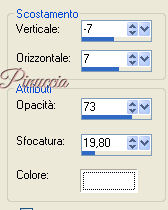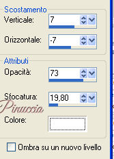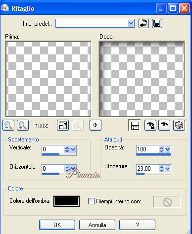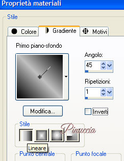 qui puoi trovare qualche risposta ai tuoi dubbi. Se l'argomento che ti interessa non è presente, ti prego di segnalarmelo. Occorrente: Materiale qui Il tube RobotGirl è di Angels Epiphanie. Potete utilizzarlo per il vostro uso personale, ma non potete usarlo per i vostri tutorial. Non cambiate il nome del tube e non rimuovete il livello del copyright. Filtro Graphics Plus qui 1. Apri una nuova immagine, bianca, 700 x 500 pixels. Selezione>Seleziona tutto. Livelli>Nuovo livello raster. 2. Apri l'immagine Future World e vai a Modifica>Copia. Torna al tuo lavoro e vai a Modifica>Incolla>Incolla nella selezione. Mantieni selezionato. 3. Livelli>Nuovo livello raster. Apri il file Template Glitter e vai a Modifica>Copia. Torna al tuo lavoro e vai a Modifica>Incolla>Incolla nella selezione. Selezione>Nessuna selezione. Abbassa l'opacità di questo livello al 50%. ![]() 4. Apri il tube RobotGirl e vai a Modifica>Copia. Torna al tuo lavoro e vai a Modifica>Incolla>Incolla come nuovo livello. Spostalo contro il bordo destro.Attiva lo strumento Deformazione ![]() e "tira" il tube, verso l'alto in modo che riempia l'immagine per tutta la sua altezza. ![]() 5. Cambia la modalità di miscelatura di questo livello in Luminanza (esistente). Effetti>Effetti 3D>Sfalsa ombra, con i seguenti settaggi: ![]() 6. Livelli>Unisci>Unisci visibile. Selezione>Seleziona tutto. Selezione>Modifica>Contrai, di 10 pixels. Selezione>Inverti. Regola>Sfocatura>sfocatura gaussiana, raggio 45. ![]() Mantieni selezionato. Effetti>Plugins>Graphics Plus - Cross Shadow, con i settaggi standard. ![]() Selezione>inverti. Livelli>Nuovo livello raster. Effetti>Effetti 3D>Ritaglio: ![]() 7. Livelli>Unisci>Unisci visibile. Selezione>Seleziona tutto. Selezione>Modifica>Contrai, di 10 pixels. Selezione>Seleziona bordature selezione: ![]() Riempi con il nero.Selezione>Nessuna selezione. Selezione>Seleziona tutto. Selezione>Modifica>Contrai, di 2 pixels. Selezione>Inverti. Riempi con il nero.Selezione>Nessuna selezione. 8. Imposta il colore di sfondo con #c0c0c0, e il colore di primo piano sul nero. Passa il colore di sfondo a Gradiente, con i seguenti settaggi. ![]() Lascia aperto il colore di primo piano attiva lo strumento Testo , crea come vettore,scegli un bel font e scrivi il tuo nome. Livelli>Converti in livello raster. Effetti>Plugins>Graphics Plus, Cross Shadow, con i settaggi standard. Effetti>Effetti 3D>Sfalsa ombra, con i seguenti settaggi colore bianco: ![]() Ripeti l'Effetto Sfalsa ombra, ma invertendo i valori verticale e orizzontale. ![]() Regola>Messa a fuoco>Accentua messa a fuoco, due volte. 9. Apri il tube di Mounier "hmo_modern graphic" e vai a Modifica>Copia. Torna al tuo lavoro e vai a Modifica>Incolla>incolla come nuovo livello. Immagine>Ridimensiona, del 75%, tutti i livelli non selezionato: ![]() Sposta il tube in alto a sinistra.Effetti>Effetti 3D>Sfalsa ombra, con gli stessi settaggi del passo 5. ![]() Aggiungi il tuo watermark. Livelli>Unisci>Unisci visibile. 10. Se non vuoi animare la tag, ridimensionala a 600 pixels di larghezza e salva in formato jpg. ![]() Per creare l'animazione. 11. Copia l'immagine: Modifica>Copia. Apri Animation Shop e vai a Modifica>Incolla>Incolla come nuova animazione. (puoi anche cliccare con il tasto destro del mouse su un punto vuoto di As e ti apparirà la scritta da cliccare: Incolla come nuova animazione). ![]() Modifica>Duplica, e ripeti finchè non avrai un'animazione composta da 14 fotogrammi. Clicca sul primo fotogramma per selezionarlo. Modifica>Seleziona tutto. 12. Apri l'animazione fornita con il materiale del tutorial: ColorBubble.mng. Clicca sul primo fotogramma per selezionarlo. Modifica>Seleziona tutto. Modifica>Copia. Ritorna al tuo lavoro e vai a Modifica>Incolla>Incolla nel fotogramma selezionato. Posiziona la bolla al centro del tube di Mounier, e rilascia il tasto del mouse quando sei certo della posizione. Se non sei soddisfatto, puoi sempre tornare indietro con Modifica>Annulla incolla, e ripetere l'operazione. Per controllare il risultato clicca su Visualizza ![]() 13. Riduci l'animazione (Animazione>Ridimensiona animazione, a 600 pixels di larghezza) e salva in formato gif. ![]() Se hai problemi o dubbi, o trovi un link non funzionante, o anche soltanto per un saluto, scrivimi. Novembre 2006 |