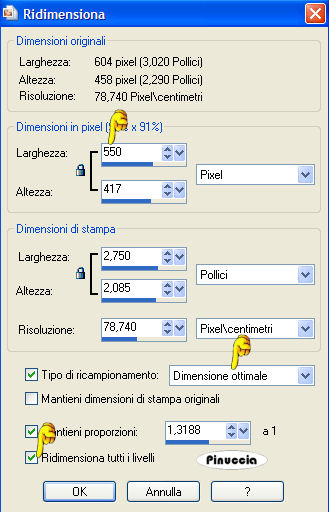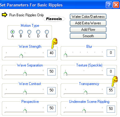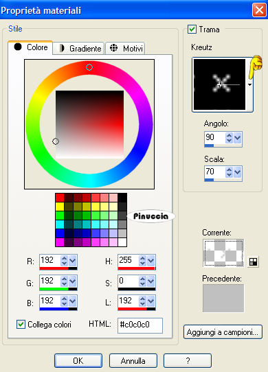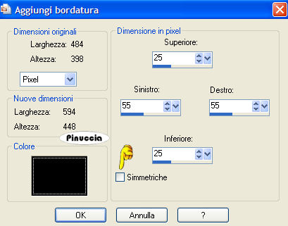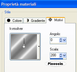 qui puoi trovare qualche risposta ai tuoi dubbi. Se l'argomento che ti interessa non è presente, ti prego di segnalarmelo. Occorrente: Materiale qui nello zip trovi: i tubes caro3076 e goldenheels_joluvesdogs, il tube di testo "text_steppin", il motivo kvmsilver (aprilo in PSP e minimizzalo: lo troverai disponibile nella lista dei motivi, quando ne avrai bisogno). la trama "Kreutz" (da mettere nella cartella Trame di PSP). Inoltre ti servirà un font a tua scelta e il programma Sqirlz Water Reflections Caro e JoLuvsDogs hanno concesso soltanto l'uso personale dei loro tubes. Non puoi usarli per i tuoi tutorials. Non cambiare il nome dei tubes e non rimuovere il livello del copyright. 1. Apri una nuova immagine NERA 550 x 450 pixels. Attiva il tube caro3076 e vai a Modifica>Copia. Torna al tuo lavoro e vai a Modifica>Incolla>Incolla come nuovo livello. Spostalo in alto a sinistra.Attiva lo strumento Deformazione ![]() se stai usando PSP X è lo strumento Puntatore ![]() a raddrizza l'edificio. ![]() Cambia la modalità di miscelatura di questo livello in Luminanza (esistente). 2. Livelli>Duplica. Immagine>Capovolgi. Sposta l'edificio capovolto contro l'originale,in modo che sembri riflesso. Abbassa l'opacità di questo livello al 20%. 3. Attiva il tube goldenheels_joluvesdogs e vai a Modifica>Copia. Torna al tuo lavoro e vai a Modifica>Incolla>Incolla come nuovo livello. Immagine>Ridimensiona, all'85%, ricampionamento bicubica, tutti i livelli non selezionato. ![]() Sposta il tube in alto a destra.Cambia la modalità di miscelatura di questo livello in Luminanza (esistente). Livelli>Duplica. Immagine>Capovolgi. Sposta l'immagine capovolta contro l'originale,in modo che sembri riflessa. Abbassa l'opacità di questo livello al 30%. ![]() 4. Livelli>Unisci>Unisci tutto. 5. Immagine>Aggiungi bordatura, 3 pixels, simmetriche, con il colore bianco. Seleziona il bordo con la bacchetta magica (sfumatura e tolleranza 0).Imposta il colore di primo piano su Motivi, cerca e seleziona il motivo krwsilver, con i seguenti settaggi: ![]() Riempi la selezione con il motivo argento.Selezione>Nessuna selezione. 6. Immagine>Aggiungi bordatura, 2 pixels, simmetriche, con il colore nero. Immagine>Aggiungi bordatura, 3 pixels, simmetriche, con il colore bianco. Seleziona il bordo con la bacchetta magica ![]() e riempilo con il motivo argento.7. Immagine>Aggiungi bordatura, simmetriche non selezionato, con i seguenti settaggi: ![]() 8. Imposta il colore di sfondo con #c0c0c0. Seleziona la casella trama, apri il menu cliccando sulla freccia a fianco del box, e cerca la trama Kreutz, con i seguenti settaggi: ![]() Clicca ora con la bacchetta magica sul bordo asimmetrico,e riempilo con questa trama.9. Effetti>Effetti di bordo>Aumenta. 10. Selezione>Nessuna selezione. Immagine>Aggiungi bordatura, 3 pixels, simmetriche, con il colore bianco. Seleziona il bordo con la bacchetta magica ![]() e riempilo con il motivo Argento.Selezione>Nessuna selezione. Immagine>Aggiungi bordatura, 2 pixels, simmetriche, con il colore nero. ![]() 11. Attiva il file di testo "Texttube" e vai a Modifica>Copia. Torna al tuo lavoro e vai a Modifica>Incolla>Incolla come nuovo livello. Spostalo in alto a sinistra.12. Aggiungi sul bordo il tuo watermark. Livelli>Unisci>Unisci tutto. 13. Immagine>Ridimensiona, a 550 pixels di larghezza: ![]() 14. Salva l'immagine in formato jpg. (per aggiungere il nome alla tag, vedremo più avanti). ![]() 15. Apri adesso il programma Sqirlz Water Reflections. File>Apri e cerca l'immagine che hai appena salvato. ![]() Outline>Begin: ![]() Il mouse prenderà la forma di una croce. Come fai in PSP con lo strumento Selezione a mano libera, seleziona la parte che dovrà essere animata: ![]() Quando hai fatto, clicca con il tasto destro del mouse per chiudere la selezione. Adesso clicca sull'icona delle onde blu: ![]() e imposta i seguenti settaggi: ![]() Quando hai finito, chiudi la finestra, cliccando sulla x in alto a destra, per ritornare a Sqirl. Clicca sull'icona "Avi" per salvare il file in formato avi. ![]() Appariranno le seguenti finestre: ![]() Clicca ok. ![]() assegna un nome al file e clicca salva. ![]() Clicca ok. ![]() clicca ok. ![]() attendi finchè non sarà conclusa la procedura di salvataggio. ![]() Clicca ok e il file è salvato. Adesso puoi chiudere il programma. Torna ad Animation Shop. File>Apri e cerca il file creato con Sqirlz. Apparirà questa finestra: ![]() Clicca ok e attendi il tempo necessario per avere la tua animazione, che sarà composta da 20 fotogrammi. Clicca sul primo fotogramma per selezionarlo e vai a Modifica>Seleziona tutto. Animazione>Proprietà fotogramma e imposta la velocità a 15. ![]() 16. Ritorna in PSP alla tua tag originale. Imposta il colore di sfondo con il bianco e chiudi il colore di primo piano. Attiva lo strumento Testo , scegli un font, crea come vettore,e scrivi il tuo nome e posizionalo in basso, nella parte riflessa. Livelli>Converti in livello raster. 17. Modifica>Copia. 18. Apri Animation Shop. Clicca con il tasto destro del mouse sullo spazio vuoto e Incolla come nuova animazione. Clicca sull'immagine e vai a Modifica>Seleziona tutto e poi Modifica>Propaga incolla. Attiva la tua tag. Clicca sul primo fotogramma per selezionarlo e vai a Modifica>Seleziona tutto. Affianca il testo e tenendo premuto il tasto sinistro del mouse sul nome, trascinalo sulla tag. Quando sei sicuro della posizione, rilascia il tasto del mouse e vedrai apparire il nome su tutti i 20 fotogrammi dell'animazione. ![]() Per controllare il risultato, clicca su Visualizza ![]() Se non sei soddisfatto, ricorda che puoi annullare con Modifica/Annulla.... e ripetere le operazioni. Salva in formato gif. ![]() Se hai problemi o dubbi, o trovi un link non funzionante, o anche soltanto per un saluto, scrivimi. 3 Marzo 2007 |