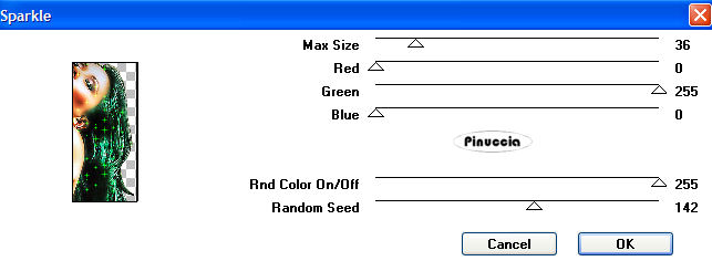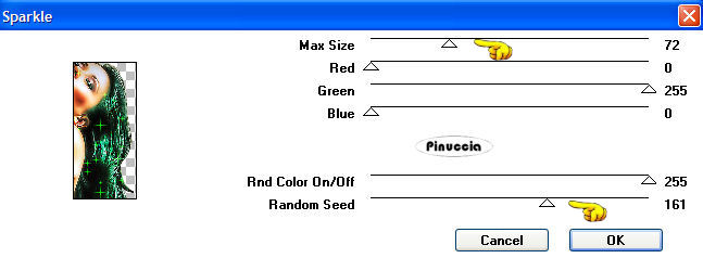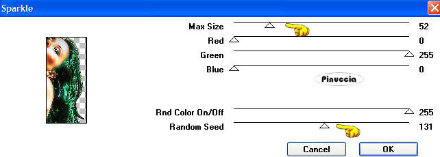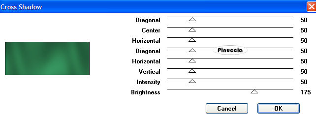 qui puoi trovare qualche risposta ai tuoi dubbi. Se l'argomento che ti interessa non è presente, ti prego di segnalarmelo. Occorrente: Materiale qui Nello zip trovi il tube di Marcio mc949 von Marcio, le maschere BDMASK13 e maske_helank25 (mettile nella cartella Maschere) un tube di testo di Angel Epiphanie. Filtri: Graphics Plus qui VM Natural Sparkle qui 1. Apri una nuova immagine trasparente 1024x400 Pixel. Riempi l'immagine con il colore #215a39.Effetti>Plugins>Graphics Plus>Cross Shadow: ![]() 2. Livelli>Nuovo livello raster. Riempi con il colore #009c63.Ripeti l'Effetto Cross Shadow. 3. Livelli>Carica/Salva maschera>Carica maschera da disco: cerca e carica la maschera BDMASK13: ![]() 4. Livelli>Unisci>Unisci gruppo. Livelli>Unisci>Unisci visibile. Effetti>Effetti di bordo>Aumenta, 2 volte. ![]() 5. Livelli>Nuovo livello raster. Riempi con il colore scuro (#215a39).Livelli>Carica/Salva maschera>Carica maschera maske_helank25: ![]() Livelli>Unisci>Unisci gruppo. Cambia la modalità di miscelatura di questo livello in Luce diffusa. ![]() 6. Livelli>Unisci>Unisci visibile. Immagine>Aggiungi bordatura, 5 pixels, simmetriche, con il colore bianco. Selezione il bordo bianco con la bacchetta magica (sfumatura e tolleranza 0),Passa il colore di primo piano a Gradiente di primo piano/sfondo: ![]() Riempi il bordo con questo gradiente.Effetti>Plugins>Graphics Plus - Cross Shadow, con i settaggi standard: ![]() Mantieni selezionato. Effetti>Effetti 3D>Sfalsa ombra: ![]() Ripeti l'Effetto Sfalsa ombra, ma invertendo i valori verticale e orizzontale: ![]() Selezione>Deseleziona. 7. Attiva lo strumento Selezione , rettangolo,traccia una selezione, come mostrato nell'esempio. ![]() Livelli>Nuovo livello raster. Riempi il nuovo livello con il colore scuro.Selezione>Deseleziona. Abbassa l'opacità di questo livello al 60%. Effetti>Effetti 3D>Sfalsa ombra, con i settaggi del passo 6. 8. Apri il tube di testo "Texttube" e vai a Modifica>Copia. Torna al tuo lavoro e vai a Modifica>Incolla come nuovo livello. Spostalo sulla striscia, a sinistra.Effetti>Effetti 3D>Sfalsa ombra: ![]() ![]() 9. Livelli>Unisci>Unisci visibile. 10. Apri il tube mc949 e vai a Modifica>Copia. Torna al tuo lavoro e vai a Modifica>Incolla come nuovo livello. Cambia la modalità di miscelatura di questo livello in Luminanza (esistente) e abbassa l'opacità al 35%. Spostalo sul bordo destro.Livelli>Unisci>Unisci visibile. Di nuovo Modifica>Incolla come nuovo livello (l'immagine è ancora in memoria). Immagine>Ridimensiona, all'85%, bicubica, tutti i livelli non selezionato. ![]() Spostalo a sinistra dell'altro tube.![]() 11. Attiva lo strumento Selezione a mano libera , punto a punto, sfumatura 1, tolleranza 0,e seleziona i capelli della donna: ![]() Livelli>Duplica, e ripeti. Attiva il livello inferiore. ![]() Effetti>Plugins>VM Natural - Sparkle: ![]() Attiva il livello di centro: Ripeti l'Effetto Sparkle: ![]() Attiva il terzo livello. Ripeti l'Effetto Sparkle: ![]() 12. Selezione>Deseleziona. 13. Aggiungi il tuo nome o il tuo watermark in un nuovo livello. Posizionati sul livello di sfondo (uniti). Chiudi il secondo e il terzo livello del tube. ![]() Modifica>Copia unione. 14. Apri Animation Shop. Clicca con il tasto destro del mouse e Incolla come nuova animazione. ![]() Torna in PSP. Chiudi il livello inferiore del tube e attiva il livello centrale. ![]() Modifica>Copia unione. Ritorna in Animation Shop e vai a Modifica>Incolla>Incolla dopo il fotogramma corrente. Ancora in PSP: chiudi il livello centrale del tube e apri il livello superiore. ![]() Modifica>Copia Unione. Incolla>Incolla dopo il fotogramma corrente. Clicca sul primo fotogramma per selezionarlo e vai a Modifica>Seleziona tutto. Animazione>Proprietà fotogramma, e imposta la velocità a 18. ![]() Animazione>Ridimensiona animazione: ![]() Salva in formato gif. ![]() Se hai problemi o dubbi, o trovi un link non funzionante, o anche soltanto per un saluto, scrivimi. 4 Marzo 2007 |