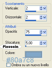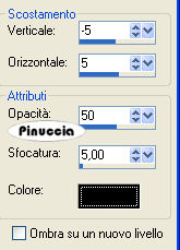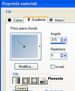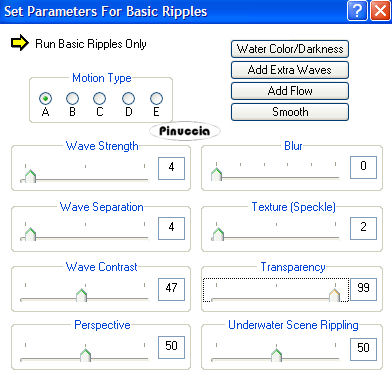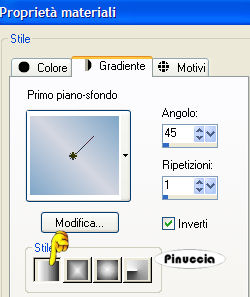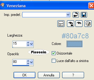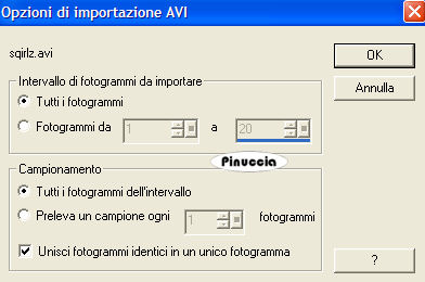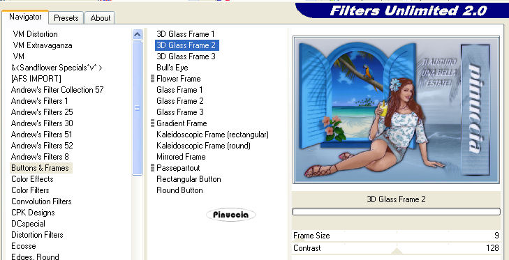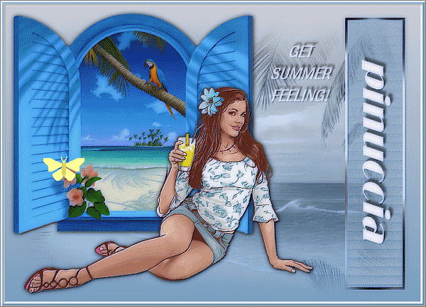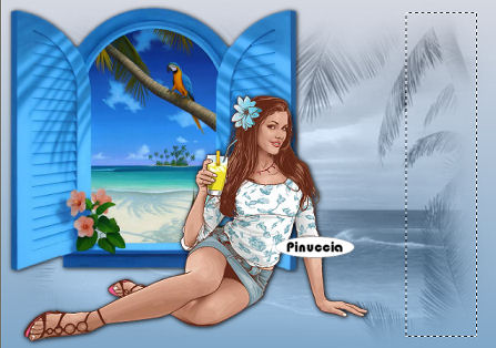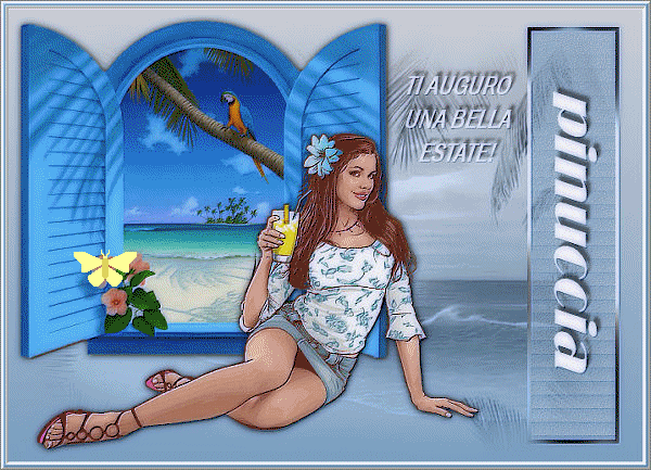 qui puoi trovare qualche risposta ai tuoi dubbi. Se l'argomento che ti interessa non è presente, ti prego di segnalarmelo. Occorrente: Materiale: qui Tubes: DaisyWeb Window to Paradise 1, Daisy BeachHouse, Mtm Vector Jessica Finson Summertime, Animazione: Summerbutt.mng. Filtri: Filters Unlimited 2.0 qui FM Tile Tools qui Xero - Porcelain qui Graphics Plus qui Il programma Sqirlz Water Reflections, per animare l'acqua. Brigitte e Daisy hanno concesso soltanto l'uso personale dei loro tubes. Non puoi usarli per i tuoi tutorials. Non cambiare il nome del file e non cancellare il livello del copyright. 1. Apri una nuova immagine trasparente 700 x 500 pixels. Imposta il colore di primo piano con #d5d8e1, e il colore di sfondo con #80a7c8. Passa il colore di primo piano a Gradiente di primo piano/sfondo, con i seguenti settaggi: ![]() Riempi l'immagine trasparente con questo gradiente.2. Selezione>Seleziona tutto. Livelli>Nuovo livello raster. 3. Apri il tube DaisyWeb Window to Paradise 1, e vai a Modifica>Copia. Torna al tuo lavoro e vai a Modifica>Incolla>Incolla come nuovo livello. Immagine>Rifletti. Immagine>Ridimensiona, all'80% %, tutti i livelli non selezionato. ![]() Sposta l'immagine a sinistra.Effetti>Effetti 3D>Sfalsa ombra: ![]() ![]() 4. Apri il tube Mtm Vector Jessica Finson Summertime e vai a Modifica>Copia. Torna al tuo lavoro e vai a Modifica>Incolla>Incolla come nuovo livello. Immagine>Rifletti. Immagine>Ridimensiona, al 70% bicubica, tutti i livelli non selezionato. Sposta il tube a destra della finestra.Effetti>Effetti 3D>Sfalsa ombra, con i settaggi usati al passo 3. 5. Attiva lo strumento Selezione , rettangolo,e disegna un rettangolo sul lato destro dell'immagine. ![]() Cambia i settaggi del gradiente: ![]() Livelli>Nuovo livello raster. Riempi la striscia con il gradiente.Effetti>Effetti di trama>Veneziana, con il colore scuro. ![]() Regola>Aggiungi/rimuovi disturbo/Aggiungi disturbo: ![]() Regola>Messa a fuoco>Metti a fuoco. 6. Selezione>Modifica>Contrai, di 4 pixels. Selezione>Inverti. Selezione>Mobile. Selezione>Immobilizza. Livelli>Nuovo livello raster. Cambia ancora una volta i settaggi del gradiente. ![]() Riempi la selezione con il gradiente.Effetti>Plugins>Graphics Plus - Cross Shadow, con i settaggi standard. ![]() Ripeti l'Effetto Cross Shadow. Selezione>Nessuna selezione. Abbassa l'opacità della striscia al 50%. ![]() Chiudi tutti i livelli, eccetto il livello della striscia e della cornice. ![]() Livelli>Unisci>Unisci visibile. Effetti>Effetti 3D>Sfalsa ombra, con i settaggi precedenti. Ripeti l'Effetto Sfalsa ombra, con il colore scuro di sfondo. ![]() 7. Imposta il colore di sfondo con il bianco, e chiudi il colore di primo piano. Attiva lo strumento Testo .e scegli un bel font. Io ho usato Broadway (standard di Windows), dimensione 30, crea come vettore. ![]() per la dimensione dovrai regolarti a seconda della lunghezza del testo, e della versione di PSP che stai usando. Scrivi il tuo nome. Immagine>Ruota>Ruota per gradi, 90 gradi a destra. ![]() Livelli>Converti in livello raster. Effetti>Effetti 3D>Sfalsa ombra: ![]() Scegli un altro bel font, e scrivi un piccolo testo. tra la donna e la striscia, sempre il colore bianco come colore di sfondo. Livelli>Converti in livello raster. Effetti>Effetti 3D>Sfalsa ombra, con gli stessi settaggi usati per il nome. Se vuoi, questo è il momento di aggiungere il tuo watermark. 8. Livelli>Unisci>Unisci tutto. Effetti>Plugins>FM Tile Tools - Blend Emboss, con i settaggi standard. ![]() Effetti>Plugins>Xero - Porcelain, con i settaggi standard. ![]() 9. Immagine>Aggiungi bordatura, 3 pixels, simmetriche, con il colore bianco. Immagine>Aggiungi bordatura, 3 pixels, simmetriche, con il colore scuro di sfondo. Immagine>Aggiungi bordatura, 3 pixels, simmetriche, con il colore bianco. 10. Selezione>Seleziona tutto. Selezione>Modifica>Contrai, di 9 pixels. Selezione>Inverti. Effetti>Plugins>Filters Unlimited - Buttons and Frames, 3D Glass Frame 2: ![]() Selezione>Nessuna selezione. 11. Immagine>Ridimensiona, a 600 pixels di larghezza. Salva in formato jpg. ![]() Apri il programma Sqirlz Water Reflections. Apri il file che hai appena salvato. Vai a Outline>Begin. ![]() Con lo stesso sistema che usi con la Selezione a mano libera di PSP, seleziona lo specchio d'acqua all'interno della finestra. Assicurati di lasciare fuori dalla selezione la mano della ragazza e i fiori. Alla fine, per chiudere la selezione clicca con il tasto destro del mouse. ![]() Clicca adesso sull'icona delle onde blu. ![]() e imposta i seguenti valori. ![]() Chiudi la finestra e ti ritroverai sulla schermata del programma. Vai a Animate>Make avi File: ![]() e inizierà la sequenza di salvataggio. In tutte le finestre che appariranno clicca ok. Apri Animation Shop e apri il file che hai appena salvato. Apparirà questa finestra. ![]() Clicca ok e avrai la tua animazione, composta da 20 fotogrammi. Clicca sul primo fotogramma per selezionarlo e vai a Modifica>Seleziona tutto. Animazione>Proprietà fotogramma, e imposta la velocità a 8. ![]() Apri adesso l'animazione fornita con il tutorial: Summerbutt.mng. Clicca sul primo fotogramma per selezionarlo e vai a Modifica>Seleziona tutto. Modifica>Copia. Torna al tuo lavoro e vai a Modifica>Incolla>Incolla nel fotogramma selezionato. Posiziona la farfalla sul vaso di fiori e, quando sei sicuro di aver trovato la posizione corretta, rilascia il tasto del mouse. Per controllare il risultato clicca su Visualizza ![]() Se non ti piace, puoi tornare indietro con Modifica>Annulla incolla, e ripetere l'operazione. Quando sei soddisfatto, salva in formato gif. ![]() ![]() Se hai problemi o dubbi, o trovi un link non funzionante, o anche soltanto per un saluto, scrivimi. 10 Giugno 2007 |