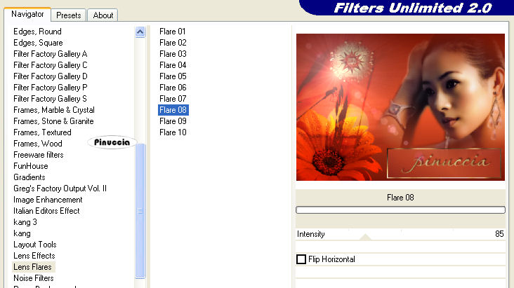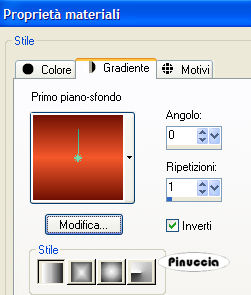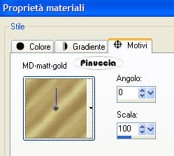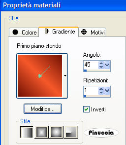qui puoi trovare qualche risposta ai tuoi dubbi. Se l'argomento che ti interessa non è presente, ti prego di segnalarmelo. Occorrente: Materiale qui Apri il motivo oro MD-Matt-gold minimizzalo nella tua area di lavoro. Lo troverai nella lista dei motivi disponibili, quando ti servirà. Apri il font e minimizzalo nella tua area di lavoro. Lo troverai nella lista dei font disponibili, quando ti servirà. Filtri: Graphics Plus qui Filters Unlimited qui Penta.com qui Patry ha concesso soltanto l'uso personale dei suoi tubes. Non puoi usarli per i tuoi tutorials. Non cambiare il nome del file e non cancellare il livello del copyright. 1. Apri una nuova immagine trasparente 700 x 500 pixels. Scegli dall'immagine Sunrising un colore arancio come colore di primo piano (io ho scelto F5582B), e un colore scuro come colore di sfondo (io ho scelto #721204). Passa il colore di primo piano a Gradiente di primo piano/sfondo, stile lineare, con i seguenti settaggi: ![]() Riempi l'immagine trasparente con questo gradiente.2. Selezione>Seleziona tutto. Livelli>Nuovo livello raster. Apri l'immagine Sunrising e vai a Modifica>Copia. Torna al tuo lavoro e vai a Modifica>Incolla>Incolla nella selezione. Selezione>Nessuna selezione. Livelli>Carica/Salva maschera>Carica maschera da disco. Cerca e carica la maschera 20-20, con i seguenti settaggi: ![]() Livelli>Unisci>Unisci gruppo. Sposta l'immagine a sinistra, come mostrato nell'esempio.![]() Abbassa l'opacità di questo livello al 50%. 3. Apri il tube Chinese Lady e vai a Modifica>Copia. Torna al tuo lavoro e vai a Modifica>Incolla>Incolla come nuovo livello. Sposta il tube a destra.![]() 4. Apri il tube del fiore di Patry e vai a Modifica>Copia. Torna al tuo lavoro e vai a Modifica>Incolla>Incolla come nuovo livello. Spostalo nell'angolo in basso a sinistra.Cambia la modalità di miscelatura di questo livello in Sovrapponi. ![]() 5. Cambia i settaggi del gradiente. ![]() 6. Attiva lo strumento Selezione , rettangolo,e disegna un rettangolo sotto il tube della donna. ![]() Livelli>Nuovo livello raster. Riempi la selezione con il gradiente.Effetti>Plugins>Penta.com - Jeans, con i settaggi standard. ![]() Regola>Messa a fuoco>Metti a fuoco. 7. Selezione>Modifica>Contrai, di 3 pixels. Selezione>Inverti. Selezione>Mobile. Seleziona>Immobilizza. Livelli>Nuovo livello raster. Imposta il colore di primo piano su Motivi e seleziona il motivo oro MD-matt-gold: ![]() Riempi la selezione con il motivo oro.Mantieni selezionato. Effetti>Plugins>Graphics Plus, Cross Shadow, con i settaggi standard, 2 volte. ![]() Selezione>Nessuna selezione. 8. Abbassa l'opacità del livello della striscia Jeans al 50%. ![]() 9. Nella paletta dei livelli chiudi tutti i livelli, tranne la striscia jeans e la cornice. Livelli>Unisci>Unisci visibile. Adesso puoi rendere nuovamente visibili tutti i livelli: Livelli>Visualizza>Tutto. 10. Imposta il colore di sfondo sul motivo oro, e chiudi il colore di primo piano. Attiva lo strumento Testo , seleziona il font PassionsConflictROB, crea come vettore,dimensione 45, (regola la dimensione sulla lunghezza del testo), e scrivi il tuo nome sulla striscia. Livelli>Converti in livello raster. Effetti>Effetti 3D>Sfalsa ombra: ![]() 11. Livelli>Nuovo livello raster. Imposta il colore di primo piano con il motivo oro. Attiva lo strumento Pennello ![]() cerca e seleziona un pennello appropriato al soggetto dell'immagine, e applicalo in alto a sinistra. se vuoi usare quello che ho utilizzato io, clicca qui Effetti>Plugins>Graphics Plus - Cross Shadow, con i settaggi standard. Effetti>Effetti 3D>Sfalsa ombra, con i settaggi usati al punto 10. Livelli>Unisci>Unisci visibile. 12. Selezione>Seleziona tutto. Livelli>Nuovo livello raster. Riempi il livello con il motivo oro.Selezione>Modifica>Contrai, di 5 pixels. Premi sulla tastiera il tasto CANC ![]() Selezione>Inverti. Effetti>Plugins>Graphics Plus - Cross Shadow, con i settaggi standard, 2 volte. 13. Livelli>Unisci>Unisci tutto. Immagine>Aggiungi bordatura, 15 pixels, simmetriche, con un colore qualsiasi, purchè non presente nell'immagine (e non bianco). Seleziona il bordo con la bacchetta magica ,(sfumatura e tolleranza 0), Riempi la selezione con l'ultimo gradiente impostato.Effetti>Plugins>Graphics Plus - Cross Shadow, con i settaggi standard, 2 volte. Selezione>Nessuna selezione. 14. Immagine>Aggiungi bordatura, 5 pixels, simmetriche, con il colore bianco. Seleziona il bordo con la bacchetta magica ,e riempilo con il motivo oro.Effetti>Plugins>Graphics Plus - Cross Shadow, con i settaggi standard, 2 volte. Selezione>Nessuna selezione. Se vuoi, questo è il momento di aggiungere il tuo watermark. 15. Selezione>Seleziona tutto. Selezione>Modifica>Contrai, di 25 pixels. Livelli>Duplica, 2 volte. Chiudi i due livelli superiori e attiva il livello inferiore. Effetti>Plugins>Filters Unlimited - Lens Flare - Flare 8: ![]() 16. Chiudi questo livello e attiva il secondo livello (quello al centro). Effetti>Plugins>Filters Unlimited - Lens Flare - Flare 8, e cambia il settaggio a 128. Chiudi questo livello e attiva il terzo livello (quello superiore). Effetti>Plugins>Filters Unlimited - Lens Flare - Flare 8, e cambia il settaggio a 150. 17. Selezione>Nessuna selezione. 18. Visualizza tutti i livelli. Salva il lavoro in formato psp. Apri Animation Shop. Apri l'immagine che hai appena salvato. Clicca sul primo fotogramma per selezionarlo e vai a Modifica>Seleziona tutto. Animazione>Proprietà fotogramma, e imposta la velocità a 40. ![]() 19. Animazione>Ridimensiona animazione, con i seguenti settaggi: ![]() . Salva in formato gif. ![]() Se hai problemi o dubbi, o trovi un link non funzionante, o anche soltanto per un saluto, scrivimi. 7 Giugno 2007 |