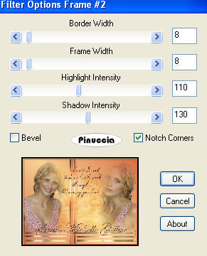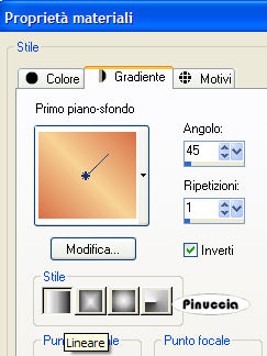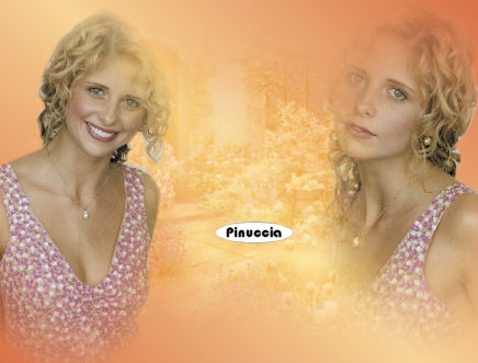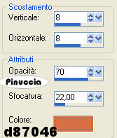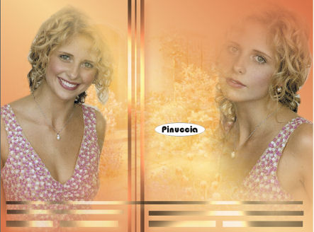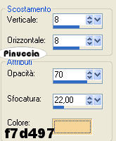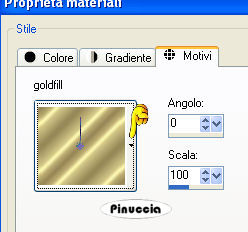 qui puoi trovare qualche risposta ai tuoi dubbi. Se l'argomento che ti interessa non è presente, ti prego di segnalarmelo. Occorrente: Materiale qui Nello zip trovi: I tubes: PatryMists_06_Scene_34, Sarah1 und Sarah2, le selezioni Sweet-Sarah1-3 (da mettere nella cartella Selezioni), la maschera 20-20 (da mettere nella cartella maschere), la trama oro: Goldfill1. Filtri: Graphics Plus qui Xero qui Bordermania qui Patry ha concesso il download dei suoi tubes soltanto per uso personale. Non potete usarli per i vostri tutorial. Non cambiate il nome del file e non cancellate il livello del copyright. 1. Apri una nuova immagine trasparente 800 x 600 pixels. Imposta il colore di primo piano con #f7d497, e il colore di sfondo con #d87046. Passa il colore di primo piano a Gradiente di primo piano/sfondo, lineare, con i seguenti settaggi: ![]() Riempi l'immagine con questo gradiente.2. Selezione>Seleziona tutto. Livelli>Nuovo livello raster. 3. Apri il tube PatryMists_06_Scene_34 e vai a Modifica>Copia. Torna al tuo lavoro e vai a Modifica>Incolla>Incolla come nuovo livello. Cambia la modalità di miscelatura di questo livello in Sovrapponi, e abbassa l'opacità al 60%. ![]() 4. Apri il tube Sarah1 e vai a Modifica>Copia. Torna al tuo lavoro e vai a Modifica>Incolla>Incolla come nuovo livello. Livelli>Duplica. Livelli>Disponi>Sposta giù. 5. Livelli>Carica/Salva maschera>Carica maschera da disco: cerca e carica la maschera 20-20: ![]() Livelli>Unisci>Unisci gruppo. Sposta l'immagine completamente a destra.![]() 6. Apri il tube Sarah2 e vai a Modifica>Copia. Torna al tuo lavoro e vai a Modifica>Incolla>Incolla come nuovo livello. Immagine>Rifletti. Sposta l'immagine a sinistra.![]() 7. Livelli>Nuovo livello raster. Selezione>Carica/Salva selezione>Carica selezione da disco: cerca e carica la selezione Sweet_Sarah1. ![]() Riempi la selezione con il colore scuro di sfondo.(Ricorda: per riempire con il colore di sfondo devi cliccare con il tasto destro del mouse). 8. Mantieni selezionato. Effetti>Plugins>Graphics Plus, Cross Shadow, con i settaggi standard: ![]() Ripeti l'Effetto Cross Shadow. Effetti>Effetti 3D>Sfalsa ombra, con i seguenti settaggi, con il colore scuro di sfondo (#d87046): ![]() Selezione>Nessuna selezione. Abbassa l'opacità di questo livello al 70%. ![]() 9. Livelli>Nuovo livello raster. Selezione>Carica/Salva selezione>Carica selezione da disco: cerca e carica la selezione Sweet_Sarah2. ![]() Riempi la selezione con il colore chiaro di primo piano (#f7d497).ricorda che hai ancora il colore di primo piano impostato su gradiente. Prima di riempire la selezione devi passarlo nuovamente a colore. 10. Effetti>Plugins>Graphics Plus, Cross Shadow, con i settaggi standard. Ripeti l'Effetto Graphics Plus. Effetti>Effetti 3D>Sfalsa ombra, con i seguenti settaggi, e con il colore chiaro di primo piano. ![]() Selezione>Nessuna selezione. Abbassa l'opacità di questo livello al 70%. ![]() 11. Livelli>Unisci>Unisci visibile. 12. Livelli>Nuovo livello raster. Selezione>Carica/Salva selezione>Carica selezione da disco: cerca e carica la selezione Sweet_Sarah3. ![]() Apri il motivo oro (Goldfill1) che hai trovato nello zip e minimizzalo. Passa il colore di primo piano su Motivi. Apri il menu cliccando sulla freccia a fianco del box e troverai Goldfill1 nella lista dei motivi disponibili. ![]() Riempi la selezione con il Motivo oro.Per facilitare l'operazione di riempimento, aiutati con lo zoom ![]() Se il tuo mouse ha la rotellina puoi ingrandire l'immagine usando la rotellina. In avanti l'immagine si ingrandisce, indietro rimpicciolisce. ![]() Effetti>Plugins>Graphics Plus, Cross Shadow, con i settaggi standard. Effetti>Effetti 3D>Sfalsa ombra: ![]() 13. Selezione>Nessuna selezione. 14. Passa il colore di sfondo a Motivi e seleziona il motivo oro. Chiudi il colore di primo piano. Attiva lo strumento Testo , scegli un bel font, vettore,e scrivi, il nome Sarah Michelle Gellar sul blend. Io ho usato il font standard di Windows Edwardian Script, dimensione 72. Livelli>Converti in livello raster. Effetti>Effetti 3D>Sfalsa ombra: ![]() ![]() Livelli>Unisci>Unisci visibile. 15. Effetti>Plugins>Xero, Porcelain: ![]() 16. Immagine>Aggiungi bordatura, 2 pixels, simmetriche, con il colore scuro di sfondo (d87046). Immagine>Aggiungi bordatura, 4 pixels, simmetriche, con il colore chiaro di primo piano (f7d497). Immagine>Aggiungi bordatura, 2 pixels, simmetriche, con il colore scuro di sfondo. 17. Selezione>Seleziona tutto. Selezione>Modifica>Contrai, di 8 pixels. Selezione>Inverti. 18. Effetti>Plugins>Bordermania, Frame #2 ![]() Selezione>Nessuna selezione. Non dimenticare di firmare il tuo blend. Immagine>Ridimensiona, a 800 pixels di larghezza. Salva in formato jpg. ![]() Se hai problemi o dubbi, o trovi un link non funzionante, o anche soltanto per un saluto, scrivimi. Gennaio 2007 |