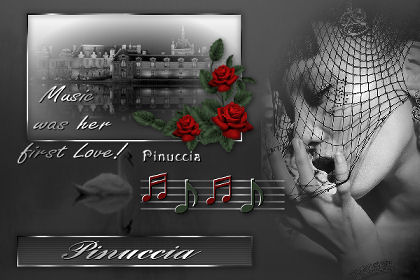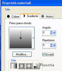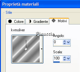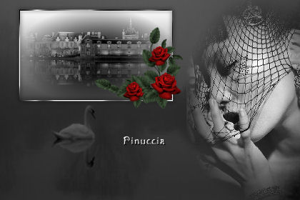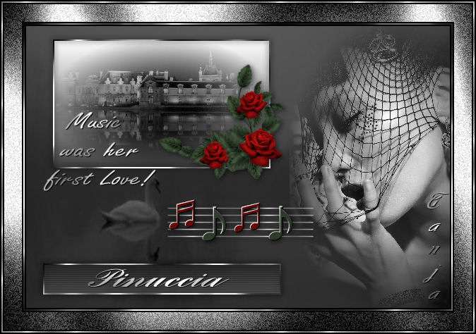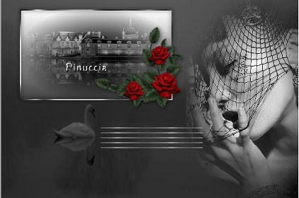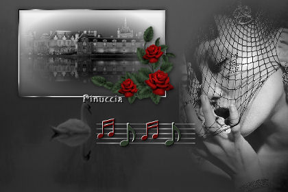 qui puoi trovare qualche risposta ai tuoi dubbi. Se l'argomento che ti interessa non è presente, ti prego di segnalarmelo. Occorrente: Materiale qui Filtro Graphics Plus qui 1. Apri una nuova immagine NERA 600 x 400 pixels. Selezione>Seleziona tutto. Livelli>Nuovo livello raster. Apri l'immagine del cigno: Swan. Immagine>Rifletti. Modifica>Copia. Torna alla tua immagine nera e vai a Modifica>Incolla>Incolla nella selezione. Cambia la modalità di miscelatura di questo livello in Luminanza (esistente) e abbassa l'opacità al 38%. Livelli>Unisci>Unisci visibile. ![]() Attiva il tube Mask e vai a Modifica>Copia. Torna al tuo lavoro e vai a Modifica>Incolla>Incolla come nuovo livello. Sposta il tube sul lato destro.![]() 2. Attiva lo strumento Selezione , rettangolo,e traccia un rettangolo sul lato sinistro dell'immagine, sopra il cigno: ![]() Livelli>Nuovo livello raster. Imposta il colore di primo piano con il bianco (#ffffff), e il colore di sfondo con #404040. Passa il colore di primo piano a Gradiente di primo piano/sfondo, con i seguenti settaggi: ![]() Riempi la selezione con questo gradiente.Mantieni selezionato. 3. Livelli>Nuovo livello raster. Apri il tube castle e vai a Modifica>Copia. Torna al tuo lavoro e vai a Modifica>Incolla>Incolla nella selezione. Livelli>Unisci>Unisci giù. Selezione>Modifica>Contrai di 2 pixels. Selezione>Inverti. Selezione>Mobile. Selezione>Immobilizza. Selezione>Nuovo livello raster. Passa il colore di primo piano a Motivi e seleziona il motivo kvm-silver: ![]() Riempi il bordo con il motivo argento.Mantieni ancora selezionato. Effetti>Plugins>Graphics Plus, Cross Shadow, con i settaggi standard. ![]() Ripeti l'Effetto Cross Shadow. Livelli>Unisci>Unisci giù. Effetti>Effetti 3D>Sfalsa ombra: ![]() Ripeti l'Effetto Sfalsa ombra, ma cambiando verticale e orizzontale a -2. Livelli>Unisci>Unisci visibile. ![]() 4. Apri il tube Rosenecke e vai a Modifica>Copia. Torna al tuo lavoro e vai a Modifica>Incolla>Incolla come nuovo livello. Spostalo sull'angolo inferiore destro della piccola immagine.Effetti>Effetti 3D>Sfalsa ombra, con i settaggi precedenti, ma senza la ripetizione a -2. ![]() 5. Attiva lo strumento Penna, larghezza 2, crea su vettore: ![]() Imposta il colore di primo piano sul motivo argento. Tenendo premuto il tasto shift, la riga ti verrà perfettamente diritta. Traccia la riga sotto il tube della rosa, a fianco del cigno. Livelli>Converti in livello raster. Effetti>Effetti 3D>Sfalsa ombra, con i settaggi del passo 3. Duplica questo livello 4 volte. Sistema le linee con la stessa distanza una dall'altra. Se necessario, puoi visualizzare il righello (Visualizza>Righelli). Puoi anche usare le frecce (dopo aver attivato lo strumento Spostamento): vedi qui gli appunti sull'argomento. Quando hai finito, chiudi tutti i livelli tranne i livelli delle linee. Livelli>Unisci>Unisci visibile. A questo punto, se non sei soddisfatto della lunghezza delle linee, puoi allungarle usando lo strumento Deformazione ![]() Puntatore , se stai usando PSP X.![]() 6. Apri il tube Note 1 e vai a Modifica>Copia. Torna al tuo lavoro e vai a Modifica>Incolla>Incolla come nuovo livello. Immagine>Ridimensiona, al 70%, tutti i livelli non selezionato, 2 volte. Effetti>Effetti 3D>Sfalsa ombra, con i settaggi precedenti. Sposta il tube sulle righe.Livelli>Duplica. Apri il tube Note 2 e ripeti gli stessi passaggi della prima nota. Sistema le 4 note sulle righe. Livelli>Unisci>Unisci visibile. ![]() 7. Attiva lo strumento Selezione , rettangolo e traccia un rettangolo sotto il cigno.Livelli>Nuovo livello raster. Riempi la selezione con lo stesso gradiente usato all'inizio, ma prima togli la spunta a Inverti.Effetti>effetti di trama>Veneziana: ![]() Selezione>Modifica>Contrai, di 2 pixels. Selezione>Inverti. Selezione>Mobile. Selezione>Immobilizza. Livelli>Nuovo livello raster. Riempi il bordo con il motivo argento.Effetti>Plugins>Graphics Plus - Cross Shadow, settaggi standard, due volte. Selezione>Nessuna selezione. Attiva nella paletta dei livelli il livello con la Selezione Veneziana e abbassa l'opacità al 30%. ![]() Chiudi il livello di sfondo. Livelli>Unisci>Unisci visibile. Effetti>Effetti 3D>Sfalsa ombra, con i settaggi precedenti. Ripeti l'Effetto Sfalsa ombra con verticale e orizzontale a -2. 8. Livelli>Nuovo livello raster. Attiva lo strumento Pennello ,cerca e seleziona il pennello Music was, dimensione 200, e applicalo con il colore argento sotto il rettangolo con il castello. Effetti>Plugins>Graphics Plus - Cross Shadow, settaggio standard. Effetti>Effetti 3D>sfalsa ombra: ![]() 9. Attiva lo strumento Testo ![]() (font CommercialScrpt BT, corsivo, dimensione 36, ma forse dovrai regolare questo settaggio a seconda della lunghezza del tuo testo, e della versione di PSP che stai usando: sull'argomento vedi qui) Scrivi il tuo nome sotto il rettangolo in basso. Livelli>Converti in livello raster. Effetti>Plugins>Graphics Plus>Cross Shadow, settaggi standard. Effetti>Effetti 3D>Sfalsa ombra, con i settaggi usati per il pennello. ![]() 10. Livelli>nuovo livello raster. Attiva lo strumento Pennello ![]() cerca e seleziona il pennello Tanja, e applicalo nell'angolo in basso a destra, Effetti>Plugins>Graphics Plus - Cross Shadow, settaggi standard. Effetti>Effetti 3D>Sfalsa ombra, con gli stessi settaggi usati per il nome. Livelli>Unisci>Unisci tutto. 11. Immagine>Aggiungi bordatura, 2 pixels, simmetriche, con il colore nero. Immagine>Aggiungi bordatura, 2 pixels, simmetriche, con il colore bianco. Seleziona il bordo bianco con la bacchetta magica ![]() e riempilo con il Motivo argento. Effetti>Plugins>Graphics Plus - Cross Shadow Standard, 2 volte. Selezione>Nessuna selezione. Immagine>Aggiungi bordatura, 2 pixels, simmetriche, con il colore nero. Immagine>Aggiungi bordatura, 25 pixels, simmetriche, con il colore bianco. Seleziona il bordo con la bacchetta magica ,e riempilo con il gradiente del punto 1.2 volte: Effetti>Plugins>Graphics Plus - Cross Shadow, con i settaggi 