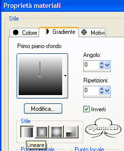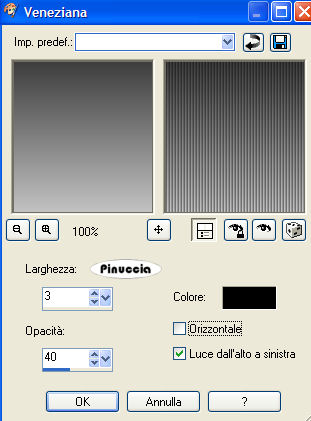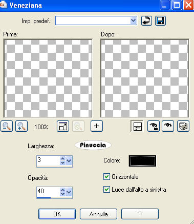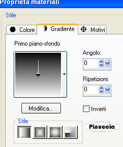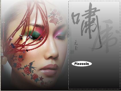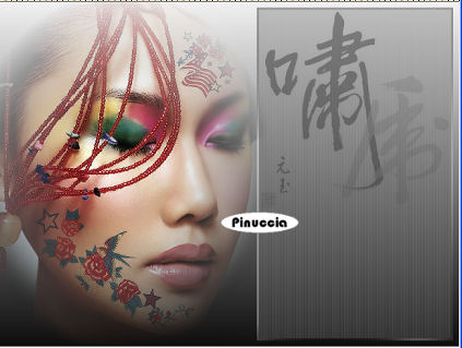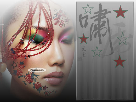 qui puoi trovare qualche risposta ai tuoi dubbi. Se l'argomento che ti interessa non è presente, ti prego di segnalarmelo. Occorrente: Materiale qui Nello zip trovi: l'immagine TattooFace, il pennello Asian-Text, il font Elzevier e la maschera 20-20 Filtri: FM Tile Tools qui Xero qui Graphics Plus qui 1. Apri una nuova immagine trasparente 800x600 pixels. 2. Imposta il colore di primo piano con #f2f2f2, e il colore di sfondo con #0d0d0d. Passa il colore di primo piano a Gradiente di primo piano/sfondo, con i seguenti settaggi: ![]() Riempi l'immagine con questo gradiente.3. Livelli>Nuovo livello raster. Attiva lo strumento Pennello ![]() seleziona il pennello Asia Text1 e applicalo in alto a destra con il colore di sfondo. Ricorda che per applicare il pennello con il colore di sfondo devi cliccare con il tasto destro del mouse. ![]() Abbassa l'opacità di questo livello al 40%. 4. Apri l'immagine TattooFace. Immagine>Ridimensiona, a 600 pixels di altezza. Livelli>Carica/salva maschera>Carica maschera da disco: cerca e carica la maschera 20-20: ![]() Livelli>Unisci>Unisci gruppo. Modifica>Copia. Torna al tuo lavoro e vai a Modifica>Incolla>Incolla come nuovo livello. Spostala sul lato sinistro.![]() 5. Attiva lo strumento Selezione , rettangolo,e traccia sul lato destro, sopra il pennello un rettangolo di circa 340x590 pixels. ![]() Livelli>Nuovo livello raster. Cambia il settaggio del gradiente, togliendo la spunta a Inverti, ![]() e riempi la selezione con il gradiente.Effetti>Effetti di trama>Veneziana: ![]() Livelli>Nuovo livello raster. Riempi con il gradiente.Selezione>Modifica>Contrai, di 4 pixels. Premi sulla tastiera il tasto canc. Selezione>Inverti. Effetti>Plugins>Graphics Plus - Cross Shadow, con i settaggi standard: ![]() Ripeti l'Effetto Cross Shadow. Selezione>Nessuna selezione. 6. Nella paletta dei livelli posizionati sul livello dell'Effetto Veneziana e abbassa l'opacità al 60%. Chiudi tutti i livelli tranne questo livello e il livello del bordo. Livelli>Unisci>Unisci visibile. Abbassa l'opacità di questo livello uniti al 40%. ![]() 7. Attiva lo strumento Forme predefinite ![]() e scegli la stella, larghezza 3, vettore selezionato. Imposta il colore di primo piano su #28523e, e il colore di sfondo su #6e1010. Per avere la stella rossa con il bordo verde, il rosso deve essere impostato come colore di sfondo e il verde come colore di primo piano. viceversa se vuoi la stella verde con il bordo rosso. Se invece vuoi la stella con il bordo verde o rosso, senza colore all'intero, il colore deve essere impostato come colore di primo piano e il colore di primo piano deve essere chiuso. Disegna una prima serie di tre stelle con il bordo del colore che preferisci. Livelli>Converti in livello raster. Imposta i colori secondo le tue scelte, e disegna un'altra serie di 3 stelle. Chiudi tutti i livelli tranne quelli delle stelle. Livelli>Unisci>Unisci visibile. Abbassa la trasparenza di questo livello uniti al 62%. ![]() 8. Attiva il livello testo .Inverti i colori nella paletta dei materiali. Seleziona il font Elzevier, vettore, dimensione 48, e scrivi il testo in basso all'interno del livello con l'effetto Veneziana. Agendo sui nodi vettore, "tira" un po' il testo in altezza. Livelli>Converti in livello raster. Effetti>Effetti 3D>Sfalsa ombra: ![]() Ripeti l'Effetto Sfalsa ombra, ma cambiando verticale e orizzontale a -1. 9. Livelli>Unisci>Unisci tutto. 10. Immagine>Aggiungi bordatura, 60 pixels, simmetriche, con un colore qualsiasi. Seleziona il bordo con la bacchetta magica ![]() Cambia i settaggi del gradiente, togliendo la spunta a "Inverti". Riempi la selezione con questo gradiente.Effetti>Plugins>Graphics Plus, Cross Shadow, con i settaggi standard. ![]() Ripeti l'Effetto Cross Shadow. Effetti>Effetti di trama>Veneziana: ![]() Effetti>Effetti 3d>Sfalsa ombra: ![]() Effetti>Effetti 3D>Sfalsa ombra: ![]() Selezione>Nessuna selezione. 11. Effetti>Plugins>FM Tile Tools, Blend Emboss, con i settaggi standard. ![]() Effetti>Plugins>Xero, Porcelain con i settaggi standard ![]() 12. Immagine>Ridimensiona, a 800x600 pixels. Aggiungi il tuo watermark o la tua firma e salva in formato jpg. ![]() Se hai problemi o dubbi, o trovi un link non funzionante, o anche soltanto per un saluto, scrivimi. Gennaio 2007 |