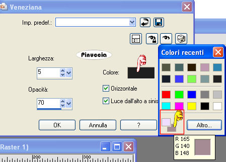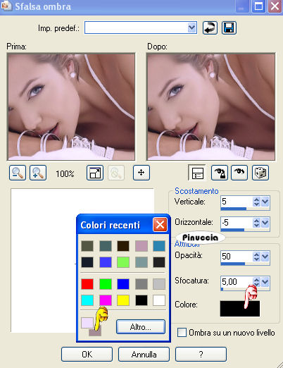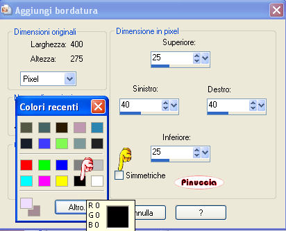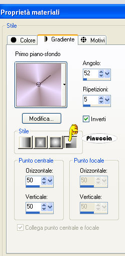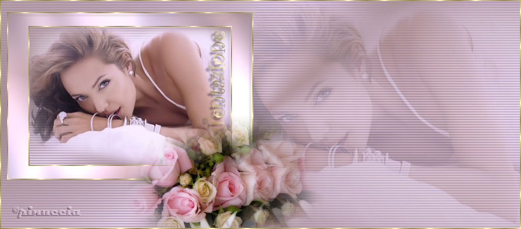 qui puoi trovare qualche risposta ai tuoi dubbi. Se l'argomento che ti interessa non è presente, ti prego di segnalarmelo. Occorrente: Il tube di un fiore a scelta. Il tube SS_655_Misted di Suzi. Un motivo oro. Motivo oro e tube qui Filtro Graphics Plus qui 1. Apri il tube SS_655_Misted di Suzi. Duplicalo con shift+D e chiudi l'originale. 2. Elimina il livello del watermark. 3. Apri una nuova immagine trasparente 400 x 275 pixels. 4. Imposta il colore di primo piano con #efdeff, e il colore di sfondo con #a58c94. 5. Passa il colore di primo piano a Gradiente di primo piano/sfondo, con i seguenti settaggi. ![]() Riempi l'immagine trasparente con questo gradiente.5. Regola>Sfocatura>Sfocatura gaussiana, raggio 8. 7. Effetti>Effetti di trama>Veneziana, con il colore di sfondo. ![]() metodo veloce per impostare il colore: clicca con il tasto destro del mouse sulla paletta del colore, apparirà la tavolozza dei colori e, in basso a sinistra, i due colori impostati come primo piano e sfondo, clicca sull'icona del colore di sfondo, e questo sarà selezionato. 8. Regola>Messa a fuoco>Metti a fuoco. 9. Selezione>Seleziona tutto. Livelli>Nuovo livello raster. Attiva il tube SS_655_Misted. Attiva lo strumento Selezione , rettangolo,sfumatura o tolleranza 0, e traccia un rettangolo attorno alla figura della donna, più o meno come nell'esempio sotto. ![]() Modifica>Copia. non chiudere il tube, perchè ti servirà ancora. Torna al tuo lavoro e vai a Modifica>Incolla>Incolla nella selezione. Selezione>Nessuna selezione. Livelli>Unisci>Unisci visibile. ![]() 10. Selezione>Seleziona tutto. Selezione>modifica>Contrai, di 2 pixels. Selezione>Inverti. Apri il motivo Gold-Fold e minimizzalo nella tua area di lavoro. Passa il colore di sfondo a Motivi, apri il menu cliccando sulla freccia a fianco del box e cercalo nella lista dei motivi disponibili. ![]() ti ho fatto impostare il motivo come colore di sfondo, per non cambiare continuamente le impostazioni del colore di primo piano, perchè dovrai riempire sia con il gradiente che con il motivo oro. In questo modo, sarà sufficiente cliccare con il tasto sinistro per riempire con il gradiente, e con il tasto destro per riempire con il motivo oro. Riempi la selezione con il motivo oro.se trovi difficile il riempimento, a causa dello spazio ristretto della selezione, usa lo zoom .Per ingrandire l'immagine, puoi anche usare la rotellina del mouse: portandola in avanti l'immagine si ingrandisce, portandola indietro si rimpicciolisce. ![]() Effetti>Effetti 3D>Sfalsa ombra, con i seguenti settaggi, e con il colore di sfondo. ![]() per impostare il colore, usa lo stesso sistema usato prima con l'effetto Veneziana. Selezione>Nessuna selezione. 11. Immagine>Aggiungi bordatura, simmetriche non selezionato, con i seguenti settaggi: ![]() cliccando con il tasto destro del mouse sulla paletta del colore si apre la tavolozza, clicca sul nero (manina rossa) e avrai il colore selezionato. Seleziona questo bordo con la bacchetta magica ,e riempilo con il gradiente.12. Effetti>Plugins>Graphics Plus - Cross Shadow: ![]() Selezione>Nessuna selezione. 13. Immagine>Aggiungi bordatura, 2 pixels, simmetriche, con il colore nero. Clicca con la bacchetta magica sul bordo nero per selezionarlo.Riempi la selezione con il motivo oro.Effetti>Effetti 3D>Sfalsa ombra, con gli stessi settaggi del punto 10. ![]() 14. Chiudi il colore di primo piano. Il colore di sfondo è impostato con il motivo oro. Attiva lo strumento Testo , scegli un bel font,imposta crea come vettore e scrivi il tuo testo. Immagine>Ruota>Ruota per gradi, 90 gradi a sinistra. ![]() Sposta il testo in alto a destra, lasciando un po' di spazio in basso, perchè quello spazio sarà coperto più tardi dal tube del fiore, vedi l'esempio finale. Livelli>Converti in livello raster. Effetti>Effetti 3D>Sfalsa ombra, con i settaggi usati al punto 10, ma con il colore nero: ![]() Livelli>Unisci>Unisci tutto. 15. Metti da parte questa immagine per il momento. 16. Apri una nuova immagine trasparente 1024 x 450 pixels. 17. Riempi l'immagine trasparente con il gradiente.Regola>Sfocatura>Sfocatura gaussiana, raggio 8. Effetti>Effetti di trama>Veneziana, con i settaggi precedenti. Regola>Messa a fuoco>Metti a fuoco. 18. Attiva lo strumento Selezione , rettangolo,e traccia una selezione su poco più di metà dell'immagine. ![]() Livelli>Nuovo livello raster. 19. Attiva nuovamente il tube, che dovrebbe avere ancora la selezione attiva. Modifica>Copia. Torna all'immagine grande sulla quale stai lavorando e vai a Modifica>Incolla>Incolla nella selezione. Abbassa l'opacità di questo livello al 25%. Selezione>Nessuna selezione. Livelli>Unisci>Unisci visibile. 20. Attiva lo strumento Attenua: ![]() e passa il mouse sulla linea tra il tube e lo sfondo, per sfumarla. ![]() 21. Attiva adesso la piccola immagine che hai messo da parte al punto 15 e vai a Modifica>Copia. Torna al tuo lavoro e vai a Modifica>Incolla>Incolla come nuovo livello. Sposta l'immagine a sinistra.![]() 22. Apri il tube con il fiore che hai scelto per eseguire il tutorial e vai a Modifica>Copia. Torna al tuo lavoro e vai a Modifica>Incolla>Incolla come nuovo livello. Se necessario, ridimensiona il tube (Immagine>Ridimensiona...). Se stai usando un misted e questo ti sembra troppo sfumato, eventualmente duplicalo per rendere i contorni più netti. Sposta il tube in basso a destra della piccola immagine.23. Livelli>Unisci>Unisci tutto. Selezione>Seleziona tutto. Selezione>modifica>Contrai, di 2 pixels. Selezione>Inverti. Riempi la selezione con il motivo oro.Selezione>Nessuna selezione. Aggiungi il tuo nome e/o il tuo watermark e salva in formato jpg. ![]() ![]() Se hai problemi o dubbi, o trovi un link non funzionante, o anche soltanto per un saluto, scrivimi. 3 Luglio 2007 |