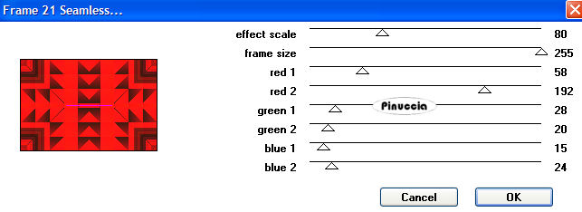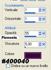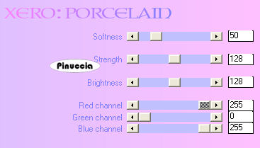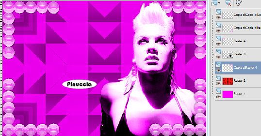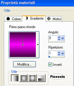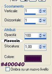 qui puoi trovare qualche risposta ai tuoi dubbi. Se l'argomento che ti interessa non è presente, ti prego di segnalarmelo. Occorrente: Materiale qui Apri il font e minimizzalo nella tua area di lavoro. Lo troverai nella lista dei font disponibili, quando userai lo strumento Testo. Filtri: Graphics Plus - Cross Shadow qui FM Tile Tools - Blend Emboss qui Xero - Porcelain qui Filter Factory Gallery P qui I filtri della Factory Gallery, prima di essere usati, devono essere convertiti. Come fare vedi qui 1. Apri una nuova immagine trasparente 600 x 400 pixels, e riempila con #ff00ff.Livelli>Nuovo livello raster. Riempi ancora con lo stesso colore.Effetti>Plugins>Filter Factory Gallery P - Frame 21 Seamless: ![]() Cambia la modalità di miscelatura di questo livello in Luminanza (Esistente) e abbassa l'opacità al 70%. ![]() 2. Apri il tube Pink e vai a Modifica>Copia. Torna al tuo lavoro e vai a Modifica>Incolla>Incolla come nuovo livello. Immagine>Ridimensiona, a 600 pixels di altezza. Sposta il tube a destra.Cambia la modalità di miscelatura di questo livello in Luminanza (esistente) Effetti>Effetti 3D>Sfalsa ombra, con i seguenti settaggi, colore #400040: ![]() 3. Apri il tube Bubble Corner e vai a Modifica>Copia. Torna al tuo lavoro e vai a Modifica>Incolla>Incolla come nuovo livello. Effetti>Effetti 3D>Sfalsa ombra, con i settaggi del punto 2. Livelli>Duplica. Immagine>Rifletti. Livelli>Duplica. Immagine>Capovolgi. Livelli>Duplica. Immagine>Rifletti. Nella paletta dei livelli sposta il livello dell'angolo superiore destro sotto il livello del tube della donna, in modo che le bolle si trovino sotto la testa. ![]() 4. Livelli>Unisci>Unisci visibile. Attiva lo strumento Selezione , rettangolo,e traccia un rettangolo sul lato sinistro. Livelli>Nuovo livello raster. Il colore di primo piano è già impostato correttamente con il colore rosa. Imposta il colore di sfondo con #400040. Passa il colore di primo piano a Gradiente di primo piano/sfondo, con i seguenti settaggi: ![]() Riempi il nuovo livello con questo gradiente.5. Apri l'immagine Herz1 e vai a Modifica>Copia. Torna al tuo lavoro e vai a Modifica>Incolla>Incolla nella selezione. Selezione>Modifica>Contrai, di 2 pixels. Selezione>Inverti. Selezione>Mobile. Selezione>Immobilizza. Livelli>Nuovo livello raster. Riempi il bordo con il gradiente.Effetti>Plugins>Graphics Plus, Cross Shadow, con i settaggi standard. ![]() Ripeti l'Effetto Cross Shadow. Selezione>Nessuna selezione. Effetti>Effetti 3D>Sfalsa ombra, con i seguenti settaggi, colore #400040. ![]() Ripeti l'Effetto Sfalsa ombra, ma cambiando verticale e orizzontale a -1. Chiudi il livello di sfondo. Livelli>Unisci>Unisci visibile. Immagine>Ridimensiona, all'85%, tutti i livelli non selezionato. ![]() ![]() 6. Apri il tube Speak e vai a Modifica>Copia. Torna al tuo lavoro e vai a Modifica>Incolla>Incolla come nuovo livello. Spostalo sotto l'immagine del cuore, come mostrato nella schermata sotto:![]() Effetti>Effetti 3D>Sfalsa ombra, con i settaggi del punto 5. 7. Attiva lo strumento Testo , font Soopafresh, corsivo, dimensione 24, crea come vettore.Imposta il colore di sfondo con #400040, e il colore di primo piano con il rosa. Scrivi all'interno del tube Speak la parola Think. Livelli>Nuovo livello raster. Cambia la dimensione a 36, e scrivi la parola P!nk. Attenzione, il punto esclamativo al posto della lettera "i". Livelli>Converti in livello raster. ![]() 8. Livelli>Unisci>Unisci tutto. Immagine>Aggiungi bordatura, 2 pixels, simmetriche, con il colore #400040. Immagine>Aggiungi bordatura, 4 pixels, simmetriche, con il colore bianco. Seleziona il bordo con la bacchetta magica ![]() e riempilo con il gradiente.Effetti>Plugins>Graphics Plus - Cross Shadow, con i settaggi standard, 2 volte. Selezione>Nessuna selezione. Immagine>Aggiungi bordatura, 2 pixels, simmetriche, con il colore #404000. 9. Immagine>Aggiungi bordatura, con il colore bianco, simmetriche non selezionato. ![]() Seleziona il bordo con la bacchetta magica ,e riempilo con il gradiente.Effetti>Plugins>Graphics Plus - Cross Shadow, con i settaggi standard, 2 volte. Regola>Aggiungi/Rimuovi disturbo/Aggiungi disturbo: ![]() 10. Selezione>Nessuna selezione. Seleziona ancora il font Soopafresh, corsivo, la dimensione a seconda della lunghezza del tuo nome. Colore di sfondo impostato con il roso e il colore di primo piano con #400040. Scrivi il tuo nome. Livelli>Converti in livello raster. Immagine>Ruota>Ruota per gradi, 90 gradi a sinistra. ![]() 11. Sposta il testo nella striscia a sinistra.Effetti>Effetti di trama>Veneziana, con i seguenti settaggi, colore #400040: ![]() Effetti>Effetti 3D>Sfalsa ombra, con i seguenti settaggi, colore #400040. ![]() Ripeti l'Effetto Sfalsa ombra, ma cambiando verticale e orizzontale a -1. Livelli>Unisci>Unisci tutto. 12. Immagine>Aggiungi bordatura, 2 pixels, simmetriche, con il colore #400040. Immagine>Aggiungi bordatura, 4 pixels, simmetriche, con il colore bianco. Seleziona il bordo con la bacchetta magica ![]() e riempilo con il gradiente.Effetti>Plugins>Graphics Plus - Cross Shadow, con i settaggi standard, 2 volte. Selezione>Nessuna selezione. 13. Effetti>Plugins>FM Tile Tools - Blend Emboss, con i settaggi standard: ![]() Effetti>Plugins>Xero - Porcelain: ![]() 14. Immagine>Ridimensiona, a 580 pixels di larghezza. Aggiungi, se vuoi, il tuo watermark, e salva in formato jpg. ![]() Se hai problemi o dubbi, o trovi un link non funzionante, o anche soltanto per un saluto, scrivimi 3 Aprile 2007 |