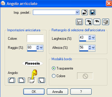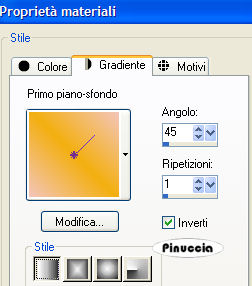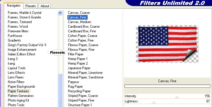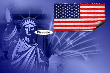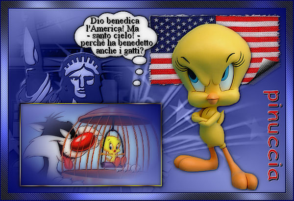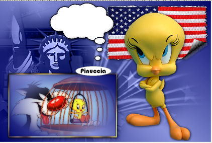 qui puoi trovare qualche risposta ai tuoi dubbi. Se l'argomento che ti interessa non è presente, ti prego di segnalarmelo. Occorrente: Materiale qui Filtri: Graphics Plus qui FM Tile Tools qui Filters Unlimited qui Patry ha concesso soltanto l'uso personale dei suoi tubes. Non puoi usarli per i tuoi tutorials. Non cambiare il nome del file e non cancellare il livello del copyright. 1. Apri una nuova immagine trasparente 600 x 400 pixels. Imposta il colore di primo piano con #8893db, e il colore di sfondo con #030769. Passa il colore di primo piano a Gradiente di primo piano/sfondo, con i seguenti settaggi: ![]() 2. Riempi l'immagine trasparente con questo gradiente.Selezione>Seleziona tutto. Livelli>Nuovo livello raster. Apri il tube PatryMists_06_4july_03 e vai a Modifica>Copia. Torna al tuo lavoro e vai a Modifica>Incolla>Incolla nella selezione. 3. Cambia la modalità di miscelatura di questo livello in Luminanza (esistente) e abbassa l'opacità al 60%. Selezione>Nessuna selezione. 4. Attiva lo strumento Selezione ![]() e disegna un rettangolo in alto a destra. Livelli>Nuovo livello raster. 5. Apri il tube Amerikanische Flagge e vai a Modifica>Copia. Torna al tuo lavoro e vai a Modifica>Incolla>Incolla nella selezione. 6. Effetti>Effetti di immagine>Angolo arricciato: ![]() 7. Effetti>Plugins>Filters Unlimited - Paper Textures, Canvas Fine: ![]() Selezione>Nessuna selezione. 8. Effetti>Effetti 3D>Sfalsa ombra: ![]() ![]() 9. Attiva il livello centrale. Apri il tube PatryMists_06_4july_02 e vai a Modifica>Copia. Torna al tuo lavoro e vai a Modifica>Incolla>Incolla come nuovo livello. Sposta il tube in basso a sinistra,e cambia la modalità di miscelatura di questo livello in Luminanza (esistente). ![]() 10. Apri il tube Tweety di Mulligan e vai a Modifica>Copia. Torna al tuo lavoro, posizionati sul livello superiore, e vai a Modifica>Incolla>Incolla come nuovo livello. Sposta il tube a destra.Effetti>Effetti 3D>Sfalsa ombra, con i settaggi usati al punto 8. ![]() 11. Attiva nuovamente lo strumento Selezione ![]() e disegna un rettangolo in basso a sinistra. Livelli>Nuovo livello raster. Riempi la selezione con il gradiente.Apri il tube Sylvester-Tweety e vai a Modifica>Copia. Torna al tuo lavoro e vai a Modifica>Incolla>Incolla nella selezione. Mantieni selezionato. 12. Imposta il colore di sfondo con #f31f0f, e il colore di primo piano con #f2c5b9. Con questi colori crea un gradiente, con gli stessi settaggi del punto 1. ![]() 13. Selezione>Modifica>Contrai, di 2 pixels. Selezione>Inverti. Selezione>Mobile. Selezione>Immobilizza. Livelli>Nuovo livello raster. Riempi il bordo con il nuovo gradiente.Effetti>Plugins>Graphics Plus - Cross Shadow, con i settaggi standard, 2 volte. Effetti>Effetti 3D>Sfalsa ombra, con i settaggi precedenti. Selezione>Nessuna selezione. 14. Livelli>Unisci>Unisci giù. Effetti>Effetti 3D>Sfalsa ombra, con i settaggi precedenti. 15. Apri il tube Thinkbubble e vai a Modifica>Copia. Torna al tuo lavoro e vai a Modifica>Incolla>Incolla come nuovo livello. Immagine>Ridimensiona, all'80%, ricampionamento bicubica, tutti i livelli non selezionato. ![]() Ripeti l'Effetto Sfalsa ombra. Sposta il fumetto in alto a destra dell'immagine di Tweety e del gatto Silvestro.![]() 16. Imposta il colore di sfondo con il nero. Attiva lo strumento Testo , io ho usato il font Times New Roman.Scrivi un testo nel fumetto. Io ho scritto una riga alla volta, convertendola in livello raster. Per ciascuna riga del testo: Effetti>Effetti 3D>Sfalsa ombra, con i seguenti settaggi, colore nero. ![]() 17. Controlla che tutto sia posizionato correttamente. Se necessario, puoi ancora spostare gli elementi della tua tag. Livelli>Unisci>Unisci visibile. 18. Imposta il colore di primo piano con il bianco, e il colore di sfondo con #d80b0e. Attiva nuovamente lo strumento testo , font Comic Sans MS, crea come vettore,la dimensione dipenderà dalla lunghezza del tuo nome. Scrivi il tuo nome sulla tag e posizionalo a destra, vicino al bordo. Per ruotare il testo, puoi usare i nodi del vettore, oppure vai a Immagine>Ruota>Ruota per gradi, 90 gradi a destra. Livelli>Converti in livello raster. Effetti>Effetti 3D>Smusso a incasso: ![]() 19. Effetti>Effetti 3D>Sfalsa ombra, con i settaggi usati al punto 16: ![]() Ripeti l'Effetto Sfalsa ombra. 20. Livelli>Unisci>Unisci tutto. Immagine>Aggiungi bordatura, 2 pixels, simmetriche, con il primo colore di sfondo. Immagine>Aggiungi bordatura, 15 pixels, simmetriche, con il colore bianco. Seleziona il bordo bianco con la bacchetta magica ![]() Imposta il primo gradiente del punto 1, e riempi il bordo con questo gradiente.Effetti>Plugins>Graphics Plus - Cross Shadow: Ripeti l'Effetto Cross Shadow. 21. Effetti>Plugins>Penta.com - Jeans, con i settaggi standard: ![]() Regola>Messa a fuoco>Metti a fuco. Selezione>Nessuna selezione. Immagine>Aggiungi bordatura, 2 pixels, simmetriche, con il colore scuro di sfondo. 22. Effetti>Plugins>FM Tile Tools - Blend Emboss, con i settaggi standard. ![]() 23. Effetti>Plugins>Xero - Porcelain: ![]() Non dimenticare il tuo watermark. Immagine>Ridimensiona, a 600 pixels di larghezza. Salva in formato jpg. ![]() Se hai problemi o dubbi, o trovi un link non funzionante, o anche soltanto per un saluto, scrivimi. 12 Giugno 2007 |