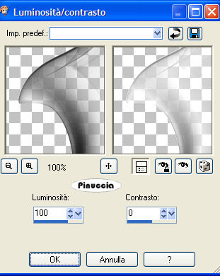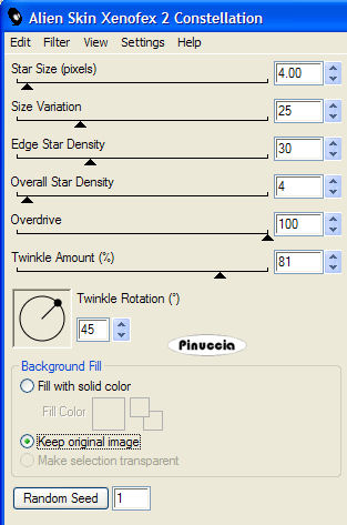 qui puoi trovare qualche risposta ai tuoi dubbi. Se l'argomento che ti interessa non è presente, ti prego di segnalarmelo. Questo tutorial è stato creato con PSP 9, ma può essere eseguito anche con le altre versioni di PSP. Occorrente: a scelta: il tube di un profumo, il misted di un viso, un motivo argento, un font. Il tube del velo ""Mariel2006juin_smokeblue" che trovi qui per tradurre il tutorial, ho usato tubes di Patry, Sassyillusions e Caro Filtro: Alien Skin Xenofex 2 qui 1. Apri una nuova immagine trasparente 700 x 500 pixels, e riempila con il colore nero (#000000).Apri il tube con il viso e vai a Modifica>Copia. Torna all'immagine nera e vai a Modifica>Incolla>Incolla come nuovo livello. Sposta il viso come preferisci.2. Apri il tube di Mariel "smokeblue" e vai a Modifica>Copia. Regola>Saturazione e tonalità>Viraggio. ![]() Regola>Luminosità e contrasto>Luminosità e contrasto. ![]() Modifica>Copia. Torna al tuo lavoro e vai a Modifica>Incolla>Incolla come nuovo livello. Sposta il velo a destra.Abbassa l'opacità di questo livello al 60%. Livelli>Duplica. Immagine>Rifletti. Immagine>Capovolgi. Sposta il velo duplicato sopra il volto.![]() 3. Attiva il livello con il tube del viso. Apri il tube con il profumo e vai a Modifica>Copia. Torna al tuo lavoro e vai a Modifica>Incolla>Incolla come nuovo livello. Regola>Saturazione e Tonalità>Viraggio, con i settaggi precedenti. Regola >Luminosità e contrasto>Luminosità e contrasto, con i settaggi precedenti. Gioca eventualmente con i settaggi in modo che il tube non diventi troppo scuro. Se necessario, ridimensiona il tube (Immagine>Ridimensiona...). Posiziona il flacone a destra. Se hai difficoltà a spostare il flacone, chiudi momentaneamente i livelli del velo. Quando è tutto a posto, ricordati di rendere nuovamente visibili tutti i livelli. Livelli>Unisci>Unisci visibile. 4. Selezione>Seleziona tutto. Selezione>Modifica>Contrai, di 18 pixels. Selezione>Inverti. Apri il tuo motivo argento e minimizzalo nella tua area di lavoro. Passa il colore di primo piano a Motivi e seleziona il motivo argento. Riempi la selezione con il motivo argento.Selezione>Seleziona tutto. Selezione>modifica>Contrai, di 16 pixels. Selezione>Inverti. Imposta il colore di sfondo con il nero. Riempi la selezione con il nero.per riempire con il colore di sfondo, devi cliccare con il tasto destro del mouse. Selezione>Seleziona tutto. Selezione>Modifica>Contrai, di 2 pixels. Selezione>Inverti. Riempi la selezione con il motivo argento.Selezione>Nessuna selezione. 5. Dovresti avere il motivo argento impostato come colore di primo piano e il nero impostato come colore di sfondo. Va bene così. Attiva lo strumento Testo , crea come vettore. Scegli un font e scrivi il tuo testo.Livelli>Converti in livello raster. Effetti>Effetti 3D>Sfalsa ombra, con i seguenti settaggi, con il colore #c0c0c0: ![]() Ripeti l'Effetto Sfalsa ombra. Regola>Messa a fuoco>Metti a fuoco. 6. Se vuoi aggiungere la tua firma, questo è il momento di farlo. Livelli>Unisci>Unisci tutto. Attiva lo strumento Selezione a mano libera , punto a punto,sfumatura 5, e seleziona una parte del flacone di profumo. Effetti>Plugins> Alien Skin Xenofex 2 - Constellation, con i seguenti settaggi: ![]() Selezione>Nessuna selezione. Modifica>Copia. Apri Animation Shop. Clicca con il tasto destro del mouse sullo spazio vuoto e Incolla come nuova animazione. ![]() Ritorna in PSP. Modifica>Annulla azione Deseleziona. Modifica>Annulla azione Constellation. Effetti>Plugins>Alien Skin Xenofex 2 - Constellation, con i settaggi precedenti, ma clicca una volta sul tasto Random Seed. Selezione>Nessuna selezione. Modifica>Copia. In Animation Shop: Modifica>Incolla>Incolla dopo il fotogramma corrente. Ancora una volta in PSP. Modifica>Annulla azione Deseleziona. Modifica>Annulla azione Constellation. Ripeti l'Effetto Constellation, con gli stessi settaggi, ma cliccando una volta sul tasto Random Seed. Selezione>Nessuna selezione. Modifica>Copia. In Animation Shop: Modifica>Incolla>Incolla dopo il fotogramma corrente. La tua animazione è pronta. 7. Modifica>Seleziona tutto. Animazione>Proprietà fotogramma, e imposta la velocità a 15. ![]() Salva in formato gif.