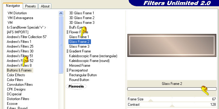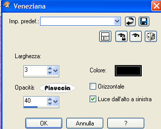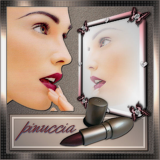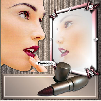 qui puoi trovare qualche risposta ai tuoi dubbi. Se l'argomento che ti interessa non è presente, ti prego di segnalarmelo. Occorrente: Materiale qui 2 tubes di Patry, il tube dello specchio di Angel Epiphanie. Metti la maschera nella cartella maschere di PSP. Filtri: Filters Unlimited 2.0 qui FM Tile Tools qui Xero - Porcelain qui Penta.com qui Graphics Plus qui Patry ha concesso soltanto l'uso personale dei loro tubes. Non puoi usarli per i tuoi tutorials. Non cambiare il nome del file e non cancellare il livello del copyright. 1. Apri una nuova immagine trasparente 500 x 500 pixels. Imposta il colore di primo piano con #d9c2b1, e il colore di sfondo con #7d736f. Passa il colore di primo piano a Gradiente di primo piano/sfondo: ![]() Riempi l'immagine trasparente con questo gradiente.2. Regola>Aggiungi/rimuovi disturbo>Aggiungi disturbo: ![]() 3. Effetti>Effetti di trama>Veneziana: ![]() ![]() 4. Apri il tube Mirror. Fai una copia con shift+D e chiudi l'originale. Vedrai che il tube ha diversi livelli. Se vuoi, puoi adattare le varie parti del tube. Eventualmente, anche cambiare il colore. Elimina il livello del watermark e vai a Livelli>Unisci>Unisci visibile. Modifica>Copia. Torna al tuo lavoro e vai a Modifica>Incolla>Incolla come nuovo livello. Sposta lo specchio in alto a destra.![]() Apri il tube di Patry "PatryTubes_06_OnlyFace" e vai a Modifica>Copia. Torna al tuo lavoro e vai a Modifica>Incolla>Incolla come nuovo livello. Immagine>Ridimensiona, all'80%, tutti i livelli non selezionato. ![]() Sposta il viso sul lato sinistro.![]() 5. Livelli>Duplica. Immagine>Rifletti. Immagine>Ridimensiona, all'85%, bicubica, tutti i livelli non selezionato. 6. Livelli>Carica/Salva maschera>Carica maschera da disco. Cerca e carica la maschera 20-20: ![]() Livelli>Unisci>Unisci gruppo. Sposta il viso nello specchio.Abbassa l'opacità di questo livello al 70%. ![]() 7. Chiudi il livello originale del tube (a sinistra) e il livello di sfondo. Lascia visibili il livello dello specchio e il livello del duplicato del viso. ![]() Livelli>Unisci>Unisci visibile. 8. Attiva il livello dello specchio. Attiva lo strumento Deformazione ![]() Lo specchio deve vedersi in prospettiva. Tieni premuto il tasto shift spingi gli angoli in alto e in basso a sinistra verso l'interno, e alza leggermente gli angoli in alto e in basso a destra. Il nodo centrale serve, se necessario, a ridurre la larghezza dello specchio. ![]() se non riesci a vedere e tirare i nodi sulla destra, posiziona il mouse sul bordo dell'immagine, quando vedrai una doppia freccia nera "tira" l'immagine a destra e avrai questo: ![]() 9. Regola>Messa a fuoco>Metti a fuoco. 10. Attiva il livello dello specchio. Effetti>Effetti 3D>Sfalsa ombra: ![]() Attiva il livello del viso. Effetti>Effetti 3D>Sfalsa ombra, con gli stessi settaggi. 11. Attiva lo strumento Selezione , rettangolo,e disegna una selezione sotto lo specchio. Livelli>Nuovo livello raster. Cambia i settaggi del gradiente: ![]() Riempi la selezione con il gradiente.Mantieni selezionato. Effetti>Plugins>Filters Unlimited - Buttons and Frames, Glass Frame 2: ![]() Selezione>Nessuna selezione. 12. Effetti>Effetti 3D>Sfalsa ombra, con i settaggi usati al passo 10. Nella paletta dei livelli trascina il livello con la striscia sotto quello dello specchio. 13. Apri il tube di Patry Tubes_06_beauty_117 e vai a Modifica>Copia. Torna al tuo lavoro e vai a Modifica>Incolla>Incolla come nuovo livello. Immagine>Ridimensiona, al 60%, tutti i livelli non selezionato. ![]() Sposta il rossetto sulla striscia, davanti allo specchio.Effetti>Effetti 3D>Sfalsa ombra, con i settaggi usati al passo 10. ![]() ![]() 14. Imposta il colore di sfondo con un bel colore preso dall'immagine. Io ho scelto dal rossetto un colore bordeaux. Attiva lo strumento Testo ![]() scegli un bel font, crea come vettore, e scrivi il tuo nome sulla tag. Io ho usato il font Monika, 48 pixels. il settaggio della dimensione dipenderà dalla lunghezza del tuo testo e dalla versione di PSP che stai usando. Sulle differenze tra PSP 9 e PSP X, vedi in fondo a questa pagina Livelli>Converti in livello raster. Effetti>Effetti 3D>Sfalsa ombra, con i settaggi precedenti. 15. Livelli>Unisci>Unisci tutto. Immagine>Aggiungi bordatura, 2 pixels, simmetriche, con il colore scuro di sfondo. Immagine>Aggiungi bordatura, 20 pixels, simmetriche, con un colore qualsiasi, purchè non presente nell'immagine (non bianco). Seleziona il bordo bianco con la bacchetta magica ![]() Riempi la seleizone con il gradiente (angolo 45).Effetti>Plugins>Graphics Plus - Cross Shadow: ![]() Ripeti l'Effetto Cross Shadow. 16. Effetti>Plugins>Penta.com - Dot and Cross, con i settaggi standard. ![]() Regola>Messa a fuoco>Accentua messa a fuoco. Selezione>Nessuna selezione. Immagine>Aggiungi bordatura, 2 pixels, simmetriche, con il colore scuro di sfondo. 17. Aggiungi, se vuoi, il tuo watermark alla tag. 18. Effetti>Plugins>FM Tile Tools - Blend Emboss, con i settaggi standard. ![]() Effetti>Plugins>Xero - Porcelain: ![]() 19. Immagine>Ridimensiona, a 500 pixels di larghezza. Salva in formato jpg. ![]() Se hai problemi o dubbi, o trovi un link non funzionante, o anche soltanto per un saluto, scrivimi. 10 Giugno 2007 |
