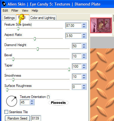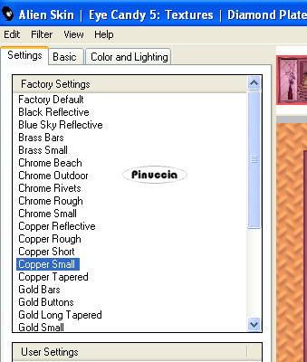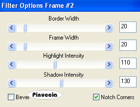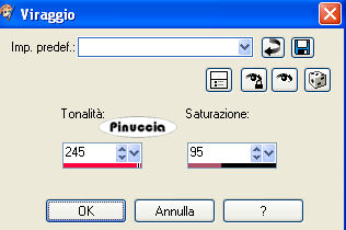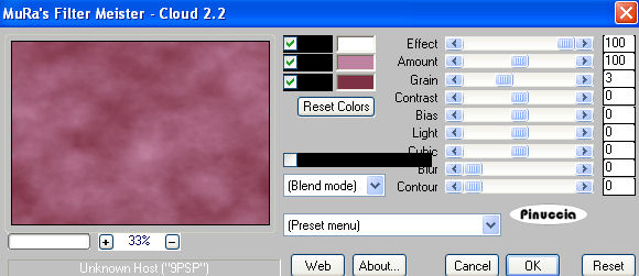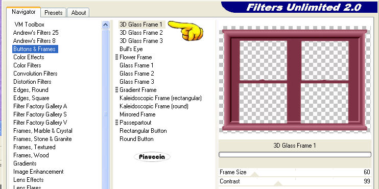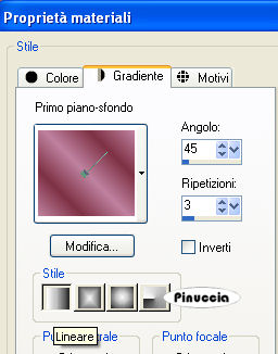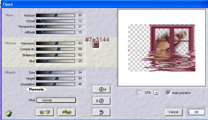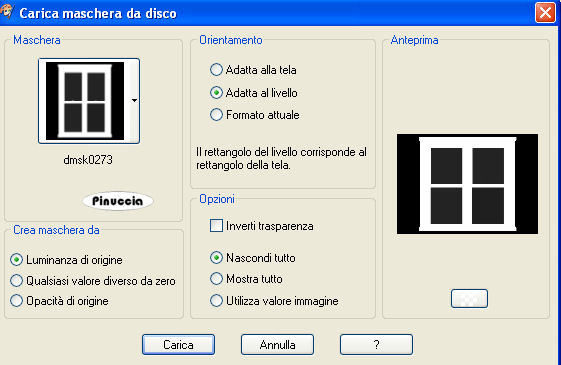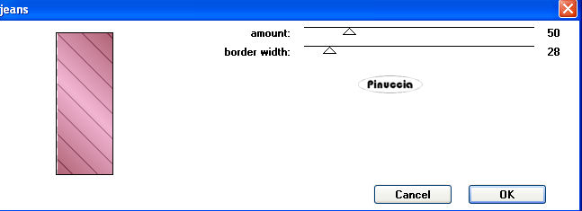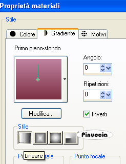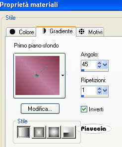 qui puoi trovare qualche risposta ai tuoi dubbi. Se l'argomento che ti interessa non è presente, ti prego di segnalarmelo. Occorrente: Materiale qui I tubes PatryMists_06_Fashion54 e Mtm Bloemen 162_05, la maschera dmsk0273 e il font November. Metti la maschera nella cartella maschere. Apri il font e minimizzalo nella tua area di lavoro. Lo troverai nella lista dei font disponibili quando ti servirà. Filtri: Filters Unlimited qui Flaming Pear qui Alien Skin Eye Candy 5 Textures qui Graphics Plus qui Mura's Meister qui Eye Candy 4000 Glass qui Brigitte e Patry hanno concesso l'uso soltanto personale dei loro tubes. Non puoi usarli per i tuoi tutorials. Non cambiare il nome dei tubes e non cancellare i copyrights. 1. Apri una nuova immagine trasparente 700 x 500 pixels. Imposta il colore di primo piano con #bf82a0, e il colore di sfondo con #7e3144. Passa il colore di primo piano a Gradiente di primo piano/sfondo, con i seguenti settaggi: ![]() Riempi l'immagine trasparente con questo gradiente.2. Livelli>Nuovo livello raster. Riempi il nuovo livello con il colore scuro di sfondo.3. Livelli>Carica/Salva maschera>Carica maschera da disco: cerca e carica la maschera dmsk0273: ![]() Livelli>Unisci>Unisci gruppo. 4. Attiva lo strumento Deformazione ![]() se stai usando PSP X è lo strumento Puntatore ![]() e allarga la maschera per tutta la larghezza dell'immagine. ![]() 5. Effetti>Plugins>Filters Unlimited - Buttons and Frames - 3D Glass Frame1: ![]() 6. Effetti>Effetti 3D>Sfalsa ombra, con i seguenti settaggi: ![]() 7. Attiva il livello inferiore. Apri il tube PatryMists_06_Fashion54 e vai a Modifica>Copia. Torna al tuo lavoro e vai a Modifica>Incolla>Incolla come nuovo livello. Nascondi il livello della maschera e sposta il tube più in basso a sinistra.8. Livelli>Unisci>Unisci giù. Rimani sul livello superiore. Immagine>Ridimensiona, al 70%, tutti i livelli non selezionato. ![]() Sposta l'immagine della finestra nell'angolo in alto a destra.non preoccuparti per la parte del tube sulla parte inferiore. Alla fine del tutorial, non si vedrà più. ![]() 9. Attiva lo strumento Selezione , rettangolo,e disegna un rettangolo sul lato sinistro. Livelli>Nuovo livello raster. Cambia i settaggi del gradiente: ![]() Riempi la selezione con questo gradiente.10. Effetti>Plugins>Penta.com - Jeans: ![]() Selezione>Nessuna selezione. Livelli>Duplica. Immagine>Rifletti. Posiziona correttamente il rettangolo sopra il precedente.Abbassa l'opacità di questo livello al 50%. Nascondi tutti i livelli tranne questi ultimi con il rettangolo e vai a Livelli>Unisci>Unisci visibile. Adesso puoi rendere nuovamente visibili gli altri livelli (Livelli>Visualizza>Tutto). Rimani sul livello superiore. Selezione>Seleziona tutto. Selezione>mobile. Selezione>Immobilizza. Effetti>Plugins>Bordermania - Frame #2: ![]() Effetti>Effetti 3D>Sfalsa ombra, con i settaggi usati al punto 6. 11. Apri il tube Mtm Bloemen 162_05 e vai a Modifica>Copia. Torna al tuo lavoro e vai a Modifica>Incolla>Incolla come nuovo livello. Immagine>Ridimensiona, al 60%, tutti i livelli non selezionato. ![]() Attiva lo strumento Deformazione ![]() Puntatore se stai usando PSP X.e "stringi" il tube all'interno della cornice. Cambia la modalità di miscelatura di questo livello in Luminanza (esistente). Effetti>Effetti 3D>Sfalsa ombra, con i settaggi precedenti. 12. Attiva il livello inferiore. Effetti>Plugins>Mura's Meister - Cloud: ![]() ![]() 13. Ritorna sul livello della Finestra. Effetti>Plugins>Flaming Pear - Flood, con i seguenti settaggi, e con il colore scuro di sfondo: ![]() 14. Attiva lo strumento Gomma e cancella attentamente le onde lungo il lato destra, per ammorbidire il movimento delle onde.Se necessario, fai lo stesso anche sul lato sinistro vicino al tube del vaso. Assicurati di essere posizionato sul livello della finestra. ![]() Livelli>Unisci>Unisci visibile. 15. Imposta il colore di sfondo con il bianco, e chiudi il livello di primo piano. Attiva lo strumento Testo ,seleziona il font November, crea come vettore, la dimensione dipenderà dalla lunghezza del testo. Scrivi il tuo nome. Livelli>converti in livello raster. 16. Attiva lo strumento Bacchetta magica e seleziona le lettere del testo.Riempi la selezione con il gradiente così impostato:![]() Mantieni selezionato. Effetti>Plugins>Eye Candy 4000 - Glass: sotto la linguetta Bevel Profile seleziona Button: ![]() sotto la linguetta Basic imposta il colore chiaro di primo piano: cliccando sulla paletta del colore, questo sarà impostato sulla paletta più grande: ![]() Selezione>Nessuna selezione. 17. Effetti>effetti 3D>Sfalsa ombra, con i seguenti settaggi: ![]() Ripeti l'Effetto Sfalsa ombra. 18. Livelli>Duplica. Immagine>Capovolgi. Sposta il nome capovolto sotto l'originale,in modo che sembri riflesso. Abbassa l'opacità di questo livello al 50%. 19. Livelli>Unisci>Unisci tutto. Immagine>Aggiungi bordatura, 2 pixels, simmetriche, con il colore scuro di sfondo. Immagine>Aggiungi bordatura, 30 pixels, simmetriche, con il colore bianco. Seleziona il bordo con la bacchetta magica ![]() e riempilo con l'ultimo gradiente.Effetti>Plugins>Graphics Plus - Cross Shadow, con i settaggi standard. ![]() 20. Effetti>Plugins>Alien Skin Eye Candy 5 - Textures, Diamond Plate: imposta Copper Small: ![]() Nella paletta Basic, imposta la dimensione come preferisci (puoi controllare il risultato nella finestra di anteprima). ![]() 21. Mantieni selezionato. Regola>Saturazione e tonalità>Viraggio: ![]() Effetti>Plugins>Graphics Plus - Cross Shadow, con i settaggi standard, 2 volte. 22. Selezione>Nessuna selezione. Immagine>Aggiungi bordatura, 2 pixels, simmetriche, con il colore scuro di sfondo. 23. Aggiungi il tuo watermark. Immagine>Ridimensiona, a 600 pixels di larghezza, e salva in formato jpg. ![]() Se hai problemi o dubbi, o trovi un link non funzionante, o anche soltanto per un saluto, scrivimi. 27 Aprile 2007 |