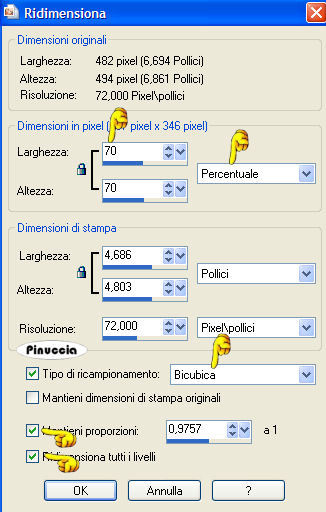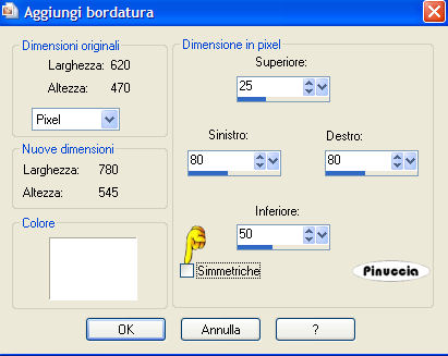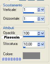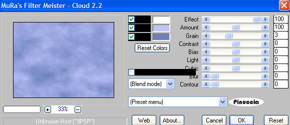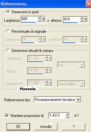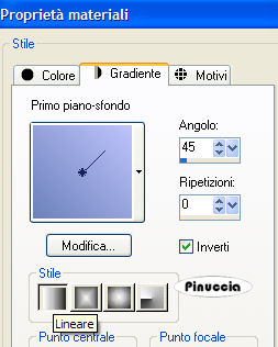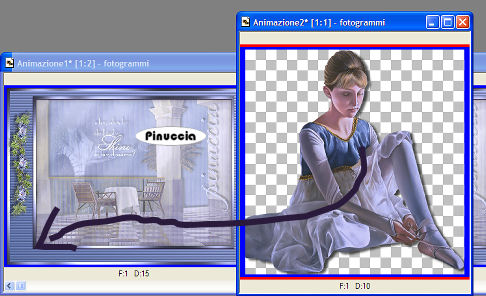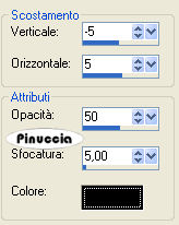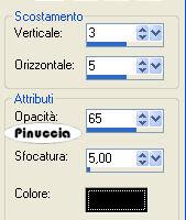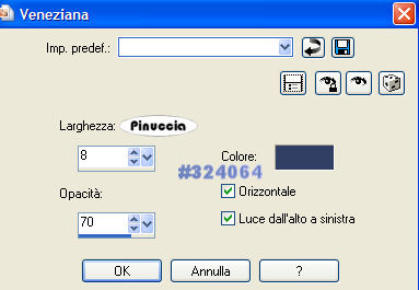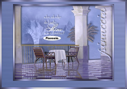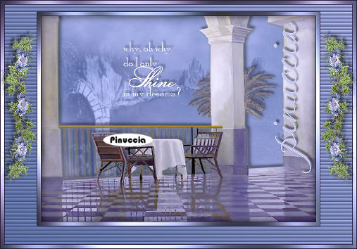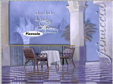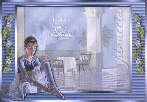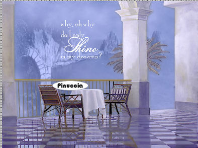 qui puoi trovare qualche risposta ai tuoi dubbi. Se l'argomento che ti interessa non è presente, ti prego di segnalarmelo. Occorrente: Materiale qui Nello zip trovi: i tubes: DaisyWeb_Capri, hmo_terrasse, hmo_Dancer e blumen_ranke. l'animazione curtain, il pennello aRavenBrush!poem!shine (importalo in PSP: come fare vedi qui). ti servirà inoltre un font a tua scelta. Filtri: Graphics Plus qui Mura's Meister qui 1. Apri una nuova immagine trasparente 600x450 Pixel. Imposta il colore di primo piano con #bec3fb, e il colore di sfondo con #6c81bb. Effetti>Plugins>Mura's Meister - Clouds: ![]() 2. Selezione>Seleziona tutto. Livelli>Nuovo livello raster. Apri il tube DaisyWeb_Capri e vai a Modifica>Copia. Torna al tuo lavoro e vai a Modifica>Incolla>Incolla nella selezione. Selezione>Nessuna selezione. Cambia la modalità di miscelatura di questo livello in Luminanza (esistente) e abbassa l'opacità al 60%. 3. Selezione>Seleziona tutto. Livelli>Nuovo livello raster. Apri il tube hmo_terrasse e vai a Modifica>Copia. Torna al tuo lavoro e vai a Modifica>Incolla>Incolla nella selezione. Selezione>Nessuna selezione. Effetti>Effetti 3D>Sfalsa ombra, con i seguenti settaggi, colore #808080: ![]() 4. Imposta il colore di primo piano sul bianco. Attiva lo strumento Pennello ,cerca e seleziona il pennello Poems_shine. Livelli>Nuovo livello raster. Applica il pennello, con dimensione 150 pixels, come nel mio esempio. ![]() Effetti>Effetti 3D>Sfalsa ombra, con i seguenti settaggi: ![]() 5. Attiva lo strumento Testo e seleziona un bel font, crea come vettore.Imposta il colore di sfondo con #bec3fb, chiudi il colore di primo piano. Scrivi il tuo nome. La dimensione dipenderà dalla lunghezza del nome e dalla versione di PSP che stai usando. alcuni appunti sullo strumento Testo li trovi qui Immagine>Ruota>Ruota per gradi: ![]() Sposta il tuo nome sul lato destro.Livelli>Converti in livello raster. Effetti>Effetti 3D>Sfalsa ombra, con gli stessi settaggi usati per il pennello. Regola>Messa a fuoco>Metti a fuoco. Aggiungi il tuo watermark. Livelli>Unisci>Unisci tutto. ![]() 6. Immagine>Aggiungi bordatura, 1 pixel, simmetriche, con il colore #291939. Immagine>Aggiungi bordatura, 8 pixels, simmetriche, con il colore #bec3fb. Seleziona il bordo con la bacchetta magica , sfumatura e tolleranza 0.Effetti>Plugins>Graphics Plus - Cross Shadow, con i settaggi standard. ![]() Selezione>Nessuna selezione. Immagine>Aggiungi bordatura, 1 pixel, simmetriche, con il colore #291939. 7. Selezione>Seleziona tutto. Selezione>Modifica>Contrai, di 10 pixels. Livelli>Nuovo livello raster. Effetti>Effetti 3D>Ritaglio: ![]() Selezione>Nessuna selezione. Livelli>Unisci>Unisci tutto. 8. Immagine>Aggiungi bordatura, con il colore bianco, simmetriche non selezionato: ![]() Seleziona il bordo con la bacchetta magica ![]() Imposta il colore di sfondo con #6c81bb e il colore di primo piano con #bec3fb. Passa il colore di primo piano a Gradiente di primo piano/sfondo, con i seguenti settaggi: ![]() Riempi il bordo con questo gradiente.Effetti>Effetti di trama>Veneziana, con il colore #324064: ![]() 9. Selezione>Seleziona tutto. Selezione>Modifica>Contrai di 10 pixels. Selezione>Inverti. Riempi con #2a1a3b.Selezione>Seleziona tutto. Seleziona>Modifica>Contrai, di 9 pixels. Selezione>Inverti. Riempi con #b8bdf4.Effetti>Plugins>Graphic Plus, Cross Shadow, con i settaggi standard. Selezione>Seleziona tutto. Selezione>Modifica>Contrai, di 1 pixel. Selezione>Inverti. Riempi con il colore scuro (#2a1a3b).Selezione>Nessuna selezione. ![]() 10. Apri il tube blumen_ranke e vai a Modifica>Copia. Torna al tuo lavoro e vai a Modifica>Incolla>Incolla come nuovo livello. Effetti>Effetti 3d>Sfalsa ombra, con i settaggi precedenti. Sposta il tube a destra.Livelli>Duplica. Immagine>Rifletti. Livelli>Unisci>Unisci tutto. ![]() 11. Modifica>Copia. Apri Animation Shop. Clicca con il tasto destro del mouse sullo spazio vuoto e Incolla come nuova animazione. ![]() Clicca sull'immagine e vai a Modifica>Duplica, e ripeti finchè non avrai 15 fotogrammi. Clicca sul primo fotogramma per selezionarlo e vai a Modifica>Seleziona tutto. Apri l'animazione Curtain.mng. Clicca sul primo fotogramma per selezionarlo e vai a Modifica>Seleziona tutto e poi Modifica>Copia. Riprendi il tuo lavoro e vai a Modifica>Incolla>Incolla nel fotogramma selezionato. Posiziona l'animazione sul primo fotogramma e rilascia il tasto del mouse quando sei sicuro di aver trovato la posizione corretta. Ricorda che, se non sei soddisfatto, puoi annullare con Modifica>Annulla incolla e ripetere l'operazione. 12. Animazione>Proprietà animazione, e imposta la velocità a 15. ![]() 13. Ritorna in PSP. Apri il tube hmo_Dancer e vai a Modifica>Copia. Quindi Modifica>Incolla>Incolla come nuova Immagine. Immagine>Ridimensiona: ![]() Effetti>Effetti 3D>Sfalsa ombra: ![]() Modifica>Copia. Torna in Animation Shop. Clicca con il tasto destro del mouse sullo spazio vuoto e Incolla come nuova animazione. 14. Clicca sull'animazione e vai a Modifica>Propaga incolla. Affianca l'immagine della ballerina alla tag, tenendo premuto il tasto sinistro del mouse sulla ballerina "trascinala" nell'angolo inferiore sinistro della tag principale. Dopo qualche secondo vedrai che la ballerina apparirà in tutti i fotogrammi. ![]() 15. Animazione>Ridimensiona animazione, a 600 pixels di larghezza: ![]() Per controllare il risultato clicca su Visualizza ![]() Salva in formato gif. ![]() Se hai problemi o dubbi, o trovi un link non funzionante, o anche soltanto per un saluto, scrivimi. 4 Febbraio 2007 |