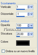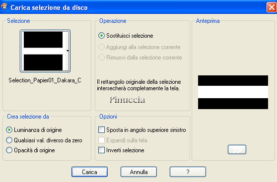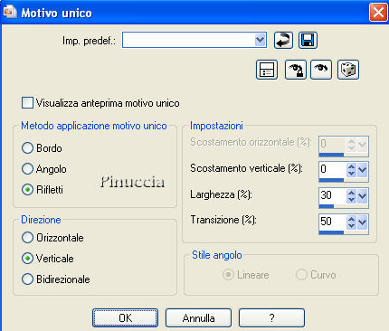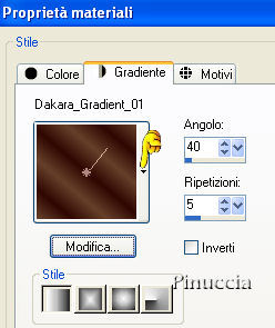 qui puoi trovare qualche risposta ai tuoi dubbi. Se l'argomento che ti interessa non è presente, ti prego di segnalarmelo. Questo tutorial può essere eseguito con tutte le versioni di PSP. Occorrente: Materiale qui Metti il Gradiente Dakara_Gradient_01 nella cartella gradienti di PSP. Metti la Selezione Selection_Papier01_Dakara_C nella cartella Selezioni di PSP. 1. Apri una nuova immagine trasparente 1024 per 500 pixels. 2. Passa il colore di primo piano a Gradiente. Apri il menu cliccando sulla freccia a fianco del box e cerca il gradiente "Dakara_Gradient_01", (o un gradiente di tua scelta): ![]() 3. Regola>Sfocatura>Sfocatura gaussiana, raggio 20. ![]() 4. Livelli>Nuovo livello raster. 5. Selezione>Seleziona tutto. 6. Apri il tube Cal_guis_tulipe_rouge, e vai a Modifica>Copia. 7. Torna al tuo lavoro e vai a Modifica>Incolla>Incolla nella selezione. 8. Immagine>Rifletti. 9. Abbassa l'opacità al 50%. Selezione>Nessuna selezione. Sposta leggermente l'immagine verso destra.10. Livelli>Nuovo livello raster. Selezione>Carica/Salva selezione>Carica selezione da disco. Cerca e carica la selezione Selection_Papier01_Dakara_C: ![]() 11. Imposta il colore di primo piano con #392210, e riempi la selezione con questo colore.12. Selezione>Nessuna selezione. 13. Nella paletta dei livelli cambia la modalità di miscelatura di questo livello in Sovrapponi. 14. Effetti>Effetti 3D>Sfalsa ombra: ![]() a questo punto, ho spostato la selezione in alto.Decidi tu se vuoi seguire il mio esempio. 15. Livelli>Duplica. 16. Immagine>Capovolgi. 17. Apri il tube "Thaïss...B&R", e vai a Modifica>Copia. Torna al tuo lavoro e vai a Modifica>Incolla>Incolla come nuovo livello. Sposta il tube a sinistra, vedi il mio esempio.18. Livelli>Unisci>Unisci visibile. 19. Effetti>Effetti di immagine>Motivo unico: ![]() Ripeti l'Effetto Motivo unico. il menu Modifica ha la funzione per ripetere l'ultima operazione effettuata: Modifica>Ripeti Motivo unico. ![]() 20. Livelli>Nuovo livello raster. Firma il tuo lavoro. 21. Livelli>Unisci>Unisci tutto. 22. Salva in formato jpg. ![]() Se hai problemi o dubbi, o trovi un link non funzionante, o anche soltanto per un saluto, scrivimi 27 Novembre 2007 |
