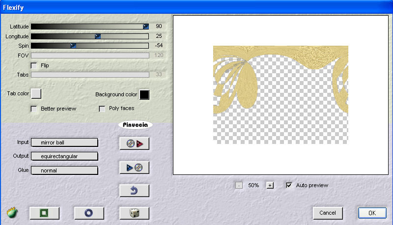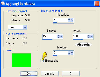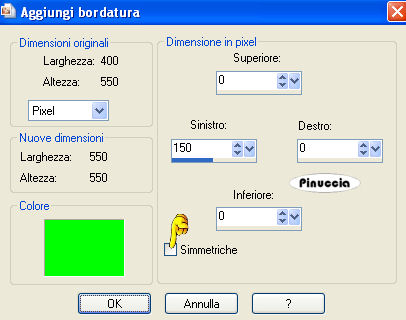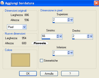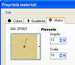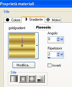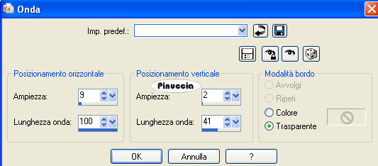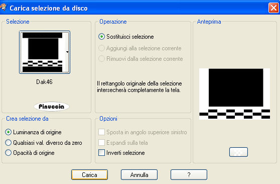 qui puoi trovare qualche risposta ai tuoi dubbi. Se l'argomento che ti interessa non è presente, ti prego di segnalarmelo. Occorrente: Un tube a scelta. Il resto del materiale qui Il tube che ho usato è di Guismo. Il resto del materiale è di Dakara. Rispetta il lavoro degli autori e non modificare i tubes. Metti le selezioni nella cartella Selezioni. Metti il gradiente nella cartella Gradienti. Metti il motivo nella cartella Motivi. Filtri: Flexify qui 1. Apri una nuova immagine trasparente 550 x 400 pixels. 2. Riempi l'immagine trasparente con il colore nero.3. Livelli>Nuovo livello raster. 4. Selezione>Carica/Salva selezione>Carica selezione da disco. Cerca e carica la selezione "Dak46". ![]() 5. Passa il colore di primo piano a Motivi e seleziona la trama oro, con i seguenti settaggi: ![]() Riempi la selezione con questo motivo.Selezione>Deseleziona. 6. Effetti>Plugins>Flaming Pear - Flexify: ![]() 7. Immagine>Ruota a destra. Se stai usando PSP 9: Immagine>ruota - 90 gradi in senso orario 8. Livelli>Unisci>Unisci tutto. 9. Immagine>Aggiungi bordatura, simmetriche non selezionato, con un colore qualsiasi, per esempio verde per evidenziare l'area del bordo: ![]() Seleziona questo bordo con la bacchetta magica ![]() Riempi la selezione con il motivo oro.10. Apri il tuo tube e vai a Modifica>Copia. Torna al tuo lavoro e vai a Modifica>Incolla come nuovo livello. Sposta il tube a sinistra.11. Livelli>Unisci>Unisci tutto. 12. Immagine>Aggiungi bordatura, 4 pixels, simmetriche, con il colore nero. 13. Immagine>Aggiungi bordatura, simmetriche non selezionato, con il colore verde per vedere meglio l'area selezionata. ![]() 14. Seleziona questo bordo con la bacchetta magica ![]() Passa il colore di primo piano a Gradiente e seleziona Goldgradient con i seguenti settaggi: ![]() 15. Effetti>Effetti di distorsione>Onda: ![]() 16. Riempi la selezione con il Motivo oro.Mantieni selezionato. 17. Effetti>Effetti 3D>Sfalsa ombra, con i seguenti settaggi, colore nero: ![]() Ripeti l'Effetto Sfalsa ombra, invertendo i valori verticale e orizzontale. ![]() 18. Selezione>Deseleziona. 19. Immagine>Aggiungi bordatura, 2 pixels, simmetriche, con il colore nero. 20. Immagine>Aggiungi bordatura, 2 pixels, simmetriche, con il colore verde. Seleziona questo bordo con la bacchetta magica ![]() e riempilo con la trama oro.21. Immagine>Aggiungi bordatura, 4 pixels, simmetriche, con il colore nero. 22. Immagine>Aggiungi bordatura, 4 pixels, simmetriche, con il colore verde. Seleziona questo bordo con la bacchetta magica ![]() e riempilo con la trama oro.23. Immagine>Aggiungi bordatura, 2 pixels, simmetriche, con il colore nero. 24. Immagine>Aggiungi bordatura, simmetriche non selezionato, con un colore simile alla trama oro (il mio #d5c07f). ![]() 25. Livelli>Nuovo livello raster. 26. Selezione>Carica/Salva selezione>Carica selezione da disco. Cerca e carica la selezione "Dak47": ![]() 27. Riempi la selezione con il motivo oro.Mantieni selezionato. 28. Effetti>Effetti 3D>Sfalsa ombra, con i seguenti settaggi, colore nero. ![]() Ripeti l'Effetto Sfalsa ombra, invertendo verticale e orizzontale. ![]() 29. Selezione>Deseleziona. Posiziona correttamente la selezione.per piccoli spostamenti puoi usare le frecce della tastiera. Sull'uso delle frecce abbinato allo strumento Spostamento vedi qui 30. Immagine>Aggiungi bordatura, 2 pixels, simmetriche, con il colore nero. 31. Immagine>Aggiungi bordatura, 2 pixels, simmetriche, con il colore usato al punto 24 (il mio #d5c07f). 32. Immagine>Aggiungi bordatura, 2 pixels, simmetriche, con il colore nero. 33. Immagine>Ridimensiona, a 600 pixels di larghezza. Regola>Messa a fuoco>Metti a fuoco. 34. Apri il tube Dècor e vai a Modifica>Copia. Torna al tuo lavoro e vai a Modifica>Incolla come nuovo livello. Spostalo a sinistra.35. Aggiungi il tuo nome e/o il tuo watermark su un nuovo livello. 36. Livelli>Unisci>Unisci tutto e salva in formato jpg. ![]() Se hai problemi o dubbi, o trovi un link non funzionante, o anche soltanto per un saluto, scrivimi 19 Agosto 2009 |