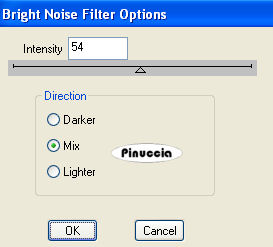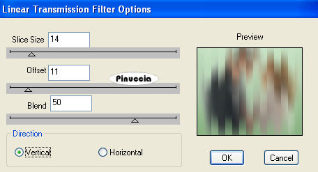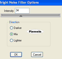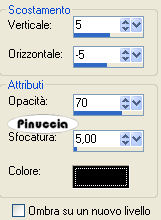 qui puoi trovare qualche risposta ai tuoi dubbi. Se l'argomento che ti interessa non è presente, ti prego di segnalarmelo. Occorrente: Un'immagine a scelta. Materiale qui Nello zip trovi: Tube "Eléments_Dakara_C_8"; tube di testo "Texte_Dakara_C_0"; Selezione "Dakara_C_22_" (da mettere nella cartella Selezioni. Font Affair. Per favore, non modificate il nome del materiale. Filtro: Dsb Flux qui 1. Apri l'immagine che hai scelto. Immagine>Ridimensiona, a 300 pixels di larghezza. L'altezza non deve essere superiore a 380 pixels. Quindi, se dopo aver ridimensionato la larghezza, vedi che l'altezza supera questa misura, porta l'altezza a 380 pixels. Rinomina in "Immagine 1". Per rinominare un'immagine: File>Salva con nome.... Copia l'immagine: Modifica>Copia, e minimizzala, per il momento, perchè ti servirà ancora. 2. Apri una nuova immagine trasparente 600 x 500 pixels. 3. Selezione>Seleziona tutto. 4. Modifica>Incolla>Incolla nella selezione. 5. Selezione>Nessuna selezione. 6. Regola>Sfocatura>Sfocatura gaussiana, raggio 20. ![]() 7. Effetti>Plugins>Dsb Flux - Linear Transmission: ![]() 8. Ripeti una seconda volta il filtro Dsb Flux. 9. Livelli>nuovo livello raster. Selezione>Carica/Salva selezione>Carica selezione da disco: cerca e carica la selezione Dakara_C_22. ![]() Riempi la selezione con un colore scelto dal tuo tube.10. Selezione>Nessuna selezione. 11. La selezione dovrebbe già trovarsi al centro (vedi il mio esempio). Se non è così, sistemala al centro dell'immagine.Effetti>Effetti 3D>Sfalsa ombra, con i seguenti settaggi, colore nero: ![]() 12. Immagine>Aggiungi bordatura, 4 pixels, simmetriche, con il colore bianco (#ffffff). Immagine>Aggiungi bordatura, 4 pixels, simmetriche, con il colore che hai scelto al punto 9. Immagine>Aggiungi bordatura, 4 pixels, simmetriche, con il colore bianco. Immagine>Aggiungi bordatura, 2 pixels, simmetriche, con il colore che hai scelto al punto 9. Immagine>Aggiungi bordatura, simmetriche non selezionato, con il colore bianco: ![]() Immagine>Aggiungi bordatura, 5 pixels, simmetriche, con il colore che hai scelto al punto 9. Immagine>Aggiungi bordatura, 4 pixels, simmetriche, con il colore bianco. Immagine>Aggiungi bordatura, 3 pixels, simmetriche, con il colore che hai scelto al punto 9. Immagine>Aggiungi bordatura, 4 pixels, simmetriche, con il colore nero (#000000). 13. Attiva la tua "Immagine 1" (che hanno messo da parte al punto 1). Immagine>Aggiungi bordatura, 2 pixels, simmetriche, con il colore nero. Immagine>Aggiungi bordatura, 2 pixels, simmetriche, con il colore che hai scelto al punto 9. Immagine>Aggiungi bordatura, 2 pixels, simmetriche, con il colore nero. 14. Modifica>Copia. Torna al tuo lavoro e vai a Modifica>Incolla>Incolla come nuovo livello. Posiziona l'immagine a sinistra.15. Apri il tube "Eléments_Dakara_C_8", e vai a Modifica>Copia. Torna al tuo lavoro e vai a Modifica>Incolla>Incolla come nuovo livello. Sposta il tube come nell'esempio.![]() 16. Livelli>Duplica. 17. Posizionati sul livello sotto (l'originale). Effetti>Plugins>Dbs Flux - Bright Noise, imposta il settaggio a 54: ![]() Rinomina il livello "01". 18. Attiva il livello superiore. ![]() Effetti>Plugins>Dsb Flux - Bright Noise, imposta il settaggio a 34: ![]() Rinomina il livello "02. 19. Apri il tube di testo Texte_Dakara_C_0 e vai a Modifica>copia. Torna al tuo lavoro e vai a Modifica>Incolla>Incolla come nuovo livello. Spostalo a destra, vedi il mio esempio.20. Livelli>Nuovo livello raster. Firma il tuo lavoro e abbassa l'opacità del livello a 40. 21. Chiudi il livello "01". ![]() Modifica>Copia Unione. Apri Animation Shop. Clicca con il tasto destro del mouse sullo spazio vuoto e Incolla come nuova animazione. ![]() 22. Ritorna in Psp. Apri il livello "01" e chiudi il livello "02". ![]() Modifica>Copia Unione. Ritorna in Animation Shop e vai a Modifica>Incolla>Incolla dopo il fotogramma corrente. 23. Controlla il tuo risultato cliccando su Visualizza ![]() Se vuoi cambiare la velocità dell'animazione (la mia è impostata a 10), prima seleziona i due fotogrammi con Modifica>Seleziona tutto, e poi vai a Animazione>Proprietà fotogramma, e applica il settaggio che preferisci. Ricorda che più è alto il valore inserito, meno veloce sarà l'animazione.