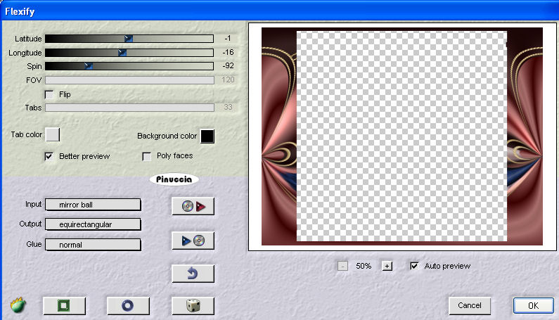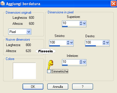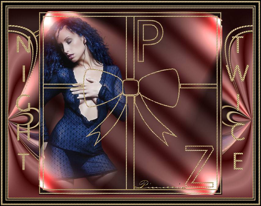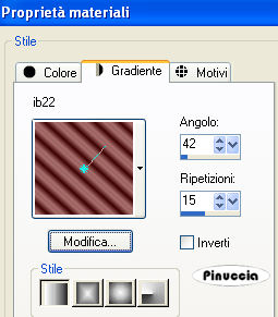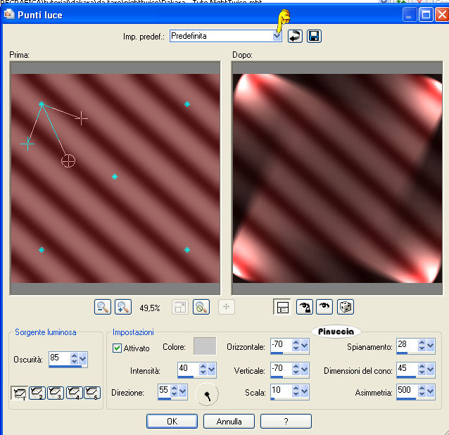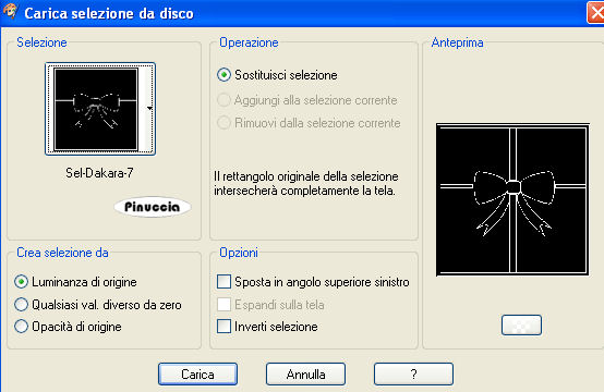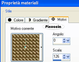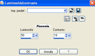 qui puoi trovare qualche risposta ai tuoi dubbi. Se l'argomento che ti interessa non è presente, ti prego di segnalarmelo. Occorrente: Un tube a scelta. Il resto del materiale qui Metti la selezione nella cartella Selezioni. Metti il gradiente nella cartella Gradienti. Metti il motivo oro nella cartella Motivi. Apri il font e minimizzalo. Lo troverai nella lista dei font disponibili, quando ti servirà. Filtri: Flaming Pear - Flexify qui 1. Apri una nuova immagine trasparente 600 x 600 pixels. 2. Passa il colore di sfondo a Gradiente e seleziona il gradiente "ib22", con i seguenti settaggi: ![]() Regola>Sfocatura>Sfocatura gaussiana, raggio 10 ![]() 3. Effetti>Effetti di illuminazione>Punti luce, apri il menu delle impostazioni e seleziona predefinito, con i seguenti settaggi: ![]() 4. Apri il tuo tube e vai a Modifica>copia. Torna al tuo lavoro e vai a Modifica>Incolla come nuovo livello. Spostalo a sinistra.5. Livelli>Nuovo livello raster. Selezione>Carica/Salva selezione>Carica selezione da disco. Cerca e carica la selezione Sel-Dakara-7 ![]() Passa il colore di primo piano a Motivi e seleziona il motivo oro, con i seguenti settaggi: ![]() Riempi la selezione con questo motivo.7. Livelli>Luminosità e contrasto>Luminosità e contrasto: ![]() Selezione>Deseleziona. Controlla che il tube sia ben posizionato. 8. Livelli>Unisci>Unisci tutto. 9. Immagine>Aggiungi bordatura, con il colore bianco, simmetriche non selezionato, con i seguenti settaggi. ![]() 10. Seleziona questo bordo con la bacchetta magica ![]() ![]() e riempilo con il gradiente.Mantieni selezionato. 11. Effetti>Plugins>Flaming Pear - Flexify: ![]() Selezione>Deseleziona. 13. Immagine>Aggiungi bordatura, 3 pixels, simmetriche, con il colore bianco. Immagine>Aggiungi bordatura, 3 pixels, simmetriche, con il colore nero. Immagine>Aggiungi bordatura, 3 pixels, simmetriche, con il colore bianco. Immagine>Aggiungi bordatura, 10 pixels, simmetriche, con il colore nero. Immagine>Aggiungi bordatura, 5 pixels, simmetriche, con il colore bianco. Immagine>Aggiungi bordatura, 3 pixels, simmetriche, con il colore nero. 14. Seleziona tutti i bordi bianchi con la bacchetta magica ![]() e riempili con il motivo oro "point or 2".Mantieni ancora selezionato. 15. Regola>Luminosità e contrasto>Luminosità e contrasto, con i settaggi precedenti. Selezione>Deseleziona. 16. Attiva lo strumento Testo ![]() seleziona il font SaxonylSerial, dimensione 150, pennellata 3, crea come vettore, chiuso il colore di sfondo e colore di primo piano impostato con il motivo oro. 17. Scrivi la prima lettera del tuo nome e posizionala a destra, vedi l'esempio finale. Livelli>Converti in livello raster. 18. Regola>Luminosità e contrasto>Luminosità e contrasto, con i settaggi precedenti. Selezione>Deseleziona. 19. Scrivi la seconda iniziale e posizionala a destra. Livelli>Converti in livello Raster. 20. Regola>Luminosità e contrasto>Luminosità e contrasto, con i settaggi precedenti. Selezione>Deseleziona. 22. Immagine>Ridimensiona, a 650 pixels di larghezza. 23. Livelli>Nuovo livello raster, e firma il tuo lavoro. 24. Livelli>Unisci>Unisci tutto e salva in formato jpg. ![]() Se hai problemi o dubbi, o trovi un link non funzionante, o anche soltanto per un saluto, scrivimi 22 Giugno 2008 |