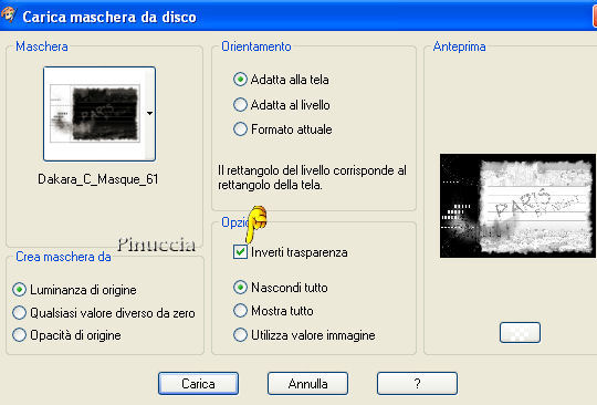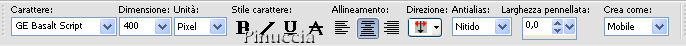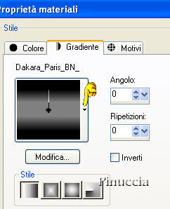 qui puoi trovare qualche risposta ai tuoi dubbi. Se l'argomento che ti interessa non è presente, ti prego di segnalarmelo. Questo tutorial può essere eseguito con tutte le versioni di PSP. Occorrente: Materiale qui Metti il Gradiente Dakara_Gradient_01 nella cartella gradienti di PSP. Metti la Maschera nella cartella Maschere di PSP. Apri il font GE Basalt Script Normal, e minimizzalo nella tua area di lavoro. Lo troverai nella lista dei font disponibili, quando ti servirà. (per favore non modificare il nome del materiale). Filtri: Adjust - Variation qui DSB Flux qui Ti servirà anche Animation Shop qui 1. Apri una nuova immagine trasparente 750 x 500 pixels. Imposta il colore di primo piano con il bianco (#ffffff), e riempi l'immagine trasparente con il colore di primo piano.2. Livelli>Nuovo livello raster. Imposta il colore di primo piano su Gradienti, apri il menu cliccando sulla freccia a fianco del box, cerca e seleziona il gradiente Dakara_Paris_BN: ![]() Riempi il nuovo livello con il gradiente.3. Livelli>Carica/Salva maschera>Carica maschera da disco. Cerca e carica la maschera "Dakara_C_Masque_61", inverti trasparenza selezionato. ![]() Livelli>Elimina, e rispondi sì alla domanda Unire la maschera nel livello corrente?: ![]() Livelli>Unisci>Unisci gruppo. 4. Effetti>Plugins>Adjust - Variation: clicca su un colore a tua scelta (ma che non sia troppo scuro). Livelli>Unisci>Unisci giù. 5. Livelli>duplica. 6. Immagine>Ridimensiona, al 20%, tutti i livelli non selezionato, ricampionamento ottimale: ![]() 7. Regola>Messa a fuoco>Metti a fuoco. 8. Sposta l'immagine in alto a sinistra, vedi l'esempio.![]() 9. Apri il tube della donna, puoi scegliere tra i tubes forniti: Karine_Ladymist4 oppure Thaïss...fmm-rss, Immagine>Ridimensiona, a 500 pixels di altezza. 10. Modifica>Copia. Torna al tuo lavoro e vai a Modifica>Incolla>Incolla come nuovo livello. 11. Sposta l'immagine a destra,facendo attenzione che non superi il bordo. Nella paletta dei livelli cambia la modalità di miscelatura di questo livello in Sovrapponi. ![]() 12. Apri il tube Jewel&flowers3...Thaïss, e vai a Modifica>Copia. Torna al tuo lavoro e vai a Modifica>Incolla>Incolla come nuovo livello. Sposta il tube a sinistra,facendo sempre attenzione che non superi il bordo (vedi l'esempio). Cambia la modalità di miscelatura di questo livello in Sovrapponi. ![]() 13. Livelli>Nuovo livello raster. 14. Attiva lo strumento Testo ,seleziona il font GE Basalt, con i seguenti settaggi: ![]() se stai usando PSP X, dovrai aumentare la dimensione del font, perchè nelle due versioni i pixels non corrispondono. Su queste differenze, vedi qui Ecco i settaggi che ho usato con PSP X: ![]() Imposta come colore di sfondo #f7ad2d, o un colore che si accordi allo sfondo della tua immagine, ma che sia chiaro. (esempio: un verde su sfondo blue, un arancio su sfondo nero, un giallo su sfondo arancio). Scrivi la prima lettera del tuo nome e posizionala. ![]() Selezione>Nessuna selezione. 15. Rinomina questo livello "01". 16. Livelli>Duplica. Rinomina questo livello "02". 17. Attiva il livello "01". Effetti>Plugins>DSB Flux - Bright Noise: ![]() Nella paletta dei livelli cambia la modalità di miscelatura di questo livello in Sovrapponi. 18. Attiva il livello "02" Effetti>Plugins>DSB Flux - Bright Noise, e cambia l'intensità a 50: ![]() Nella paletta dei livelli cambia la modalità di miscelatura di questo livello in Sovrapponi. 19. Livelli>Nuovo livello raster. Firma il tuo lavoro. 20. Per creare l'animazione: 21. Chiudi il livello "01". ![]() Modifica>Copia Unione. Apri Animation Shop. Clicca con il tasto destro del mouse sullo spazio vuoto e Incolla come nuova animazione. ![]() 22. Torna in PSP. Chiudi il livello "02" e apri il livello "01". ![]() Modifica>Copia Unione. Torna in Animation shop e vai a Modifica>Incolla>Incolla dopo il fotogramma corrente. Ed ecco la tua animazione composta da 2 fotogrammi. Controlla il risultato cliccando su Visualizza ![]() La velocità del mio esempio è di 10. Se vuoi cambiare la velocità, seleziona i fotogrammi: Modifica>Seleziona tutto. Animazione>Proprietà fotogramma, e imposta la velocità preferita: aumentando il settaggio la velocità diminuisce, diminuendolo il settaggio la velocità aumenta. Quando sei soddisfatto, salva in formato gif. ![]() ![]() Se hai problemi o dubbi, o trovi un link non funzionante, o anche soltanto per un saluto, scrivimi 27 Novembre 2007 |
