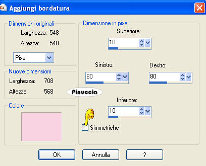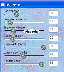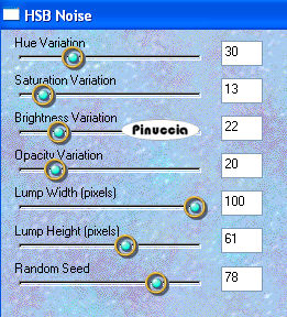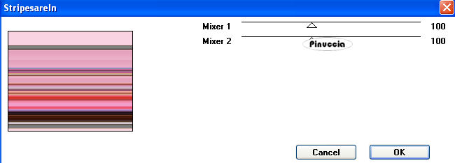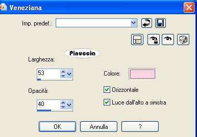 qui puoi trovare qualche risposta ai tuoi dubbi. Se l'argomento che ti interessa non è presente, ti prego di segnalarmelo. Occorrente: Un tube a scelta. Il resto del materiale qui Metti il pennello nella cartella Pennelli. Metti il motivo oro nella cartella Motivi. Filtri: Horizonaus Mixed Bag (nello zip). Eye Candy 3.1 qui Ti servirà anche Animation Shop qui 1. Apri una nuova immagine trasparente 500 x 500 pixels. 2. Apri il tuo tube e vai a Modifica>Copia. Torna al tuo lavoro e vai a Modifica>Incolla come nuovo livello. 3. Livelli>Duplica. 4. Effetti>Effetti di distorsione>Mulinello - 720 gradi. ![]() Livelli>Disponi>Sposta giù. 5. Livelli>Nuovo livello raster. 6. Scegli un colore non troppo chiaro dal tuo tube e impostalo come colore di primo piano. Riempi il livello con questo colore.7. Effetti>Effetti di trama>Veneziana: ![]() 8. Livelli>Unisci>Unisci tutto. 9. Immagine>Aggiungi bordatura, 2 pixels, simmetriche, con il colore nero. Immagine>Aggiungi bordatura, 2 pixels, simmetriche, con il colore bianco. 10. Ripeti il punto 9 cinque volte, (dovrai avere 6 bordi neri e 6 bordi bianchi). 11. Seleziona il primo e l'ultimo bordo bianco con la bacchetta magica ![]() ![]() Passa il colore di primo piano a Motivi e seleziona il motivo "Point or 2", o un motivo a tua scelta. Riempi i bordi con questo motivo.Selezione>Deseleziona. 12. Immagine>Aggiungi bordatura, simmetriche non selezionato, con un colore molto chiaro del tuo tube. ![]() 13. Seleziona questo bordo con la bacchetta magica ![]() 14. Effetti>Plugins>Horizonaus Mixed Bag - StripesareIN: ![]() 15. Selezione>Deseleziona. 16. Ripeti i punti 9, 10 e 11. 17. Livelli>Nuovo livello raster. 18. Attiva lo strumento Pennello , dimensione 417,cerca e seleziona il pennello "Sweet-RETRO STAMP 1" e applicalo a sinistra (vedi il mio esempio), con un colore scelto dal tuo tube. 19. Livelli>Nuovo livello raster, e aggiungi la tua firma. 20. Livelli>Unisci>Unisci tutto. Ridimensiona, se vuoi, il tuo lavoro. 21. Livelli>Duplica. Attiva il livello inferiore. 22. Effetti>Plugins>Eye Candy 3.1 - HSB Noise, con i seguenti settaggi: ![]() 23. Attiva il livello superiore. Effetti>Plugins>Eye Candy 3.1 - HSB Noise, con i seguenti settaggi: ![]() 24. Salva in formato psp. 25. Apri Animation Shop e apri l'immagine che hai appena salvato. Controlla il risultato cliccando su Visualizza ,cambia, se vuoi, la velocità e salva in formato gif. per il mio esempio ho impostato la velocità del primo fotogramma a 12 e ho lasciato quella del secondo fotogramma a 10. Esempio senza animazione. ![]() ![]() Se hai problemi o dubbi, o trovi un link non funzionante, o anche soltanto per un saluto, scrivimi 22 Giugno 2008 |