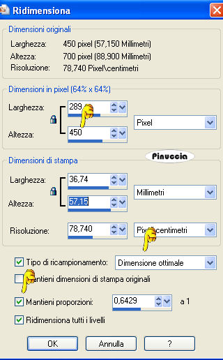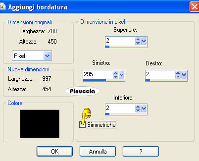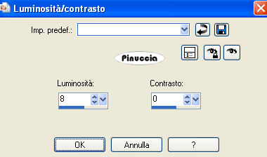 qui puoi trovare qualche risposta ai tuoi dubbi. Se l'argomento che ti interessa non è presente, ti prego di segnalarmelo. Occorrente: Un tube a scelta. Il resto del materiale qui Metti la selezione nella cartella Selezioni. Filtri: VM Toolbox qui Ti servirà anche Animation Shop qui 1. Apri una nuova immagine trasparente 700 x 450 pixels. 2. Selezione>Seleziona tutto. (questo dipende dal tube che hai scelto. Se il tube è sottile, non occorre). 3. Apri il tuo tube e vai a Modifica>Copia. Torna al tuo lavoro e vai a Modifica>Incolla nella selezione. (secondo il tube scelto. Se il tube è sottile fai: Modifica>Incolla come nuovo livello). Selezione>Deseleziona. 4. Livelli>Duplica e ripeti (avrai così un totale di 3 livelli). 5. Attiva il livello più basso. 6. Effetti>Plugins>VM Toolbox - Zoom Blur, con i settaggi standard, 2 volte (se il tube è sottile, ripeti una terza volta). ![]() 7. Attiva il livello di centro. Effetti>Effetti di distorsione>Mulinello, 2 volte (se il tube è sottile ripeti una terza volta: decidi a seconda del risultato): ![]() 8. Livelli>Nuovo livello raster. Livelli>Disponi>Porta sotto. Scegli un colore chiaro abbinato ai colori del tuo tube e impostalo come colore di primo piano. Riempi il livello con questo colore.9. Livelli>Unisci>Unisci tutto. 10. Duplica l'immagine usando sulla tastiera la combinazione di tasti Shift(maiuscolo)+D, metti da parte la copia. 11. Continua sull'originale: Immagine>Ruota a destra. se stai usando PSP 9: Immagine>Ruota per gradi - 90 gradi in senso orario. 12. Selezione>Carica/Salva selezione>Carica selezione da disco. Cerca e carica la Selezione SelDakara-Songe-0 ![]() 13. Regola>Sfocatura>Sfocatura gaussiana - raggio 20. ![]() 14. Effetti>Effetti 3D>Sfalsa ombra, con i seguenti settaggi, colore nero: ![]() 15. Ripeti l'Effetto Sfalsa ombra, cambiando verticale e orizzontale con -5. 16. Selezione>Deseleziona. 17. Immagine>Ridimensiona, a 450 pixels di altezza, tutti i livelli selezionato, ricampionamento ottimale: ![]() 18. Modifica>Copia. 19. Attiva la seconda copia del tuo lavoro. 20. Immagine>Aggiungi bordatura, simmetriche non selezionato, con il colore nero. ![]() 21. Modifica>Incolla come nuovo livello. Posiziona l'immagine a sinistra, al centro del bordo nero.![]() 22. Livelli>Unisci>Unisci tutto. 23. Immagine>Ridimensiona, a 700 pixels di larghezza (ricampionamento intelligente). 24. Regola>Messa a fuoco>Metti a fuoco. 25. Immagine>Aggiungi bordatura, 3 pixels, simmetriche, con il colore che hai usato al punto 8. Immagine>Aggiungi bordatura, 2 pixels, simmetriche, con il colore nero. Immagine>Aggiungi bordatura, 3 pixels, simmetriche, con il colore usato al punto 8. Immagine>Aggiungi bordatura, 2 pixels, simmetriche, con il colore nero. 26. Apri il tube Element_Dakara_Songe e vai a Modifica>Copia. Torna al tuo lavoro e vai a Modifica>Incolla come nuovo livello. Posiziona l'ornamento tra le due immagini.27. Apri il tube Texte_Dakara_Songe e vai a Modifica>Copia. Torna al tuo lavoro e vai a Modifica>Incolla ocm enuovo livello. Posiziona il testo in basso, vedi il mio esempio.28. Livelli>Nuovo livello raster e firma il tuo lavoro. 29. Livelli>Unisci>Unisci tutto. 30. Livelli>Duplica (shift+D). 31. Sulla prima immagine: Regola>Luminosità e contrasto>Luminosità e contrasto: ![]() 32. Immagine>Aggiungi bordatura, 20 pixels, simmetriche, con il colore del punto 8. Immagine>Aggiungi bordatura, 2 pixels, simmetriche, con il colore nero. Modifica>Copia. Apri Animation Shop. Clicca con il tasto destro del mouse sullo spazio vuoto e Incolla come nuova animazione. Torna in PSP e attiva la seconda copia. Ripeti il passo 32. Modifica>Copia. Torna in Animation Shop e vai a Modifica>Incolla>Incolla dopo il fotogramma corrente. 33. Controlla il risultato cliccando su Visualizza e salva in formato gif.Esempio senza l'animazione. ![]() ![]() Se hai problemi o dubbi, o trovi un link non funzionante, o anche soltanto per un saluto, scrivimi 22 Giugno 2008 |