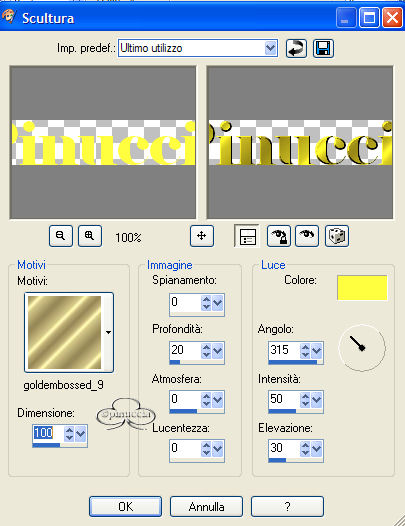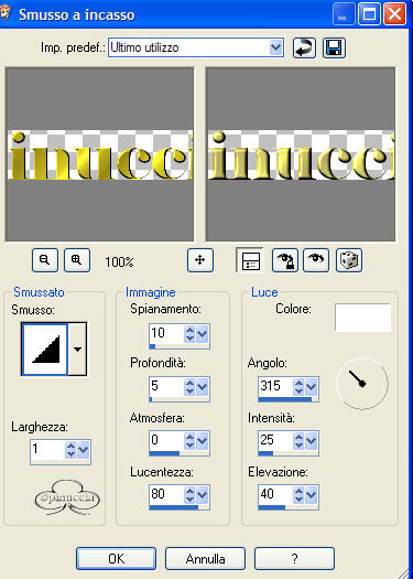 Con le lettere ancora selezionate: Effetti>Effetti 3D>Smusso a incasso, con i seguenti settaggi: