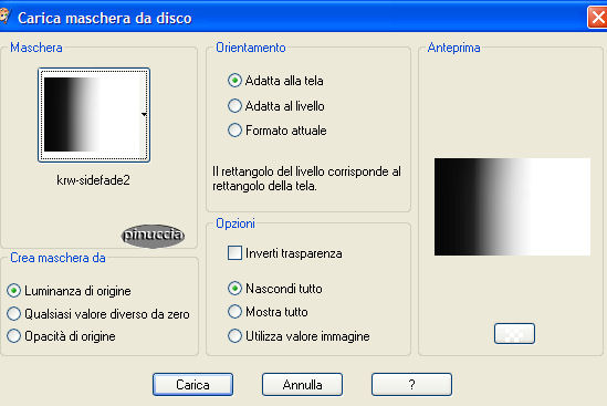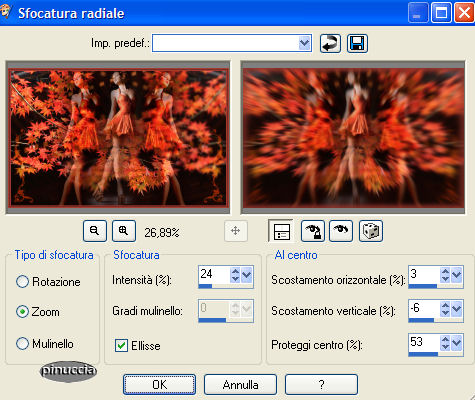 qui puoi trovare qualche risposta ai tuoi dubbi. Se l'argomento che ti interessa non è presente, ti prego di segnalarmelo. Questo tutorial è stato scritto con PSP 9. Occorrente: Materiale qui Filtro Eye Candy 3 qui Importa il pennello e minimizza il font sulla tua area di lavoro. 1. Apri una nuova immagine trasparente 800 x 500 pixels. 2. Livelli>Nuovo livello raster. 3. Selezione>Seleziona tutto. 4. Apri krw-autumnleavesMF e vai a Modifica>Copia. 5. Torna al tuo lavoro e vai a Modifica>Incolla>Incolla nella selezione. 6. Selezione>Nessuna selezione. 7. Livelli>Duplica. 8. Immagine>Rifletti. 9. Regola>Sfocatura>Sfocatura gaussiana, raggio 3. ![]() 10. Livelli>Carica/salva maschera>Carica maschera da disco. cerca e carica la maschera krw-sidefade. ![]() 11. Livelli>Unisci>Unisci gruppo. 12. Cambia la modalità di miscelatura in Schiarisci. 13. Livelli>Unisci>Unisci tutto (appiattisci). 14. Apri il mist krw-female59. 15. Shift+D per duplicarlo. 16. Immagine>Ridimensiona, a 500 pixels di altezza, seleziona: mantieni proporzioni e tutti i livelli: ![]() 17. Modifica>Copia. Torna al tuo lavoro e vai a Modifica>Incolla>incolla come nuovo livello. 18. Attiva il mist originale e vai a Modifica>Copia. 19. Torna al tuo lavoro e vai a Modifica>Incolla>Incolla come nuovo livello. 20. Spostalo a sinistra del file più piccolo,portando la testa contro il bordo superiore. ![]() 21. Cambia la modalità di miscelatura di questo livello in Luce netta e abbassa l'opacità al 70%. 22. Livelli>Duplica. 23. Immagine>Rifletti. 24. Sistema il tube sulla destra della piccola immagine. 25. Imposta il colore di primo piano con #d0916b. 26. Livelli>Nuovo livello raster. 27. Attiva lo strumento Pennello ![]() Cerca e seleziona il pennello sr_flowers_009. 28. Applicalo nell'angolo in basso a sinistra. 29. Cambia la modalità di miscelatura di questo livello in Luce netta. 30. Livelli>Duplica. 31. Immagine>Rifletti. 32. Livelli>Unisci>Unisci tutto (appiattisci). 33. Immagine>Aggiungi bordatura, 5 pixels, simmetriche, con il colore #a53b30. 34. Immagine>Aggiungi bordatura, 1 pixel, simmetriche, con il colore nero. 35. Immagine>Aggiungi bordatura, 5 pixels, simmetriche, con il colore #a53b30. 36. Livelli>Duplica. 37. Immagine>Ridimensiona, dell'80%, tutti i livelli non selezionato. ![]() 38. Effetti>Plugins>Eyecandy 3 - Glow: ![]() 39. Attiva il livello inferiore. 40. Regola>Sfocatura>Sfocatura radiale: ![]() 41. Attiva il livello superiore. 42. Attiva lo strumento Testo , crea come vettore,font Vivaldi, dimensione 48, pennellata 0, allineamento al centro, colore di sfondo nero: 43. Scrivi "Autumn Dance". 44. Posiziona il testo in fondo all'immagine. 45. Livelli>Converti in livello raster. 46. Effetti>Plugins>Eye Candy 2 - Glow, con gli stessi settaggi del passo 38. 47. Livelli>Duplica. 48. Livelli>Disponi>Sposta giù. 49. Effetti>Plugins>Eye Candy 3 / Motion trail, con i seguenti settaggi: ![]() 50. Livelli>Unisci>Unisci tutto (appiattisci). 51. Immagine>Aggiungi bordatura, 5 pixels, simmetriche, con il colore nero. 52. Aggiungi la tua firma, se vuoi. 53. Livelli>Unisci>Unisci tutto (appiattisci) e salva in formato jpg. ![]() Se hai problemi o dubbi, o trovi un link non funzionante, o anche soltanto per un saluto, scrivimi. Novembre 2006 |