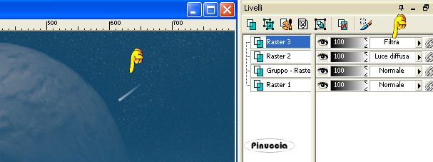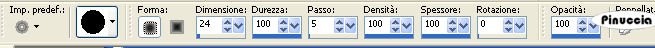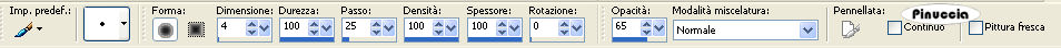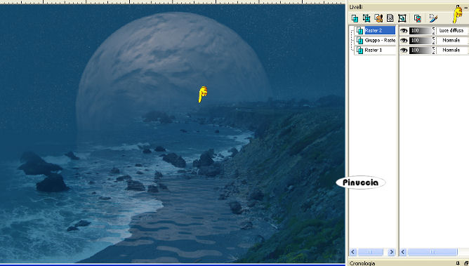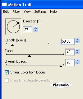 qui puoi trovare qualche risposta ai tuoi dubbi. Se l'argomento che ti interessa non è presente, ti prego di segnalarmelo. Questo tutorial è stato creato con PSP 9. Occorrente: Filtri: Eye Candy 4000 qui Simple qui Materiale qui 1. Imposta il colore di primo piano con #9696a2 e il colore di sfondo con #12476a. 2. Apri una nuova immagine trasparente 800 x 600 pixels. 3. Riempi l'immagine con il colore di sfondo.4. Livelli>Nuovo livello raster. 5. Riempi il nuovo livello con il colore di primo piano.6. Livelli>Carica/Salva maschera>Carica maschera da disco cerca e carica la maschera Chat-Mask: ![]() 7. Livelli>Unisci>Unisci gruppo. 8. Apri il mist krw-calicoast1 e vai a Modifica>Copia. 9. Torna al tuo lavoro e vai a Modifica>Incolla>Incolla come nuovo livello. 10. Nella paletta dei livelli cambia la modalità di miscelatura in Luce diffusa e cancella l'area del mist che copre la luna.![]() (suggerimento del traduttore: se nel corso del lavoro ti accorgi che non hai cancellato abbastanza, puoi sempre rimediare. Ricordati, prima di usare la Gomma, di posizionarti sul livello del mist) 11. Livelli>Nuovo livello raster. 12. Attiva lo strumento pennello , così impostato:![]() 13. Con il tasto sinistro applica un solo punto vicino all'area superiore destra della luna. ![]() 14. Effetti>Plugins>EyeCandy 4000>Motion Trail: ![]() 15. Nella paletta dei livelli cambia la modalità di miscelatura in Filtra. ![]() 16. Seleziona lo strumento Pennello attenua , con i seguenti settaggi:![]() 17. Clicca una volta sul punto finale della cometa per attenuare i bordi. 18. Livelli>Duplica il livello due volte e posizionalo come preferisci o seguendo il mio esempio. 19. Livelli>Unisci>Unisci tutto (appiattisci) (suggerimento del traduttore: puoi saltare questo passo. In tal modo avrai ancora la possibilità di seguire il consiglio del passo 10: RICORDA di posizionarti sul livello del mist prima di usare la gomma) 20. Apri il mist krw-female18 evai a Modifica>Copia. 21. Torna al tuo lavoro e vai a Modifica>Incolla>Incolla come nuovo livello. 22. Nella paletta dei livelli cambia la modalità di miscelatura in Luce diffusa. 23. Seleziona il livello del mist coast e cancella le rocce sotto l'occhio della donna, il naso e la bocca.24. Posizionati sul livello superiore. Apri il mist krw-male4 e vai a Modifica>Copia. 25. Torna al tuo lavoro e vai a Modifica>Incolla>Incolla come nuovo livello. 26. Posizionalo contro il bordo sinistroe abbassa l'opacità all'80%. 27. Livelli>Unisci>Unisci tutto (appiattisci). 28. Livelli>Duplica. 29. Immagine>Ridimensiona, del 65%, tutti i livelli non selezionato: ![]() 30. Seleziona l'area intorno al livello ridimensiona con la bacchetta magica ![]() 31. Livelli>Nuovo livello raster. 32. Riempi il nuovo livello con un Motivo argento.33. Selezione>Modifica>Contrai, 2 pixels, e premi sulla tastiera il tasto CANC. 34. Livelli>Nuovo livello raster. 35. Riempi il nuovo livello con il colore di sfondo.36. Selezione>Modifica>Contrai, 2 pixels, e premi sulla tastiera il tasto CANC. 37. Selezione>Nessuna selezione. 38. Effetti>Effetti 3D>Sfalsa ombra, con i seguenti settaggi, colore nero: ![]() 39. Aggiungi il testo e la firma. 40. Livelli>Unisci>Unisci tutto (appiattisci). 41. Immagine>Aggiungi bordatura, 2 pixels, simmetriche, con il colore nero. 42. Immagine>Aggiungi bordatura, 2 pixels, simmetriche, con il colore di sfondo. 43. Immagine>Aggiungi bordatura, 2 pixels, simmetriche, con il colore . 44. Salva in formato jpg.