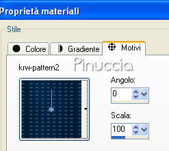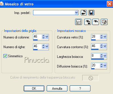 qui puoi trovare qualche risposta ai tuoi dubbi. Se l'argomento che ti interessa non è presente, ti prego di segnalarmelo. Questo tutorial è stato scritto con PSP 9, ma può essere eseguito anche con le altre versioni di PSP. Occorrente: Materiale qui Apri il font e minimizzalo nella tua area di lavoro. Lo troverai nella lista dei font disponibili quando ti servirà. 1. Imposta il colore di primo piano con #99a8d3, e il colore di sfondo con 4b6e8e. 2. Apri una nuova immagine trasparente 700 x 500 pixels. 3. Selezione>Seleziona tutto. 4. Apri bluemondayFemale graphic, e vai a Modifica>Copia. 5. Torna alla tua immagine trasparente, e vai a Modifica>Incolla>Incolla nella selezione. 6. Selezione>Nessuna selezione. 7. Regola>Sfocatura>Sfocatura gaussiana, raggio 10. ![]() 8. Effetti>Effetti di trama>Mosaico di vetro: ![]() 9. Apri il tube krw-female290, e vai a Modifica>Copia. 10. Torna al tuo lavoro e vai a Modifica>Incolla>Incolla come nuovo livello. 11. Immagine>Rifletti. 12. Sposta il tube a sinistra, vedi il mio esempio.13. Attiva lo strumento bacchetta magica ,e clicca a destra sull'area esterna del tube della donna. ![]() 14. Selezione>Inverti. 15. Livelli>Nuovo livello raster. 16. Riempi la selezione con il colore di sfondo.ricorda che, per riempire con il colore di sfondo, devi cliccare con il tasto destro del mouse. 17. Selezione>Nessuna selezione. 18. Livelli>Disponi>Sposta giù. 19. Attiva lo strumento Gomma , con i seguenti settaggi:![]() 20. Sfuma i bordi del riempimento per miscelarli con lo sfondo. ![]() 21. Nella paletta dei livelli attiva il livello Raster 2 (il tube della donna). 22. Cambia la modalità di miscelatura in Luminanza (esistente). Questo dovrebbe essere il risultato: ![]() 23. Apri il tube krw-male46, e vai a Modifica>Copia. 24. Torna al tuo lavoro e vai a Modifica>Incolla>Incolla come nuovo livello. 25. Sposta il tube nell'angolo in basso a destra.26. Con lo strumento Gomma , impostato come al passo 19,cancella il bordo sinistro del tube dell'uomo per ammorbidire e miscelare il contorno. ![]() 27. Abbassa l'opacità di questo livello al 70%. 28. Livelli>Nuovo livello raster. 29. Riempi con il colore di sfondo.30. Cambia la modalità di miscelatura di questo livello in Colore (esistente). 31. Livelli>Unisci>Unisci tutto (appiattisci). 32. Imposta il colore di primo piano su Motivi. Cerca e seleziona il motivo krw-pattern2, angolo 0, scala 100. ![]() 33. Immagine>Aggiungi bordatura, 25 pixels, simmetriche, con il colore bianco. 34. Seleziona il bordo con la bacchetta magica ![]() 35. Riempi la selezione con il motivo.36. Effetti>Effetti 3D>Ritaglio: ![]() 37. Selezione>Nessuna selezione. 38. Immagine>Aggiungi bordatura, 5 pixels, simmetriche, con il colore di sfondo. 39. Seleziona il bordo con la bacchetta magica ![]() 40. Effetti>Effetti di trama>Trama, cerca e seleziona la trama FD_Fabric2: ![]() 41. Selezione>Nessuna selezione. 42. Attiva lo strumento Testo , crea come vettore, font Olympiques, dimensione 48, pennellata 0:![]() 43. Scrivi Blue Monday e posiziona il testo. 44. Livelli>Converti in livello raster. Cambia la modalità di miscelatura in Moltiplica. 45. Effetti>Effetti 3D>Sfalsa ombra, con i seguenti settaggi, colore nero. ![]() 46. Aggiungi il tuo nome e/o il tuo watermark. 47. Livelli>Unisci>Unisci tutto (appiattisci), e salva in formato jpg. ![]() Se hai problemi o dubbi, o trovi un link non funzionante, o anche soltanto per un saluto, scrivimi. 14 Novembre 2007 |