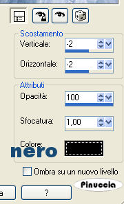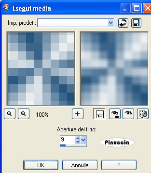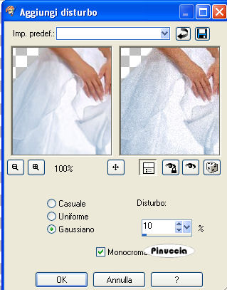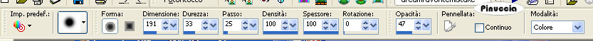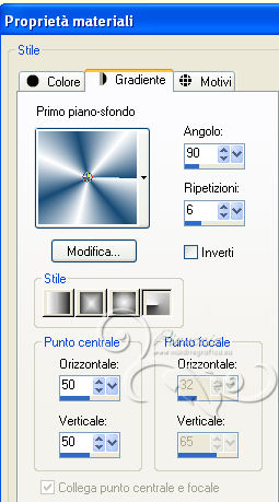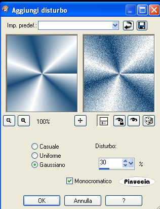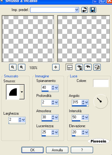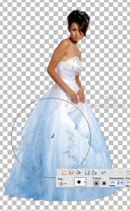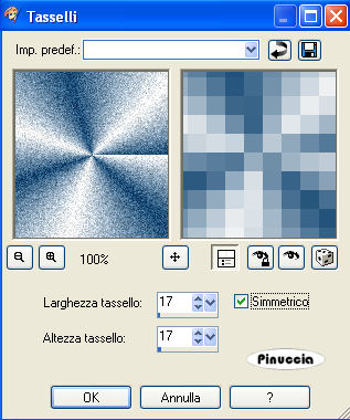 qui puoi trovare qualche risposta ai tuoi dubbi. Se l'argomento che ti interessa non è presente, ti prego di segnalarmelo. Questo tutorial è stato creato con PSP 9. Occorrente: Filtri: Simple qui Greg's Factory Output 2 qui Materiale qui 1. Imposta il colore di primo piano con il colore bianco #ffffff. 2. Imposta il colore di sfondo con #174a75. 3. Passa il colore di primo piano a Gradiente di primo piano/sfondo, Stile Radiale. ![]() 4. Apri una nuova immagine trasparente 640x480 pixels. 5. Riempi l'immagine con il gradiente.6. Regola>Aggiungi/Rimuovi disturbo>Aggiungi disturbo: ![]() 7.Effetti>Effetti di distorsione>Tasselli: ![]() 8. Regola>Sfocatura>Media: ![]() 9. Regola>Aggiungi/Rimuovi disturbo>Aggiungi disturbo, con i settaggi precedenti. ![]() 10. Livelli>Nuovo livello raster. 11. Riempi il livello con il colore di sfondo.12. Nella paletta dei livelli cambia la modalità di miscelatura di questo livello in Moltiplica. 13. Livelli>Unisci>Unisci visibile. 14. Shift+D per duplicare l'immagine e minimizza il duplicato. 15. Apri il tube KaraT171, Shift+D per duplicarlo e chiudi l'originale. 16. Chiudi il livello del copyright, NON ELIMINARLO. 17. Attiva lo strumento Pennello trasforma in destinazione , con i seguenti settaggi:![]() Passa con il mouse sul vestito per colorarlo, usando il tasto destro per applicare il colore di sfondo. ![]() 18. Livelli>Duplica. 19. Regola>Aggiungi/Rimuovi disturbo>Aggiungi disturbo: ![]() 20. Attiva lo strumento Gomma ![]() ![]() posizionati sul livello duplicato e cancella la parte superiore, lasciando soltando la gonna colorizzata. ![]() 21. Nella paletta dei livelli cambia la modalità di miscelatura in Moltiplica. 22. Livelli>Unisci>Unisci visibile. 23. Immagine>Ridimensiona, a 500 pixels di altezza. 24. Modifica>Copia. Ritorna al tuo lavoro e vai a Modifica>Incolla>Incolla come nuovo livello. 25. Sposta la donna nell'angolo in basso a sinistra.26. Effetti>Effetti 3D>Sfalsa ombra, con i seguenti settaggi, colore nero: ![]() 27. Apri il tube KaraT1354. 28. Modifica>Copia. Torna al tuo lavoro e vai a Modifica>Incolla>Incolla come nuovo livello. 29. Nella paletta dei livelli cambia la modalità di miscelatura in Luminanza (esistente). 30. Livelli>Disponi>Disponi giù. Spostalo nell'angolo in alto a destra.31. Apri il file stairwaymist-rf-pnl. 32. Con la Gomma cancella ogni cosa tranne le scale.33. Modifica>Copia. Torna al tuo lavoro e vai a Modifica>Incolla>Incolla come nuovo livello. 34. Sposta le scale nell'angolo in basso a destra.35. Nella paletta dei livelli cambia la modalità di miscelatura in Luce diffusa. 36. Apri il tube silnic-m195. 37. Immagine>Rifletti. 38. Modifica>Copia. Torna al tuo lavoro e vai a Modifica>Incolla>Incolla come nuovo livello. 39. Nella paletta dei livelli cambia la modalità di miscelatura in Luce diffusa. 40. Trascina il livello dell'uomo sotto quello della donna. Sposta l'uomo nell'angolo in alto a sinistra.41. Livelli>Unisci>Unisci tutto (appiattisci). 42. Immagine>Aggiungi bordatura, 5 pixels, simmetriche, con il colore bianco. 43. Seleziona il bordo con la bacchetta magica ![]() 44. Riempi il bordo con il gradiente.45. Effetti>Plugins>Greg's Factory Output 2 / Pool shadow, con i settaggi standard: ![]() 46. Selezione>Innalza selezione a livello. 47. Livelli>Duplica. 48. Immagine>Rifletti. 49. Selezione>Nessuna selezione. 50. Cancella la linea con il gradiente sul lato sinistro del livello duplicato del bordo.51. Livelli>Unisci>Unisci tutto (appiattisci). 52. Immagine>Aggiungi bordatura, 15 pixels, simmetriche, coln il colore bianco. 53. Selezione>Seleziona tutto. Selezione>Modifica>Contrai di 15 pixels. 54. Selezione>Inverti. 55. Apri il file di sfondo che hai duplicato al passo 14. 56. Effetti>Plugins>Simple>Zoom out and flip. 57. Modifica>Copia. Torna al tuo lavoro e vai Modifica>Incolla>Incolla nella selezione. 58. Effetti>Effetti 3D>Smusso a incasso: ![]() 59. Selezione>Nessuna selezione. 60 Ripeti i passaggi dal 42 al 51. 61. Immagine>Aggiungi bordatura, 2 pixels, simmetriche, con il colore di sfondo. 62. Apri il tube s114 corner2. 63. Modifica>Copia. Torna al tuo lavoro e vai a Modifica>Incolla come nuovo livello. 64. Immagine>Rifletti. 65. Posizionalo nell'angolo superiore sinistro.66. Livelli>Unisci>Unisci tutto appiattisci. 67. Attiva lo strumento Testo , scegli il font English 111 Prewsto BT, dimensione 48, crea come vettore.68. Scrivi "Blue Velvet". 69. Converti in livello raster. 70. Posiziona il testo come nell'esempio.71. Effetti>Effetti 3D>Sfalsa ombra, con i seguenti settaggi, colore nero: ![]() 72. Aggiungi la firma e salva in formato jpg.